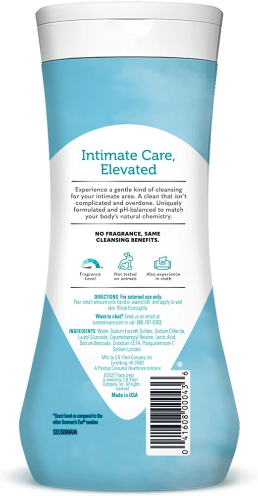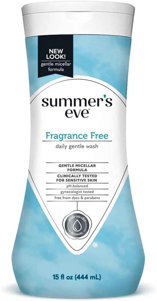 Summer’s Eve Fragrance Free Daily Gentle Feminine Wash removes odor-causing bacteria The micellar water formula creates a gentle cleansing intimate care and feminine body wash that’s clinically tested for sensitive skin Fragrance Free provides the same cleansing benefits with no fragrance and gentle enough for your most delicate skin; under your arms, breasts, and even in your intimate area Summer’s Eve daily gentle feminine wash is gynecologist tested, free from dyes and parabens, and the product is not tested on animals Uniquely formulated and pH balanced to match the intimate area’s natural chemistry Experience a gentle kind of cleansing with micellar water for your intimate area. A clean experience that isn't complicated and overdone. A daily intimate care routine that lets you experience that unique everyday Summer’s Eve readiness. Summer's Eve feminine body wash is created for your most intimate areas to gently cleanse away the bacteria that can cause odor. Uniquely formulated and pH-balanced to match your body's natural chemistry. All Summer's Eve feminine hygiene products are gynecologist tested to ensure they are safe, even for sensitive skin. That’s why millions of women trust our expansive range of gynecologist-tested cleansing and care. Our wide variety of products are made for everybody – whether you’re at home or on the go, want to bask in fragrant lusciousness or no scent at all or want ultra-gentle or high performance. With every Summer’s Eve product you use, know that We See You, We Get You, We Got You. Sunburn Alert: This product contains an alpha hydroxy acid (AHA) that may increase your skin's sensitivity to the sun and particularly the possibility of sunburn. Use a sunscreen, wear protective clothing, and limit sun exposure while using this product and for a week afterwards.