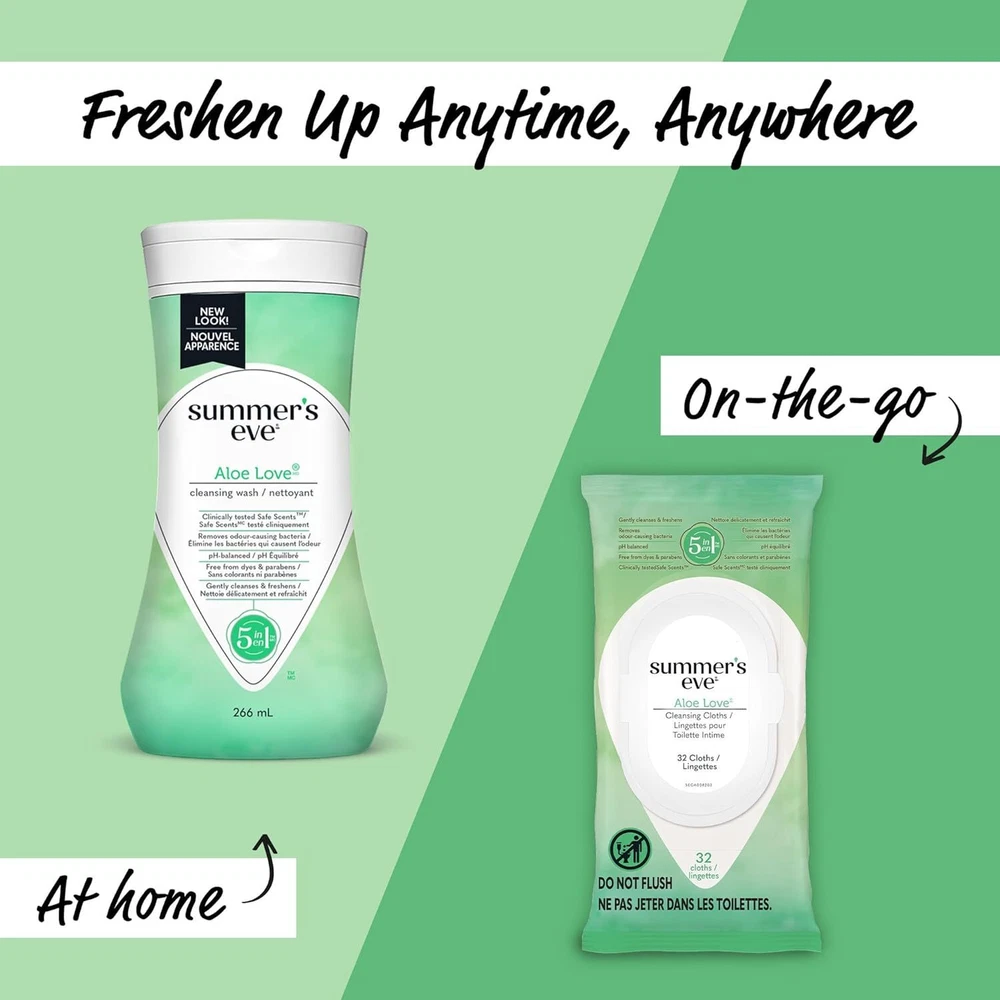 Product Description Summer's Eve Summers Eve Personal Hygiene Cloths Aloe Love, Feminine Cleansing Wipes, 32 Count (Pack Of 12) Experience a gentle kind of cleansing with micellar water for your intimate area. A clean experience that isn't complicated and overdone. A daily intimate care routine that lets you experience that unique everyday Summer’s Eve readiness. Summer's Eve feminine wipes are created for your most intimate areas to gently cleanse away the bacteria that can cause odor. Uniquely formulated and pH-balanced to match your body's natural chemistry. All Summer's Eve feminine hygiene products are gynecologist tested to ensure they are safe, even for sensitive skin. That’s why millions of women trust our expansive range of gynecologist-tested cleansing and care. Our wide variety of products are made for everybody – whether you’re at home or on the go, want to bask in fragrant lusciousness or no scent at all or want ultra-gentle or high performance. With every Summer’s Eve product you use, know that We See You, We Get You, We Got You. GENTLE CLEANSING: Formulated to gently cleanse and remove odor-causing bacteria, these wipes are perfect for daily use. PH BALANCED: Specifically designed to maintain your body’s natural pH balance, promoting overall feminine health. SOOTHING ALOE: Infused with the calming and soothing properties of aloe, these wipes provide a refreshing and comfortable feel. CONVENIENT PACKAGING: Individually wrapped and portable, making them ideal for travel, gym bags, and on-the-go freshness. DERMATOLOGIST AND GYNECOLOGIST TESTED: Safe for everyday use, these wipes are both dermatologist and gynecologist tested to ensure they are gentle on sensitive skin. Summer’s Eve Aloe Love Daily Gentle Feminine Wipes removes odor-causing bacteria The micellar water formula creates a gentle kind of clean that’s clinically tested for your intimate, sensitive skin when you need it most Aloe Love scent is inspired by cool aloe and spring hyacinth and gentle enough for your most delicate skin Summer’s Eve daily gentle feminine wipes are gynecologist tested, free from dyes and parabens, and the product is not tested on animals Uniquely formulated and pH balanced to match your body’s natural chemistry Contains 1 softpack of Summer's Eve Aloe Love Feminine Cleansing Wipes, 32 count each Removes Odor Free From Dyes And Parabens, Gently Cleanses And Freshens, Helps Maintain A Natural Ph Removes Odor-Causing Bacteria, Free From Dyes And Parabens, For sensitive skin. Dermatologist & gynecologist tested Super-convenient Country Of Origin: United States Ingredients Water, Glycerin, Polysorbate 20, Aloe Barbadensis Leaf Juice, Lactic Acid, Sodium Benzoate, Sodium Citrate, Tetrasodium Glutamate Diacetate, Phenoxyethanol, Disodium Capryloamphodiacetate, Sodium Chloride, Fragrance. Inactive Ingredients Water Glycerin Polysorbate 20 Aloe Barbadensis Leaf Juice Lactic Acid Sodium Benzoate Sodium Citrate Tetrasodium Glutamate Diacetate Phenoxyethanol Disodium Capryloamphodiacetate Sodium Chloride Fragrance
