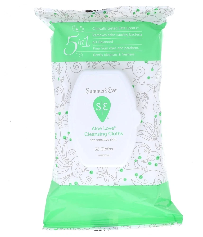Product Description Summer's Eve Summers Eve Personal Hygiene Cloths Aloe Love, Feminine Cleansing Wipes, 32 Count (Pack Of 6) Experience a gentle kind of cleansing with micellar water for your intimate area. A clean experience that isn't complicated and overdone. A daily intimate care routine that lets you experience that unique everyday Summer’s Eve readiness. Summer's Eve feminine wipes are created for your most intimate areas to gently cleanse away the bacteria that can cause odor. Uniquely formulated and pH-balanced to match your body's natural chemistry. All Summer's Eve feminine hygiene products are gynecologist tested to ensure they are safe, even for sensitive skin. That’s why millions of women trust our expansive range of gynecologist-tested cleansing and care. Our wide variety of products are made for everybody – whether you’re at home or on the go, want to bask in fragrant lusciousness or no scent at all or want ultra-gentle or high performance. With every Summer’s Eve product you use, know that We See You, We Get You, We Got You. GENTLE CLEANSING: Formulated to gently cleanse and remove odor-causing bacteria, these wipes are perfect for daily use. PH BALANCED: Specifically designed to maintain your body’s natural pH balance, promoting overall feminine health. SOOTHING ALOE: Infused with the calming and soothing properties of aloe, these wipes provide a refreshing and comfortable feel. CONVENIENT PACKAGING: Individually wrapped and portable, making them ideal for travel, gym bags, and on-the-go freshness. DERMATOLOGIST AND GYNECOLOGIST TESTED: Safe for everyday use, these wipes are both dermatologist and gynecologist tested to ensure they are gentle on sensitive skin. Summer’s Eve Aloe Love Daily Gentle Feminine Wipes removes odor-causing bacteria The micellar water formula creates a gentle kind of clean that’s clinically tested for your intimate, sensitive skin when you need it most Aloe Love scent is inspired by cool aloe and spring hyacinth and gentle enough for your most delicate skin Summer’s Eve daily gentle feminine wipes are gynecologist tested, free from dyes and parabens, and the product is not tested on animals Uniquely formulated and pH balanced to match your body’s natural chemistry Contains 1 softpack of Summer's Eve Aloe Love Feminine Cleansing Wipes, 32 count each Removes Odor Free From Dyes And Parabens, Gently Cleanses And Freshens, Helps Maintain A Natural Ph Removes Odor-Causing Bacteria, Free From Dyes And Parabens, For sensitive skin. Dermatologist & gynecologist tested Super-convenient Country Of Origin: United States Ingredients Water, Glycerin, Polysorbate 20, Aloe Barbadensis Leaf Juice, Lactic Acid, Sodium Benzoate, Sodium Citrate, Tetrasodium Glutamate Diacetate, Phenoxyethanol, Disodium Capryloamphodiacetate, Sodium Chloride, Fragrance. Inactive Ingredients Water Glycerin Polysorbate 20 Aloe Barbadensis Leaf Juice Lactic Acid Sodium Benzoate Sodium Citrate Tetrasodium Glutamate Diacetate Phenoxyethanol Disodium Capryloamphodiacetate Sodium Chloride Fragrance