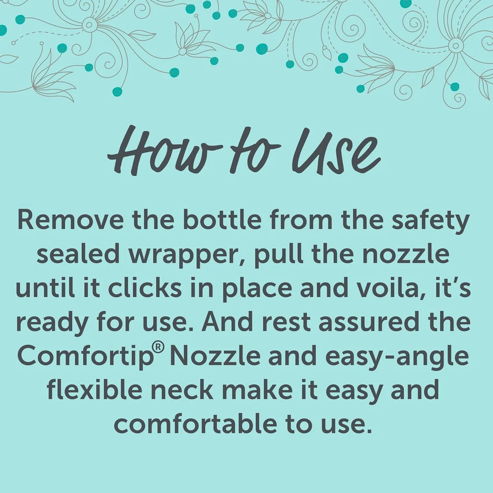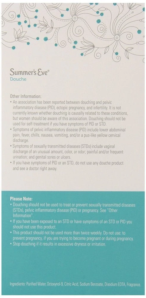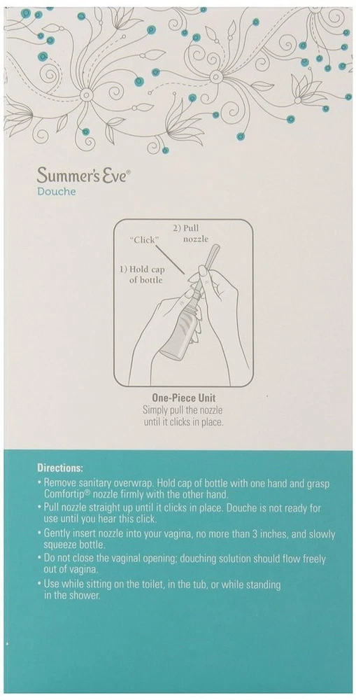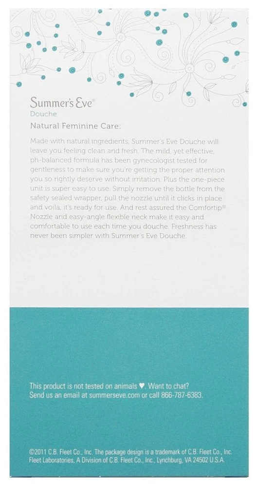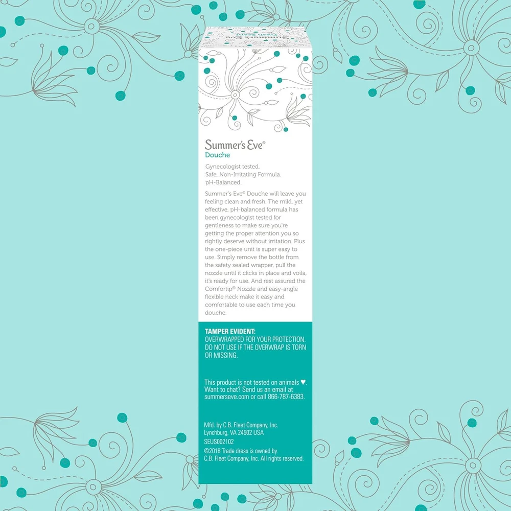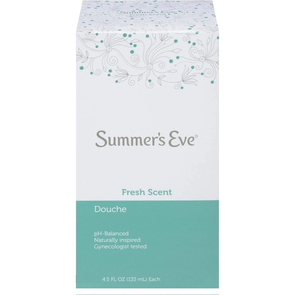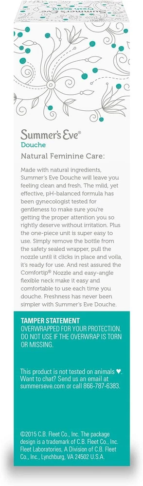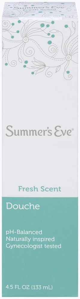 Product Description Summer's Eve Douche Vinegar & Water, Feminine Wash, Cleanser, Fresh Scent, 4.5 Ounce (Pack Of 1) Summer’s Eve Fresh Scent women’s douche helps reduce vaginal odor to leave you feeling fresh and clean | Reduce vaginal odor with this pH-balanced douche that matches the body’s natural chemistry | Minimize vaginal odor and experience an advanced vaginal cleanse after a period, before or after intimacy, or whenever you want a comfortable clean | For convenient feminine care, Summer’s Eve douches are ready-to-use with a soft, flexible nozzle for easy and comfortable use | These douches for women have a light, fresh scent, remove vaginal odor, and are gynecologist-tested, gentle, non-irritating, and not tested on animals | Leaves you feeling clean and fresh | Fresh Scent fragrance | Mild yet effective | pH balanced | Gynecologist tested Summers EVE Douche Fresh Scent 4.5 OZ Summers EVE Douche Fresh Scent 4.5 OZ LEAVE YOU CLEAN AND FRESH. Summerâs Eve Fresh Scent Douche will leave you feeling clean and fresh. GYNECOLOGIST TESTED. The mild, yet effective, pH-balanced formula has been gynecologist tested for gentleness to make sure youâre getting the proper attention you so rightly deserve without irritation. EASY TO USE. Super easy to use, simply remove the bottle from the safety sealed wrapper, pull the nozzle until it clicks in place and voila, it's ready to use. WITH COMFORTIP NOZZLE. And rest assured the Comfortip Nozzle and easy-angle flexible neck make it easy and comfortable to use each time you douche. CONVENIENT SIZE: Packaged in a 4.5 oz bottle, our douche is convenient for use at home or while traveling, providing freshness wherever you go Summer's Eve Feminine Douche will leave you feeling clean and fresh Balanced to a woman's natural pH range Gynecologist-tested, hypoallergenic and free from dyes and parabens Comfort tip Nozzle for ease of use Fresh scent is inspired by crisp evergreens and mountain air Contains 1 box of Summer's Eve Fresh Scent Feminine Douche, 1 unit, 4.5 oz Fresh Scent fragrance Mild yet effective Product Type:Skin Cleaning Agent Item Package Dimension:4.318 Centimetersl X4.826 Centimeters W X18.542 Centimeters H Item Package Weight:0.158 Kilograms Country Of Origin: United States Inactive Ingredients Purified Water, Octoxynol-9, Citric Acid, Sodium Benzoate, Disodium edta, Fragrance. Ingredients essential