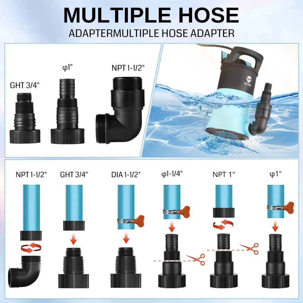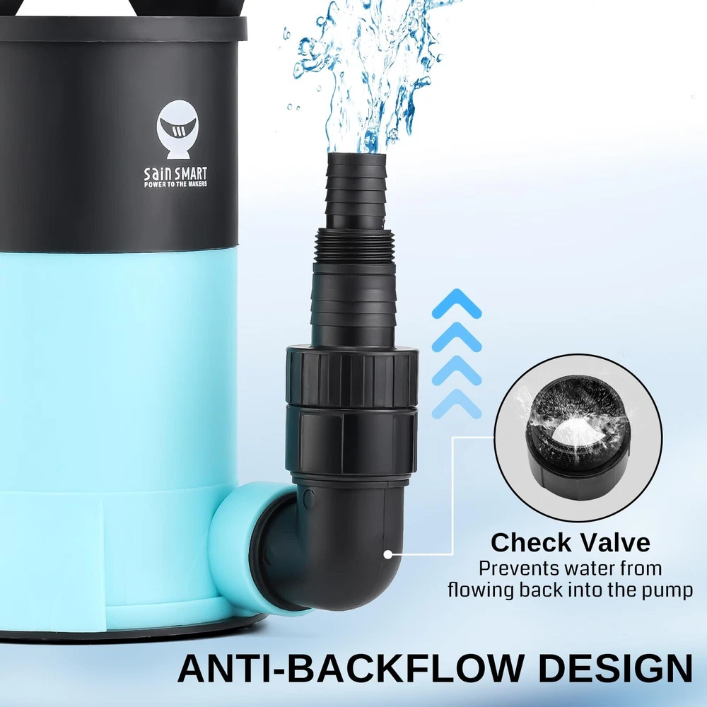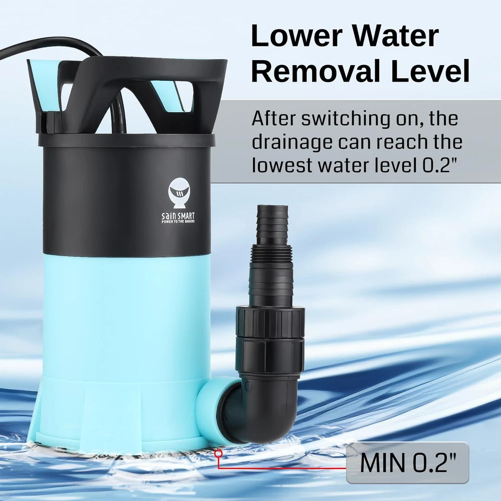 Powerful Flow : SainSsmart sump pump with a 1.15HP power motor drains water at up to 3960 gallons per hour. Featuring a powerful flow rate, it ensures efficient drainage even when the head is increased, and the flow curve drops Wide Applications: 1-1/2'' NPT discharge includes a 1-1/2'' elbow adapter, 3/4'' garden hose adapter, and 1" hose adapter, fitting 3/4'', 1'', 1-1/4'', or 1-1/2'' pipes/garden hoses. It's ideal for clean or dirty water, it’s perfect for draining hot tubs, water heaters, basements, gardening, and car washing High-Quality Materials: The water pump is made of thermoplastic material, reinforcing its durability and corrosion resistance. Equipped with a long power cord, it is easy to use in any corner Safety and Reliability: sump pumps are equipped with all-copper motors with overload and overheat protection to ensure stable performance and safety even after long periods of use Extended Continuous Operation: 850W submersible pump is built to handle prolonged usage without overheating, making it perfect for large-scale drainage tasks