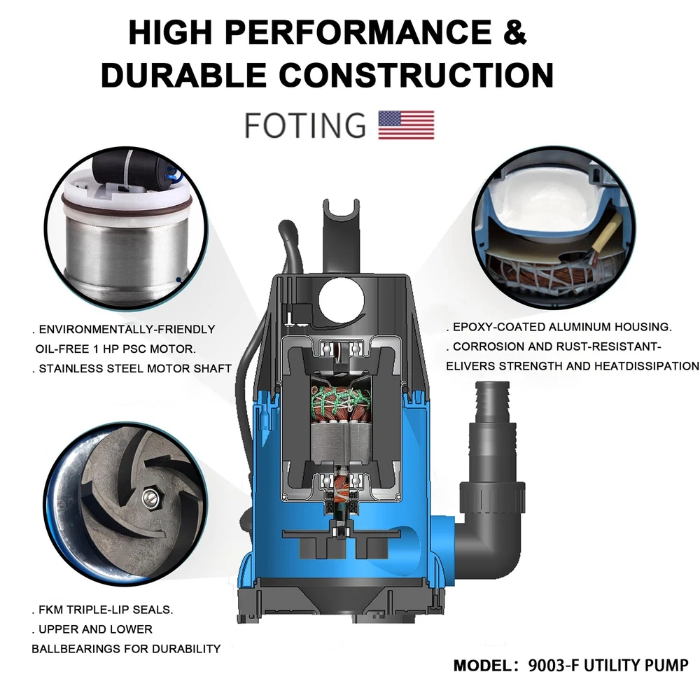 1HP 900W 3960GPH Electric Submersible Pump Portable Sump Pumps submersible water pump is great for draining garden pond, water tanks, pools, hot tubs, flooded areas, etc. It will be a necessary tool for every house. is a professional manufacturer of water pump over 20 years, committed to providing different kinds of pumps with excellent quality all over the world. We set up total quality managenment not only incoming inspection, 100% in-process audit by automatic machines, and final products testing but also the FFU test to customer's request. "Quality, Service and Reputation" are the principle of our culture, which make our products more competitive and outstanding on the market. Specifications: Horsepower: 1 HP Max Flow: : 3960 GPH Max. pump Height: 31 Feet Max. submersion Depth: 23 Feet Cable Length: 25 FeetVoltage/ Frequency: 115V/60 HZ NOTICE: Don't use the pump for any salt water, chemical or acid liquid, it may reduce the lifetime of pump. Package includes: 1 x submersible utility pump 1 x hose adapter 1 x detailed manual instructions EFFICIENT DRAINAGE: Utility pump with 1HP power motor for Draining water up to 4600 GPH( 76 GPM) at 5ft. Lift water up to 31ft of vertical height. Removing water to 1/5" of the surface. PORTABLE PUMP: Plug in to play while unplug to stop. Sump pump filters debris and removes water down to 1/5 inch from the surface. Handle up to 1/5″solids , ideal for pool pond draining hot tub and flooded basement window wells 4 DETAILS: 25FT power cord for greater range of use;Removable bottom easy to clean and maintain pump life; Rounded handle prevents cuts and comfortable to use;Thermoplastic housing for corrosion resistant and durable. QUICK TO CONNECT: Comes with a NPT 1-1/2" discharge size, a NPT 3/4" garden hose adapter and a hose adapter fits Ф1-1/2", Ф1" or NPT 1" inch hose. You can use different sizes of hoses depending on the flow ENERGY SAVING & SAFETY: Follows UL 778&746C standards for safety and 100% manufacturer tested, low noise and energy saving. Built-in automatic thermal overload protects the motor from burning out when dry running -AFTER SERVICE: Comes with 3-year after-sale service, Any inquiries or problems please feel free to contact our service team, there will be help for any concerns within 24 hours TIPS: Before using the pump, please submerge the pump into the water at an angle to allow any trapped air to escape