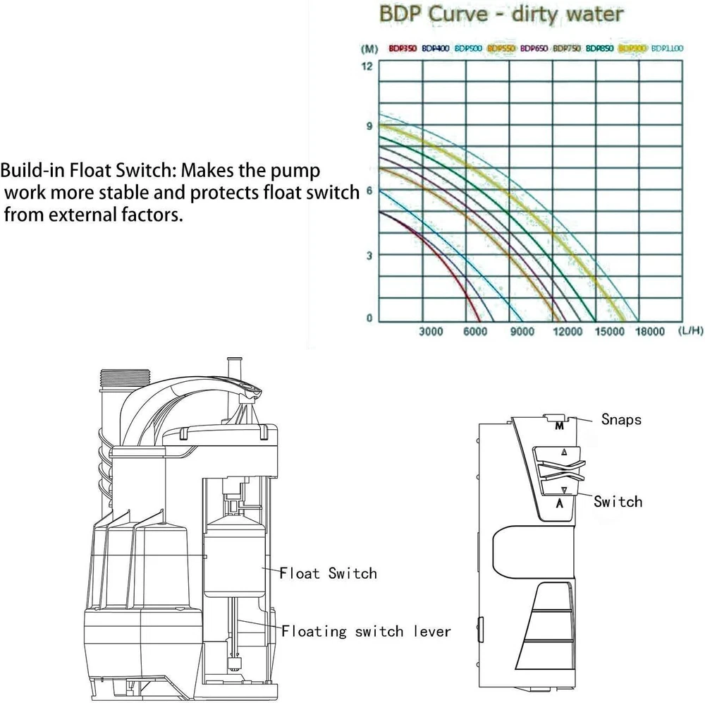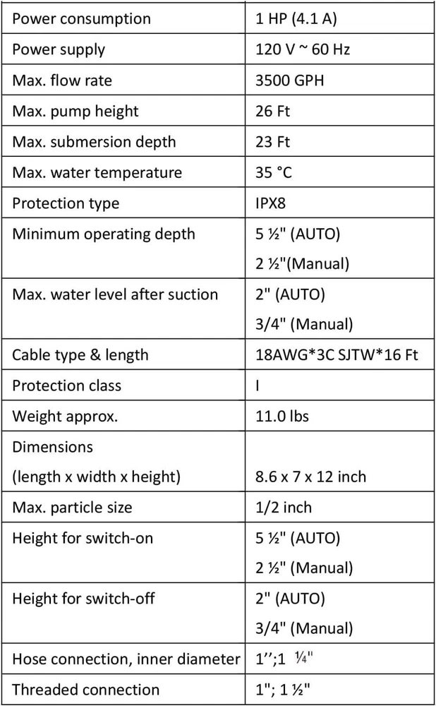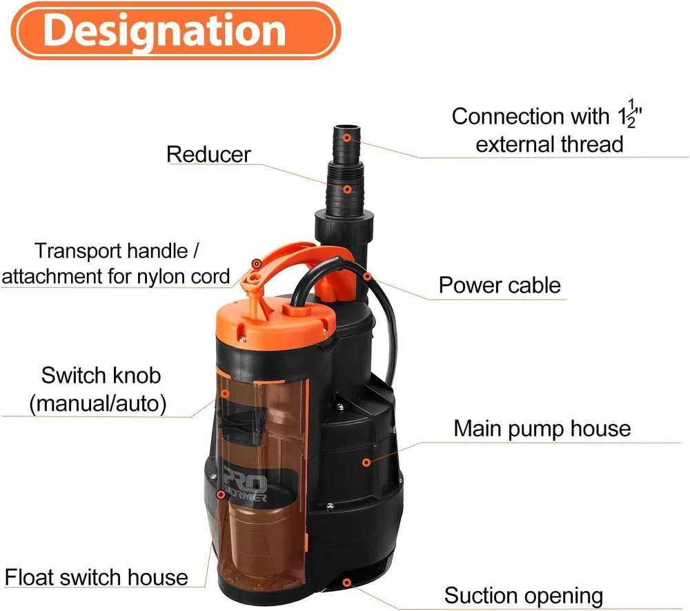 You may also like AAutomatic Fuel Transfer Pump AA Battery Powered Gas Pump W/ Quick Flow Control 54.0 USD 56.84 USD Free shipping 5% off 12V Water Pressure Diaphragm Pump Self-Priming Pump 55 PSI 3.5 GPM for Boat RV 50.6 USD 53.26 USD Free shipping 5% off Sump Pump, 3500 GPH 1HP Submersible Clean/Dirty Water Pump with Build-in Float Switch for Pool, Pond, Garden, Flooded Cellar and Irrigation Material Thermoplastic Style 1HP Product Dimensions 14"L x 9"W x 8"H Power Source ac Item Weight 10 Pounds Maximum Flow Rate 58.33 Gallons Per Minute Maximum Lifting Height 26 Feet Voltage 120 Volts (AC) About this item đ„ăKindly Tip 1ăWhen you start use the pump you must be submerged into the water at a slight angle to allowthe remaining air to escape. đ„ăKindly Tip 2ăThe device is not suitable for continuous operation (e.g.as recirculation pump for ponds). This type of use will substantially shorten the pump's life expectancy. đ„ă1HP High PowerăSump Pump uses 1HP power, which is more efficient than ordinary 3/4HP sump pump; Max 3500GPH rating tackles any draining job at a fraction of the time. đ„ăMulti Outlet Sizesă3 different diameters outlets (1 inch ,1-1/4 inch, 1-1/2 inch) to adapte for different size hoses as needed according to the flow rate. The bigger the flow is, the wider the outlet should be. đ„ăManual ModeăSet the switch to the MANUAL positon the pump will now not automatically switch off but carry out pumping, even if theremaining water level is reached and the pump runs dry. You should cut off the power immediately to prevent the coil from getting burned. đ„ăAutomated ModeăSet the switch to the AUTO position. Once you have plugged the device into the socket, the pump will switch on automatically when the water exceeds the start-level and switch off when the stop-level hasbeen obtained. this means that the pump can be left on at all times and will keep the waterin a cellar or boat, for example, at the required level. bear in mind that this pump is notdesigned to be used continuously, it must be switched off at regular intervals. đ„ăSealing Structure & Durable ConstructionăThe sump pump features a durable sealing structure and the durable thermoplastic body keeps the pump from corrosion. The higher base plate which assures the prevention of debris collection in the sump pit.