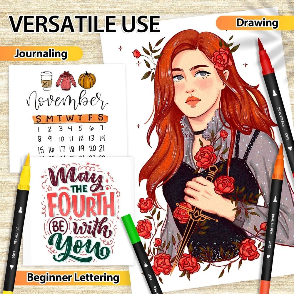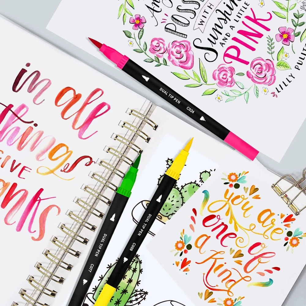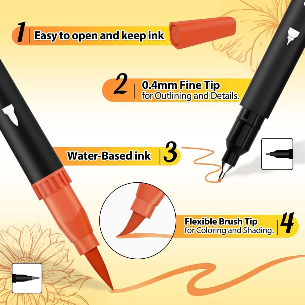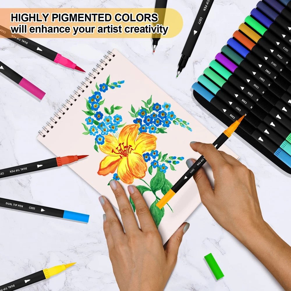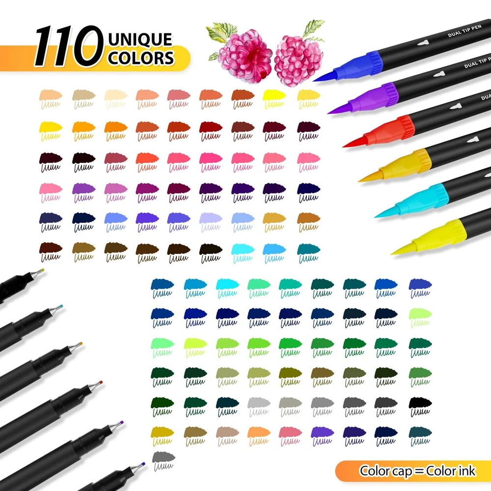 【CONVENIENT, DUAL-POINT MARKERS】This double-end pen can stimulate your imagination and creativity. 0.4mm fine tip is great for sketch outlining & details; 1-4mm soft brush tip for shading and quickly color in large areas art project. Double Tips, Double Fun! 【VIBRANT COLORS】You'll never run out of possibilities or color options with this deluxe coloring markers set. Each set Includes 110 numbered Variety of colors, NO duplicate. And blend beautifully for added dimension to your artwork, and create one you never have before 【SMOOTH & HIGH QUALITY】With water-based, nicely pigmented ink, You can bring rich colors to your artistic creativity. Special fiber tip is easy to layer and mix colors without worrying about smudges. Perfect for coloring books, sketch, illustrations, planner, notebook, calendar, signing art project and more! 【WELL PACKED & GREAT GIFT】Our brush pens are packed in a PORTABLE STORAGE CASE which have pen slots to organize all your colors. Convenient to store in backpack or take outside. All you need is to gift one set of dual pens at Christmas, Valentines day, graduations, birthdays or New Year. 【BRAND SERVICE】The water-based ink is ACID-FREE & NON-TOXIC. No need to worry about ink getting on your skin again. If there has any situation with our dual brush markers of inoperable, damaged, please contact us.