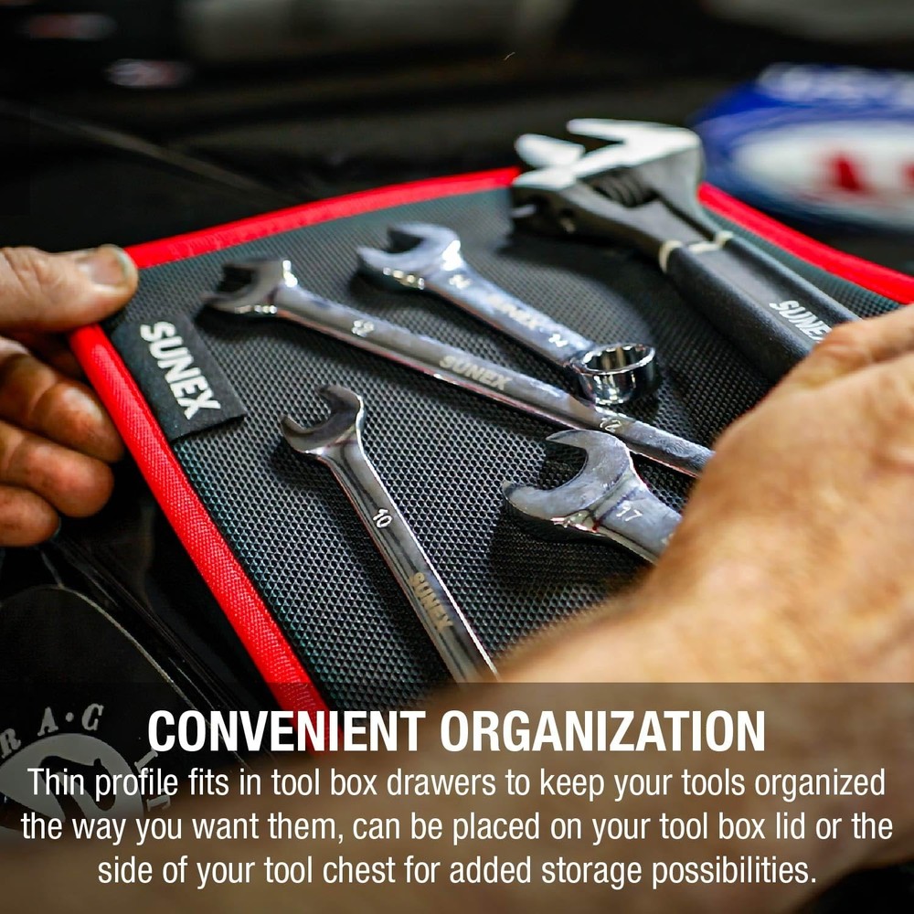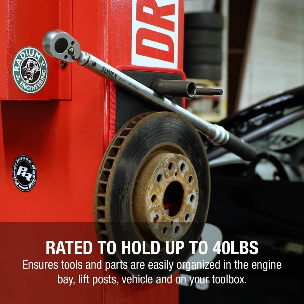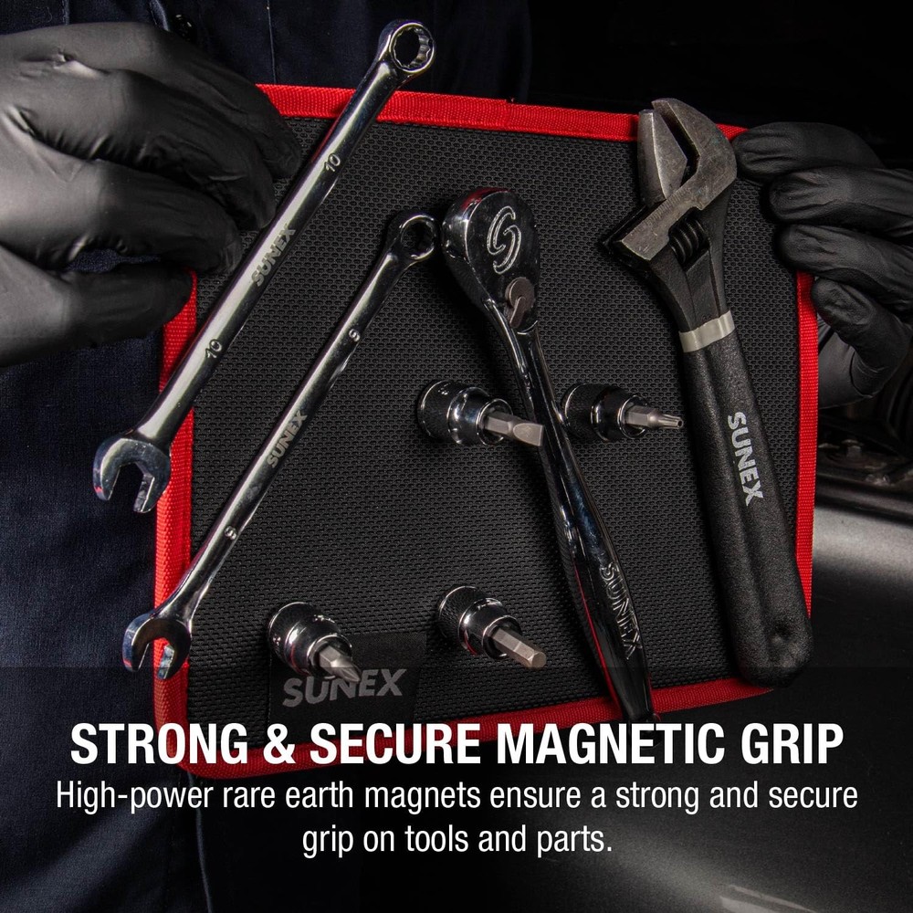 Sunex SXMAGMAT Flexible Magnetic Mat/Organizer, 8"x10", 8\" x 10\", Black Product Details STRONG & SECURE MAGNETIC GRIP: High-power rare earth magnets ensure a strong and secure grip on tools and parts. RATED TO HOLD UP TO 40LBS: Ensures tools and parts are easily organized in the engine bay, lift posts, vehicle and on your toolbox. HIGH QUALITY PVC LAYER: Safeguards surfaces from scratches and damage while being resistant to common shop fluids. FLEXIBLE SHAPE: Thoughtfully constructed to accommodate various applications within an automotive technician's workspace. Sunex SXMAGMAT Flexible Magnetic Mat/Organizer, 8"x10", 40LB Rated Capacity