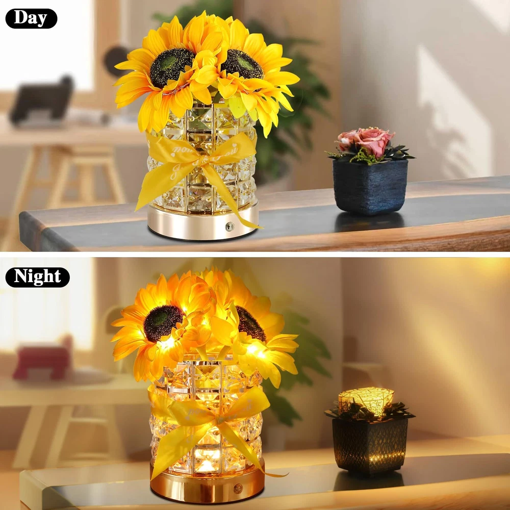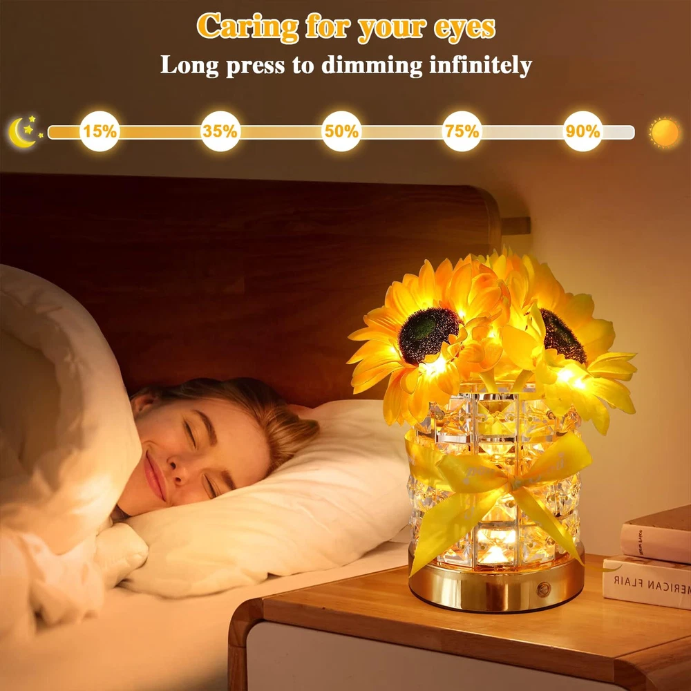 【Perfect Gifts For Mom Women Girls】Sunflower is like a young girl standing in a pavilion, golden petals in the lights seems to be very delicate, the piece of delicate petals like carved with gold, exudes a charming light.This golden, never-fading sunflower will make the perfect gift when combined with a crystal glass lamp!Mom Mothers Day gifts for her,Valentine Day gifts for women. Christmas gifts from daughter,Birthday gifts for teenage girls. Grandma gifts. Romantic Sweet Warm Gifts for her 【Sunflower Bedside Decor lamp】This is an innovative aesthetic lamp! Artificial sunflowers with vase combine the LED lights source of flower bonsai with highly simulated plants, the whole plant is real and natural. When the LED light is turned on, the bright and soft light spreads through the clear crystal vase. Sunflower artificial flower lamp are very suitable for bedrooms, living rooms, study, children's rooms, kitchen, dining table, nightstands, desktop decoration. 【3 colors are adjustable】 This crystal table lamp is available in three colors that can be adjusted, and with the touch of a switch, you can adjust different lights to suit different scenes. White light is good for office, yellow light is good for dating, and warm light is good for night light. 【Stepless Dimmable Bedside Lamp】Cute flower desk lamp use touch switch. Just long press the buttons at the bottom to easily control the lights. You can use it without insertion. Sunflower cordless table lamp have adjustable brightness levels. The lights are soft and not dazzling. They can be used as night light, bedside lamp, ambient light, reading lights, and nursy lights. It is an excellent to your home decoration. 【Creative Eternal Sunflower Gift】Sunflower symbolizes hope, light and enthusiasm. If you are looking for a special gift, then our sunflower lamp will not disappoint you. Eternal sunflower flower lamp are given to Mom, Dad, grandma, wife, , girlfriend, sisters, friends cute gifts. Those love and blessings that have not been said, Sunflower table lamp will help you convey