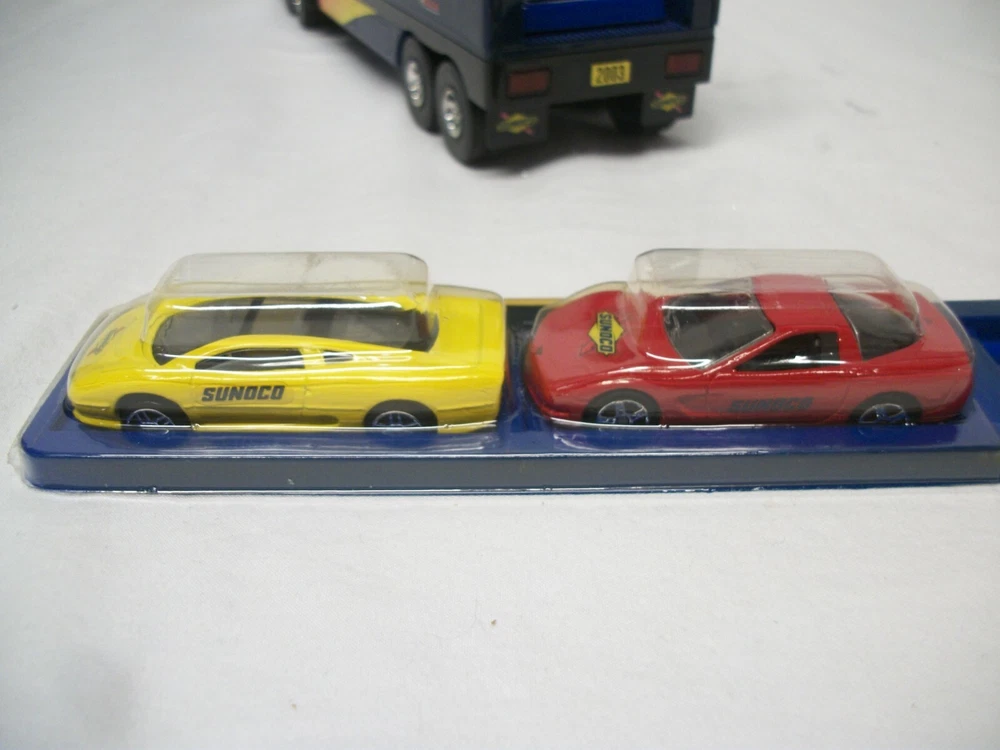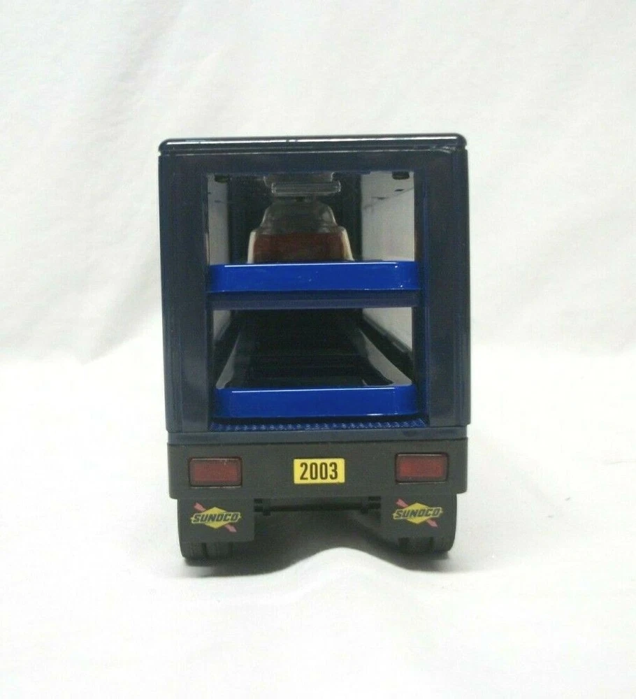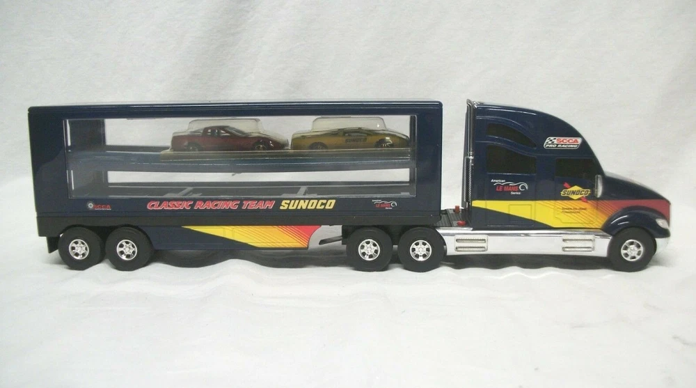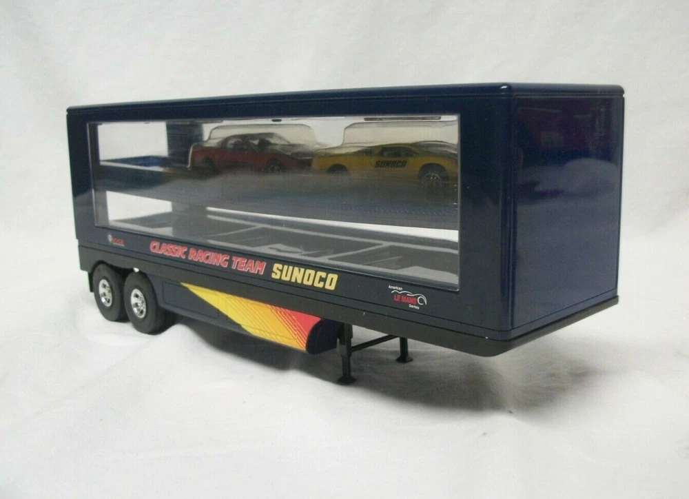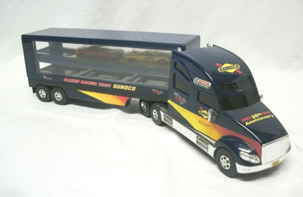 This listing is for an open and used Sunoco Classic Racing Team 10th Anniversary American Le Mans' Series Car Carrier Semi Toy Vehicle from 2003. This truck is 10th in the series with serial# 103518. It comes with 2 Team Exclusive Racecars. It remains in great condition showing minimal signs of handling or wear. No back gate is present but there are 2 "trays" that store cars that slide in and out. This item has lights and sounds, but I was unable to get the sound working properly. The lights operate as expected. It measures 16" long, is 2.75" wide and stands close to 4.5" tall.