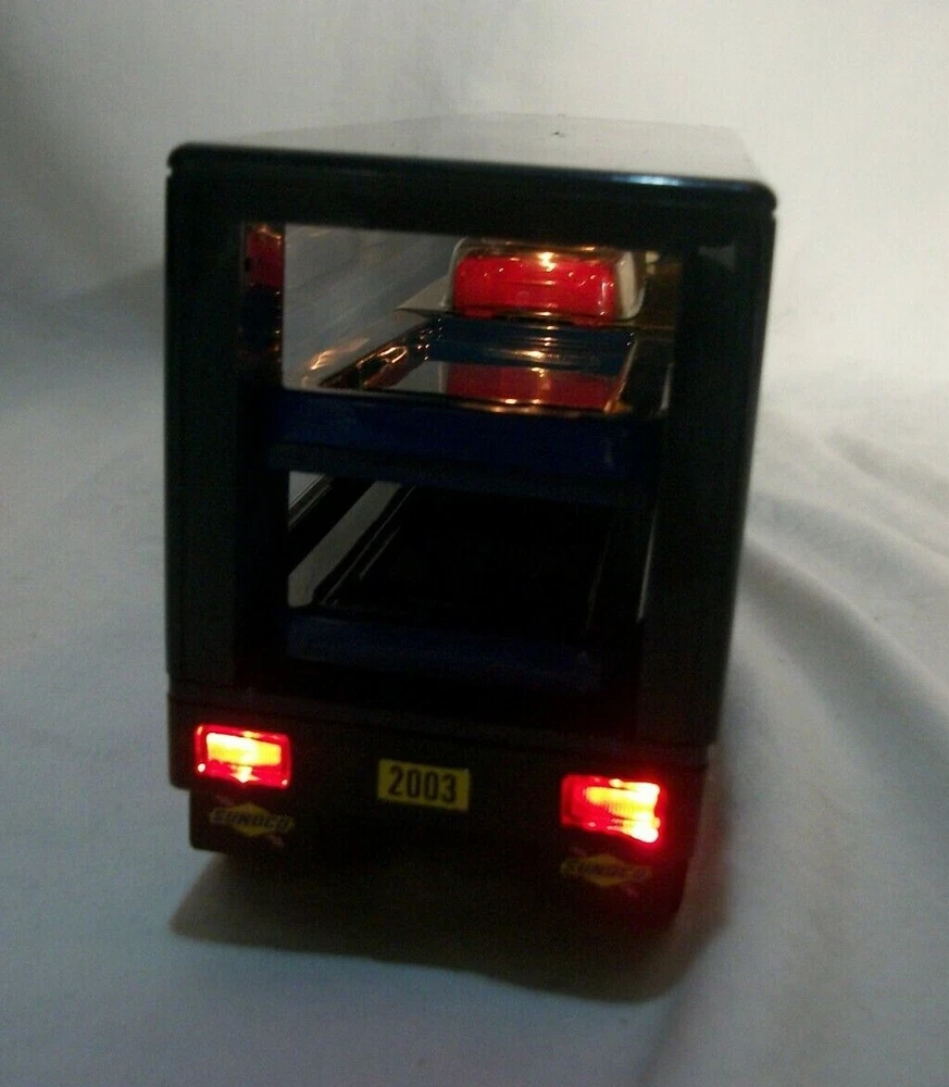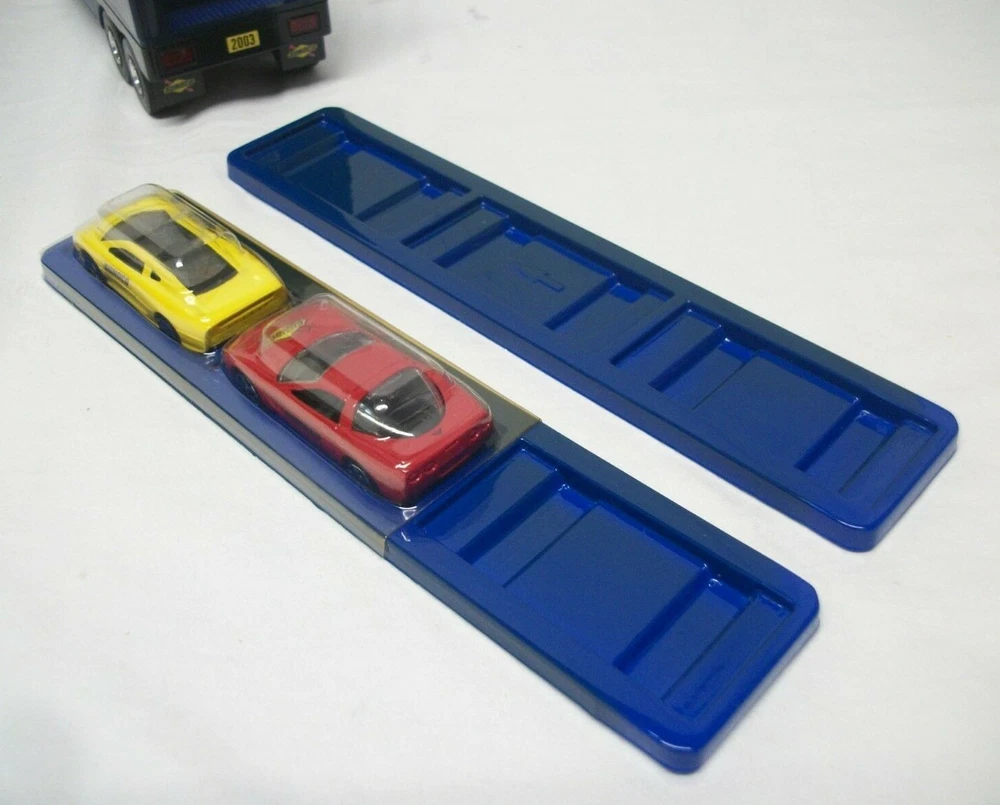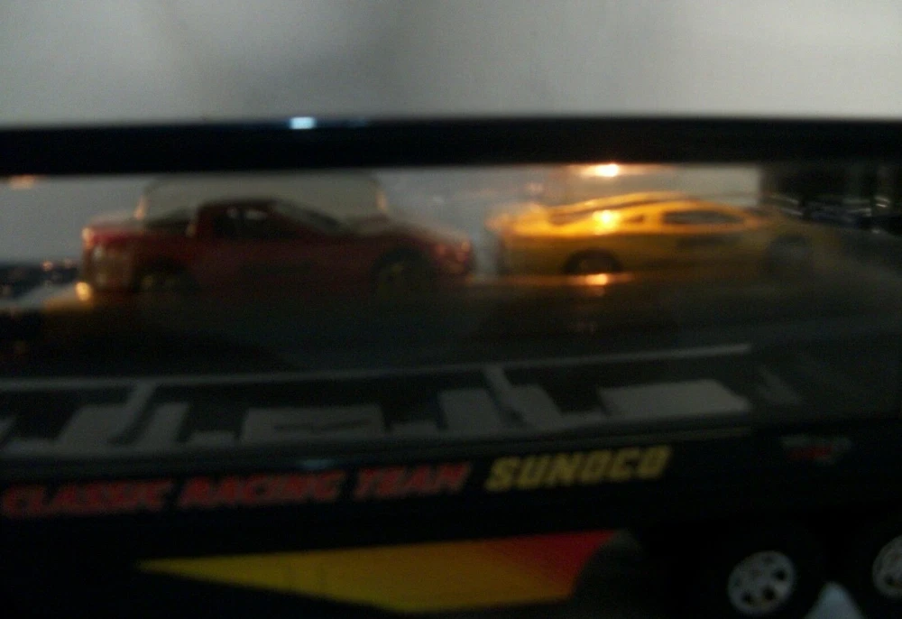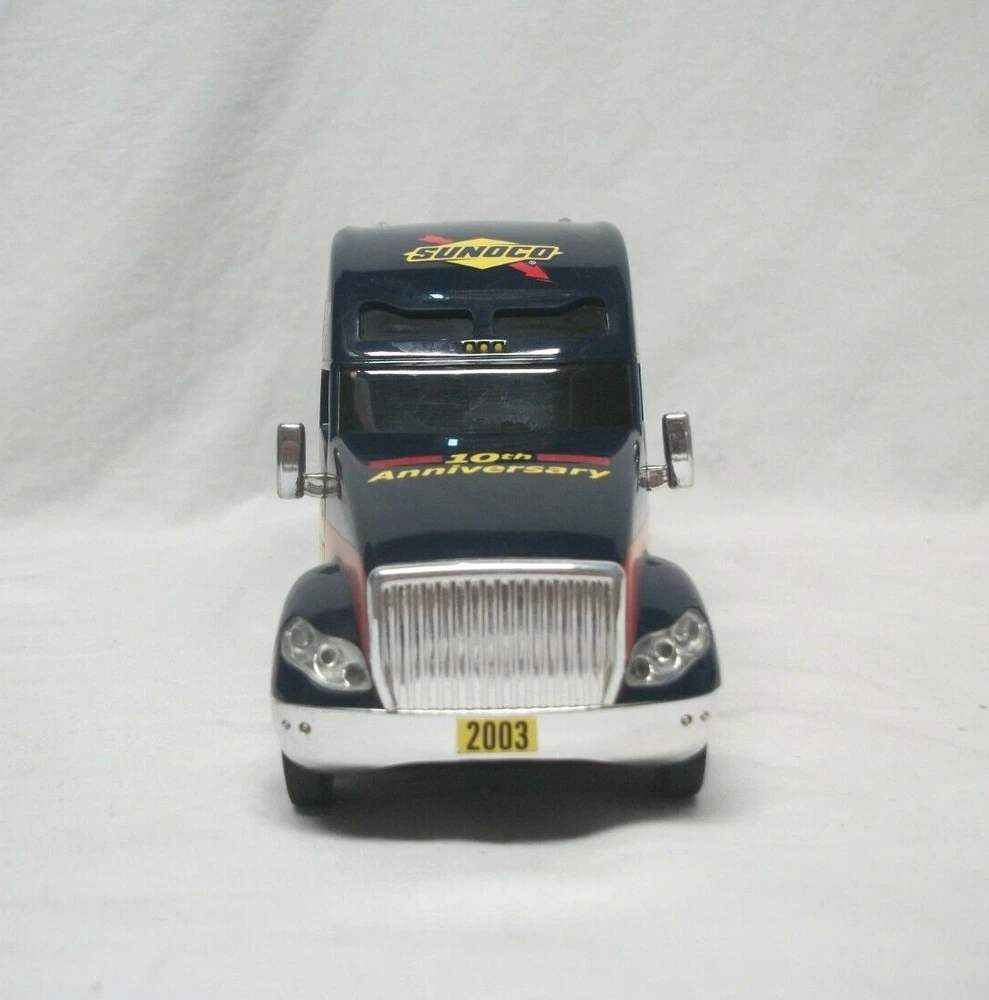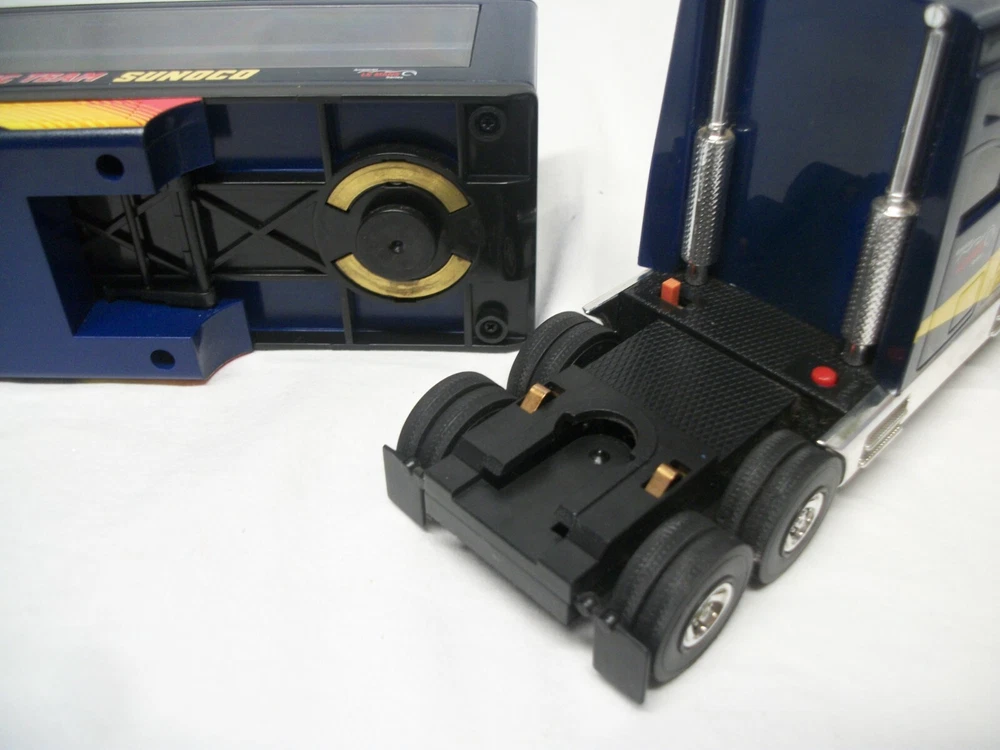This listing is for an open and used Sunoco Classic Racing Team 10th Anniversary American Le Mans' Series Car Carrier Semi Toy Vehicle from 2003. This truck is 10th in the series with serial# 103518. It comes with 2 Team Exclusive Racecars. It remains in great condition showing minimal signs of handling or wear. No back gate is present but there are 2 "trays" that store cars that slide in and out. This item has lights and sounds, but I was unable to get the sound working properly. The lights operate as expected. It measures 16" long, is 2.75" wide and stands close to 4.5" tall.