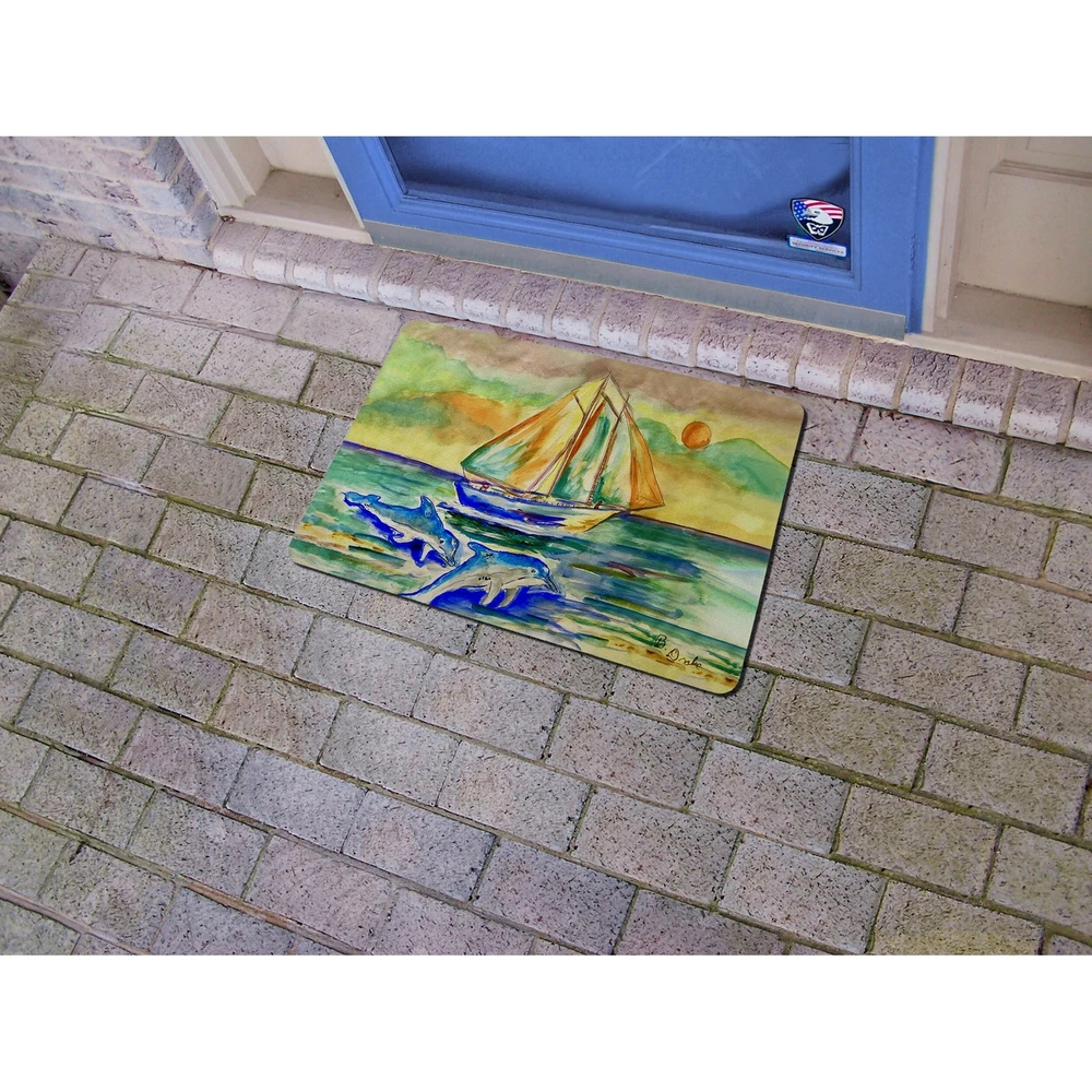 These decorative floor mats are made with a synthetic, low pile washable material that will stand up to years of wear. They have a non-slip rubber backing and feature art made by artists Dick Hamilton and Betsy Drake of Betsy Drake Interiors. All of our items are made in the USA. Our small door mats measure 18x26 and our larger mats measure 30x50. Enjoy a colorful design that will last for years to come. Free Shipping Over $49.99* Details Sunset Sailing Door Mat - 18x26 Product Description: These decorative floor mats are made with a synthetic, low pile washable material that will stand up to years of wear. They have a non-slip rubber backing and feature art made by artists Dick Hamilton and Betsy Drake of Betsy Drake Interiors. All of our items are made in the USA. Our small door mats measure 18x26 and our larger mats measure 30x50. Enjoy a colorful design that will last for years to come.