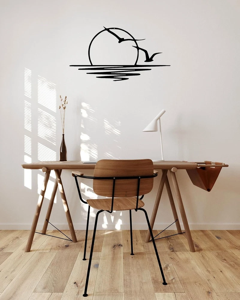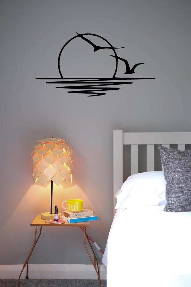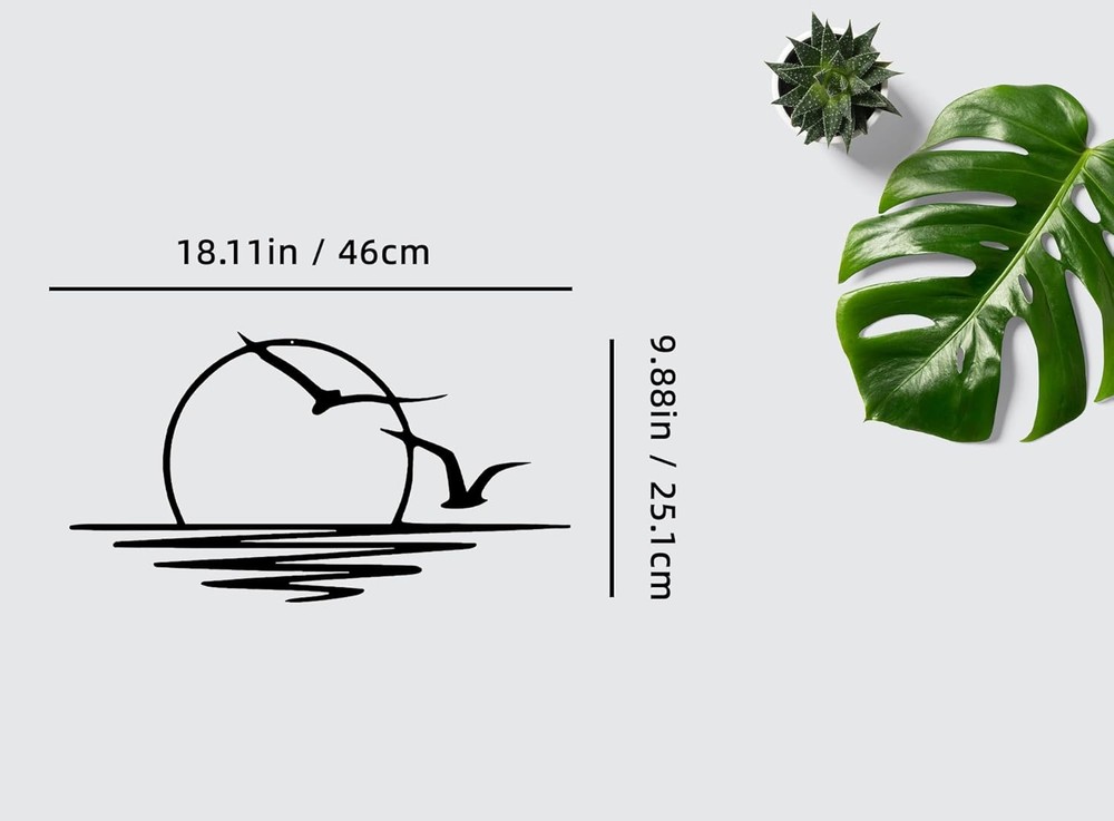 Sun Metal Wall Art Abstract Sunset with Seagulls Metal Wall Decor Minimalist Sunrise Line Art for Living Room Kitchen Bathroom Indoor Outdoor Product Details Product Dimensions: 18.11 x 9.88 x 0.2 inches Item Weight: 4.8 ounces Manufacturer: Benziso EXQUISITE DESIGN: the tropical wall decor incorporates an appealing sunrise design that exudes calm and serenity; This piece can be applied in a wide range of scenarios such as decorating your living room, bedroom, or office space; The sunrise elements in the design add a touch of nature, creating a tranquil atmosphere in the room DURABLE MATERIAL: The metal wall art is made of painted metal material, not easy to break, corrode or fade, no bad smell and reliable to use, the side and edge contact is smooth, without burr or sawdust WATER & FADE RESISTANCE: Powder coated iron are more durable, high-grade black coating makes it not easily fade,to protect against rust or damage, making them suitable for indoor or outdoor use. EASY TO HANG: The black tropical themed metal home decoration with hollowed design is lightweight to hold, and you can directly hang it with nails, easy to install and convenient to remove INDOOR & OUTDOOR DECOR: This iron-crafted wall art is a versatile piece that is suitable for both indoor and outdoor embellishment. Whether positioned on your patio, in your living room, bedroom, bathroom, or kitchen, it injects a stimulating tropical vibe Benziso Metal sunset with seagulls decorative wall hanging art sculpture1. Easy to hangMetal wall art is predrilled with holes,and you can use some nails (not included) to fix it on the wall, which is convenient and usagesThe decorative sign is nice for decorating your home walls and mantels as well as outside, suitable for front doors,patio, eaves, pool areas, barns, workshops, gates, and more, letting your home charming and eye-catching.3. Water& Fade ResistancePowder coated iron are more durable,high-grade black coating makes it not easily fade,to protect against rust or damage, making them suitable for indoor or outdoor use.SpecificationColor: BlackSize: 9.88 X 18.11 inch / 25.1 x 46 cmMaterial: MetalType: Hanging DecorationNotice:Manual measurement, please allow slight errors on may be slightly deformed due to transportation, please adjust by hand to the best condition.There may be some pointed parts, please pay attention to keep away from children.