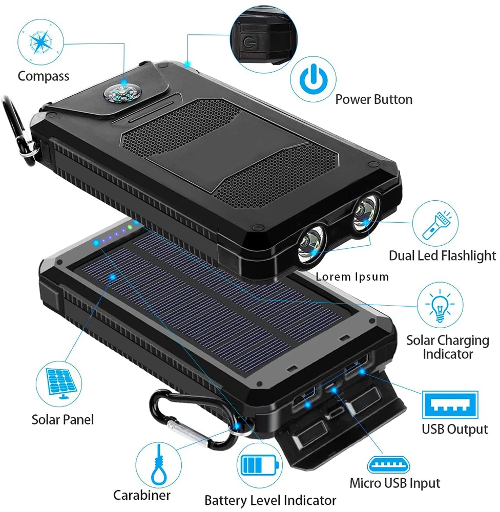 MPN:Does Not ApplyEAN:dose not applyItem Width:7.8cm /3.07inchItems Included:Charging Cable, Solar Power BankFeatures:Anti-Fingerprint, Anti-Scratch, Case Friendly, Heavy Duty, Non-Slip, Reusable, Rugged, Shockproof, Solar Charger, Storage Compartment, Tinted, Water-Resistant, With Lighting, with Compass, With Dual LightsCable Length:1 ftgtin13:dose not applyBundle Description:1 x Solar Power Charger 1 x USB Charger CableWireless Charging Standard:USBCompatible Model:UniversalCustom Bundle:YesUPC:dose not applyType:Solar Power ChargerNumber of Ports:3Theme:ModernBrand:UnbrandedConnectivity:Dual USB, Micro USB, Solar Power, USBManufacturer Warranty:YesDesign/Finish:Hybrid, Metallic, RuggedItem Weight:280g / 9.87ozMaterial:ABS + SiliconeCompatible Brand:Universal, For Apple, For Google, For HTC, For Lenovo, For LG, For Motorola, For Nokia, For OnePlus, For OPPO, For Samsung, For Sony, For Xiaomi, For ZTEItem Length:14cm / 5.51inchItem Height:2cm / 0.78inchPower Capacity:10000000mAhVoltage:5 V