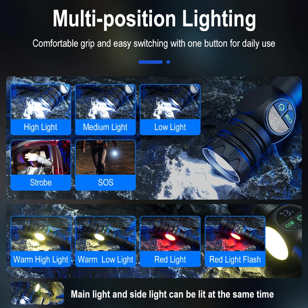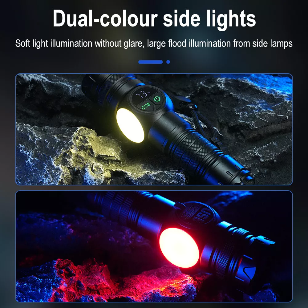 Product Description: Material: High-quality aviation-grade aluminum alloy material + convex lens lens, anti-rust and anti-fall, long service life. Process: The surface is hard oxidized, wear-resistant, not scratched, and feels good. Design: The strong magnetic design at the tail of the flashlight can be adsorbed to any iron object, freeing hands. Charging Method: Smart USB charging, compatible with a variety of charging methods, can be used in computers, vehicles, charging plugs, etc., and can also be used as a mobile power source for emergency charging of electronic products when necessary. Use Battery: The internal wiring of this product adopts a high-efficiency booster circuit to maximize the use of the battery. You can use 1 3.7V rechargeable battery, or you can use 3 AAA batteries, you can choose according to your preference. Power Display: LED power display the power consumption jumps and decreases in turn, the LED flashes when charging, and the LED is fully on when fully charged. Lighting Method: Level 5 main light: super bright, strong light, medium, SOS, strobe 4-level COB light: white light strong light / white light weak light / red light strong light / red light flashing Any gear, long press to turn off Suitable for: Hiking, camping, self-defense, teaching, searching, hunting, daily carry, night riding, caving, night fishing, patrol and various outdoor activities. Specification: Colour: Black Lamp beads: LED+COB LED Power: 20W Lumen: 10000LM Charging method: Type-C charging Use battery: 3*AAA battery(NOT included) /1x 3.7V Battery(included) Zoom mode: telescopic zoom Maximum range: 200-500 meters Waterproof grade: IPX4 Size: 6.69*1.65*1.37 inch Gross weight: 217g Type of Packaging: 1* flashlight 1* charging cable 1* battery compartment 1* anti-lost rope 1* battery