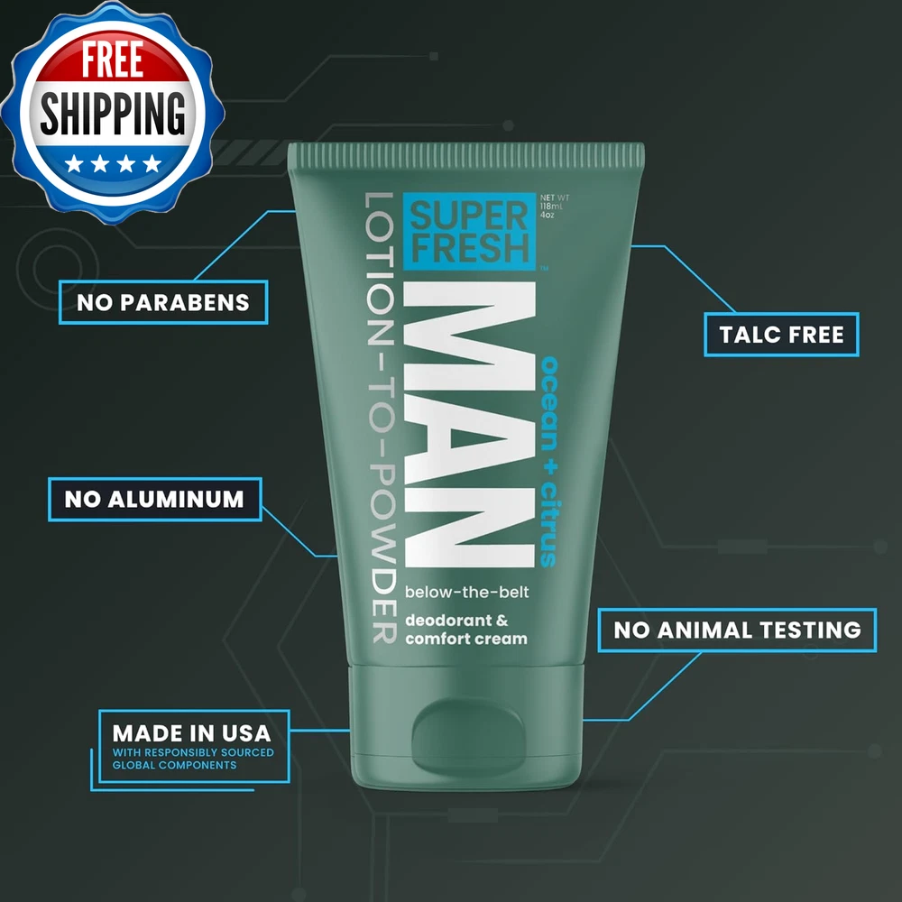 Super Fresh Man Parts Ball Deodorant for Men | POWDER LOTION | Mens Hygiene Cream for Groin, Butt, & Body | Fresh Control Odor, anti Chafing, Stop Itch, Absorb Sweat | Aluminum Free | 4 Oz Tube LIQUID POWDER BALL LOTION & GROIN DEODORANT FOR MEN. Stay fresh, stop groin & butt stickiness, chafe, and odor. Fight odor & itch with the ultimate mens body powder lotion for ball, groin, and backside comfort & freshness. BALL DEODORANT LOTION THAT TURNS TO A BALL DEODORANT POWDER - To keep things fresh and comfy below the belt, simply rub on a pea-sized amount of Super Fresh Man Parts deodorant lotion and watch it dry to a silky layer of crop preserving ball powder. STOP SWAMP CROTCH, ODOR, AND DISCOMFORT | A little goes a long way. Apply Super Fresh ball cream thoroughly, let it dry (very important), then get dressed. Dries fast to a smooth powdery finish. Great for fighting odor, jock itch, pinching, stickiness, and absorbing mild ball sweat. MENS BALL DEODORANT W/ NATURAL INGREDIENTS | SAFE FOR WHOLE BODY | NO talc, NO aluminum, NO parabens, & NO animal testing. Made with oat flour, arrowroot, witch hazel, kaolin clay, and organic aloe. ENJOY FRESHNESS WHERE IT COUNTS | Great for man parts, skin folds, butt, & feet. Proudly formulated, filled, and sealed in the U.S.A. Product Description 1 Stop Odor 2 Stay Fresh 3 Stay Confident Other Products from Super & Fresh Co. Add to Cart Add to Cart Add to Cart Add to Cart Add to Cart Add to Cart Add to Cart Customer Reviews 4.3 out of 5 stars 1,763 4.2 out of 5 stars 7,293 3.9 out of 5 stars 10,705 4.1 out of 5 stars 5,624 4.3 out of 5 stars 52 4.2 out of 5 stars 267 4.4 out of 5 stars 144 Price $13.99 $ 13 . 99 $9.99 $ 9 . 99 $9.99 $ 9 . 99 $13.99 $ 13 . 99 $9.99 $ 9 . 99 $9.99 $ 9 . 99 $13.99 $ 13 . 99 Whole Body? ✔ ✔ ✔ ✔ ✔ ✔ ✔ Powder Protection? No - Invisible Finish Yes - Lotion-to-Powder Yes - Lotion-to-Powder No - Invisible Finish No - Invisible Finish No - Invisible Finish No - Invisible Finish Deodorizing? Yes Yes Yes Yes Yes No Yes Chafe Control? No Yes Yes No No Yes No Fragrance: Waterman (Aqua-themed) Waterman (Aqua-themed) Coconut Vanilla Coconut Vanilla Coconut & Vanilla Unscented Arabian Jasmine & Rose Ok for Sensitive Skin ✔ ✔ ✔ ✔ ✔ ✔ ✔ Style Powder Lotion 1 Pack Special Feature Natural Ingredients Country of Origin USA Material Type Free Aluminum Free Item Form Lotion-to-Powder Package Dimensions 7.56 x 5.55 x 2.05 inches; 4.59 ounces Shipping Fast shipping is very important for us. Our standard US shipping service is FREE. Your order will be shipped within 2-3 business days upon full payment received. Your order will be delivered within 2-3 business days after the handling time. We only ship to the confirmed PayPal address. We reserve the right to cancel any order for any reason at any time. We are not responsible for undeliverable addresses. Returns and payment We offer a 30 days return policy from checkout winning date. We allow only PayPal as payment method FeedBack Your feedback very important to us, after you get your package and you are satisfied with our service please leave us positive feedback If you have any problem with your order / any questions please before leave any type of feedback Please visit our eBay store to check out other items for sale! Thank you for shopping at our store.