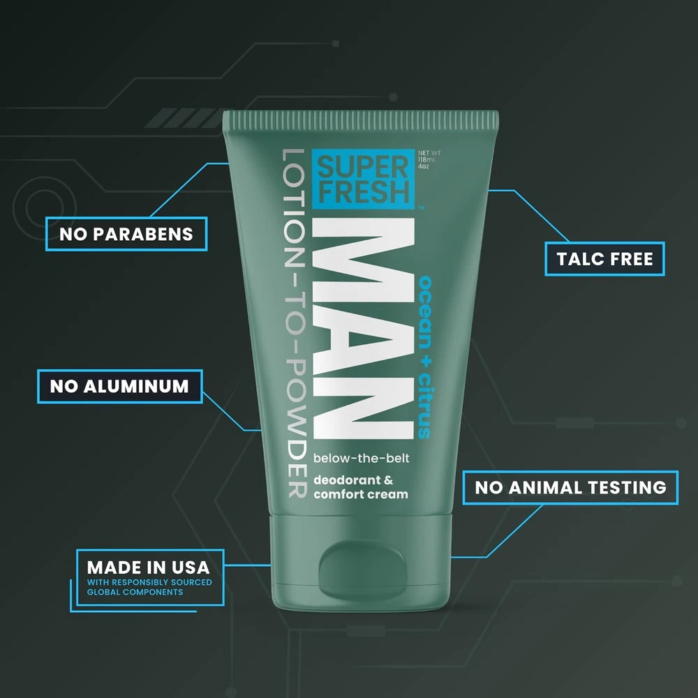 Store New Arrivals Add to Favorite View Feedback Contact Super Fresh Man Parts Ball Deodorant for Men | POWDER LOTION | Mens Hygiene Cream for Groin, Butt, & Body | Fresh Control Odor, anti Chafing, Stop Itch, Absorb Sweat | Aluminum Free | 4 Oz Tube Description Style Powder Lotion 1 Pack Special Feature Natural Ingredients Brand Super & Fresh Co. Country of Origin USA Material Type Free Aluminum Free Item Form Lotion-to-Powder Package Dimensions 7.56 x 5.55 x 2.05 inches; 4.59 ounces Manufacturer Super & Fresh Co. LIQUID POWDER BALL LOTION & GROIN DEODORANT FOR MEN. Stay fresh, stop groin & butt stickiness, chafe, and odor. Fight odor & itch with the ultimate mens body powder lotion for ball, groin, and backside comfort & freshness. BALL DEODORANT LOTION THAT TURNS TO A BALL DEODORANT POWDER - To keep things fresh and comfy below the belt, simply rub on a pea-sized amount of Super Fresh Man Parts deodorant lotion and watch it dry to a silky layer of crop preserving ball powder. STOP SWAMP CROTCH, ODOR, AND DISCOMFORT | A little goes a long way. Apply Super Fresh ball cream thoroughly, let it dry (very important), then get dressed. Dries fast to a smooth powdery finish. Great for fighting odor, jock itch, pinching, stickiness, and absorbing mild ball sweat. MENS BALL DEODORANT W/ NATURAL INGREDIENTS | SAFE FOR WHOLE BODY | NO talc, NO aluminum, NO parabens, & NO animal testing. Made with oat flour, arrowroot, witch hazel, kaolin clay, and organic aloe. ENJOY FRESHNESS WHERE IT COUNTS | Great for man parts, skin folds, butt, & feet. Proudly formulated, filled, and sealed in the U.S.A. Product Description 1 Stop Odor 2 Stay Fresh 3 Stay Confident Other Products from Super & Fresh Co. Add to Cart Add to Cart Add to Cart Add to Cart Add to Cart Add to Cart Add to Cart Customer Reviews 4.3 out of 5 stars 1,769 4.2 out of 5 stars 7,301 3.9 out of 5 stars 10,727 4.1 out of 5 stars 5,629 4.3 out of 5 stars 54 4.2 out of 5 stars 277 4.4 out of 5 stars 146 Price $13.99 $ 13 . 99 $9.99 $ 9 . 99 $9.99 $ 9 . 99 $13.99 $ 13 . 99 $9.99 $ 9 . 99 $9.99 $ 9 . 99 $13.99 $ 13 . 99 Whole Body? ✔ ✔ ✔ ✔ ✔ ✔ ✔ Powder Protection? No - Invisible Finish Yes - Lotion-to-Powder Yes - Lotion-to-Powder No - Invisible Finish No - Invisible Finish No - Invisible Finish No - Invisible Finish Deodorizing? Yes Yes Yes Yes Yes No Yes Chafe Control? No Yes Yes No No Yes No Fragrance: Waterman (Aqua-themed) Waterman (Aqua-themed) Coconut Vanilla Coconut Vanilla Coconut & Vanilla Unscented Arabian Jasmine & Rose Ok for Sensitive Skin ✔ ✔ ✔ ✔ ✔ ✔ ✔ ABOUT US We offer the best prices around on high quality products. Our E-store includes media such as books, movies, music and games while offering electronics, toys, sporting apparel, clothing, tools, general home, garden items and more. SHIPPING We are always working hard to ensure your package arrives as soon as possible. Please understand that some factors like weather, high postal traffic, and the performance of shipping companies are outside of our control. We offer free shipping to the lower 48 states and ship within 2 business days of payment, usually sooner. We do not accept P.O. Boxes. Please provide a physical address. RETURNS We offer a 30-Day Return Policy on items which you are not completely satisfied with. You have the option for a full-refund or an exchange of the item. No returns are available on items shipped outside of the USA. PAYMENT We accept PayPal. CONTACT US This page content is yet to come Please ad us to your favorite seller and visit again later Thank You CUSTOMER SATISFACTION We try our very best to make sure every customer is completely satisfied. If there's a problem, message us! We're happy to help.