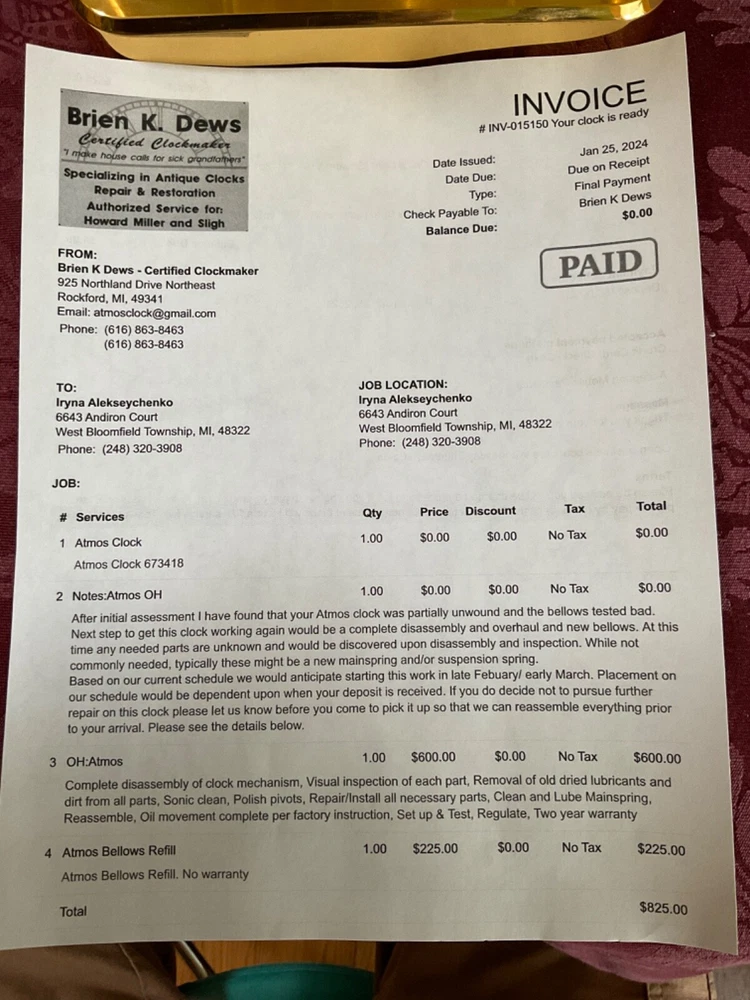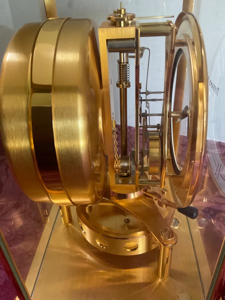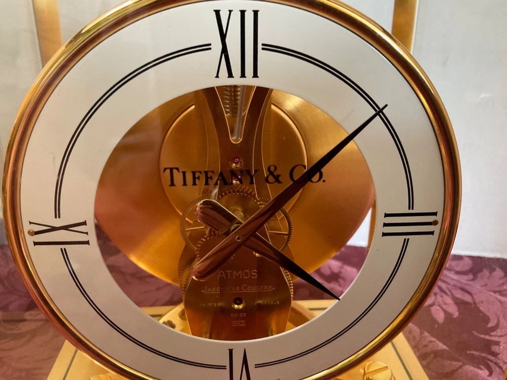 Super Rare -Jaeger LeCoultre ATMOS Clock Retailed by TIFFANY & Co. in like new condition. Recently serviced with 2 year warranty. Invoice pictured and will be included. The 540 Caliber movement with a round type white enamel chapter ring dial, 4 black Roman numerals, that is very rare in the Atmos and Tiffany 540 model, the regular Tiffany models columns are cylindrical. Note: Only one tiny chip on the front glass not visible when closed . Shown on the picture. Keeps precise time . Please understand that you are buying a Atmos clock, the Atmos clocks do not keep perfect time like the modern quartz clocks. After shipping, the Atmos clock not required any adjustment. If you move the Atmos clock from one room to the other, Please make sure to lock the balance wheel before doing any moving. Please exam pictures as part of the description to make sure item you’re interested in meet your criteria. You will get exactly what you see. Thank you.