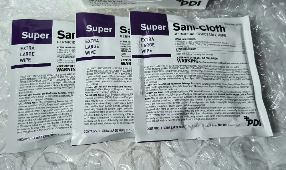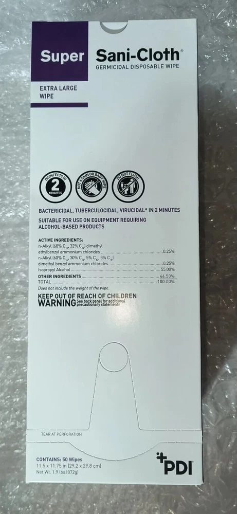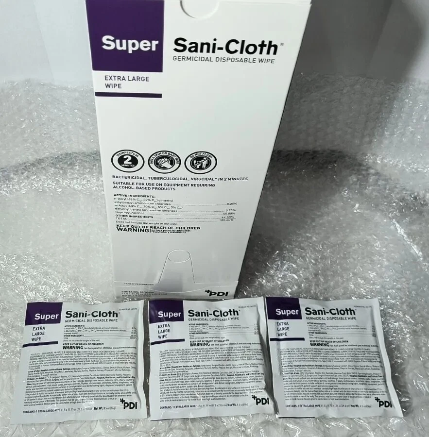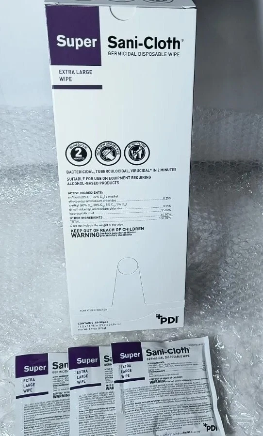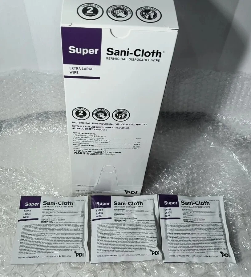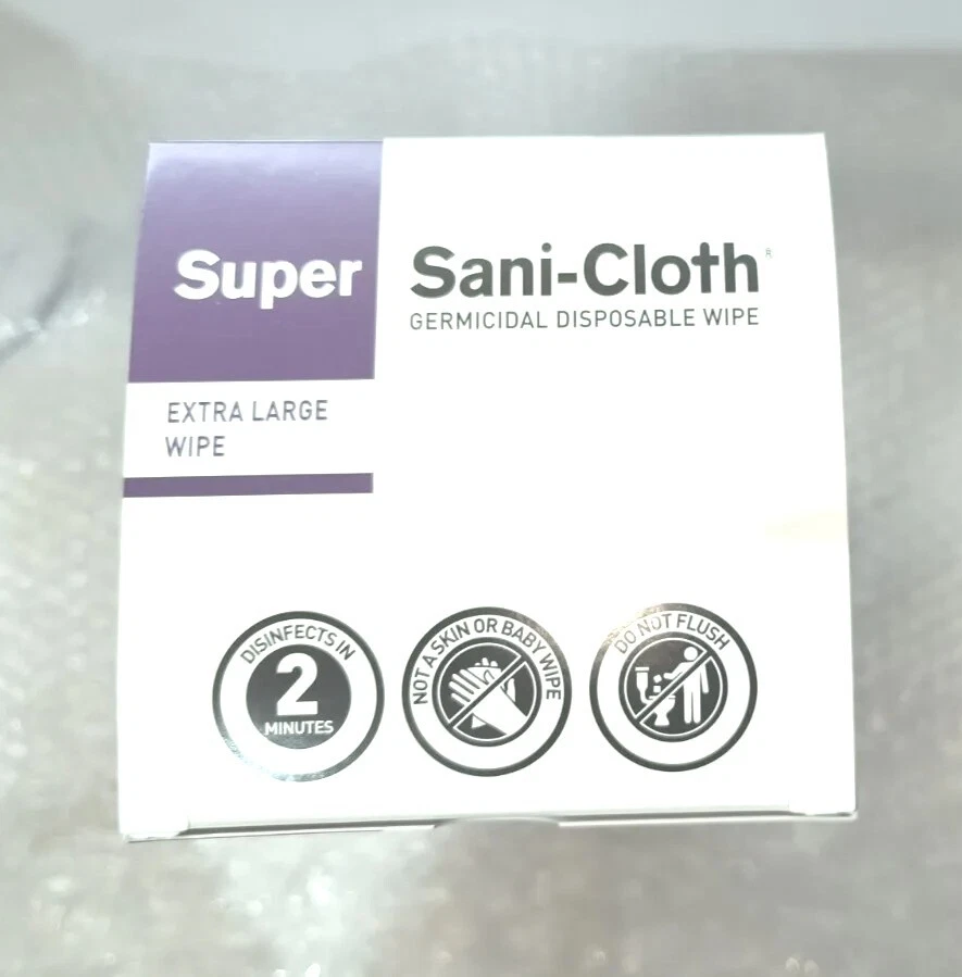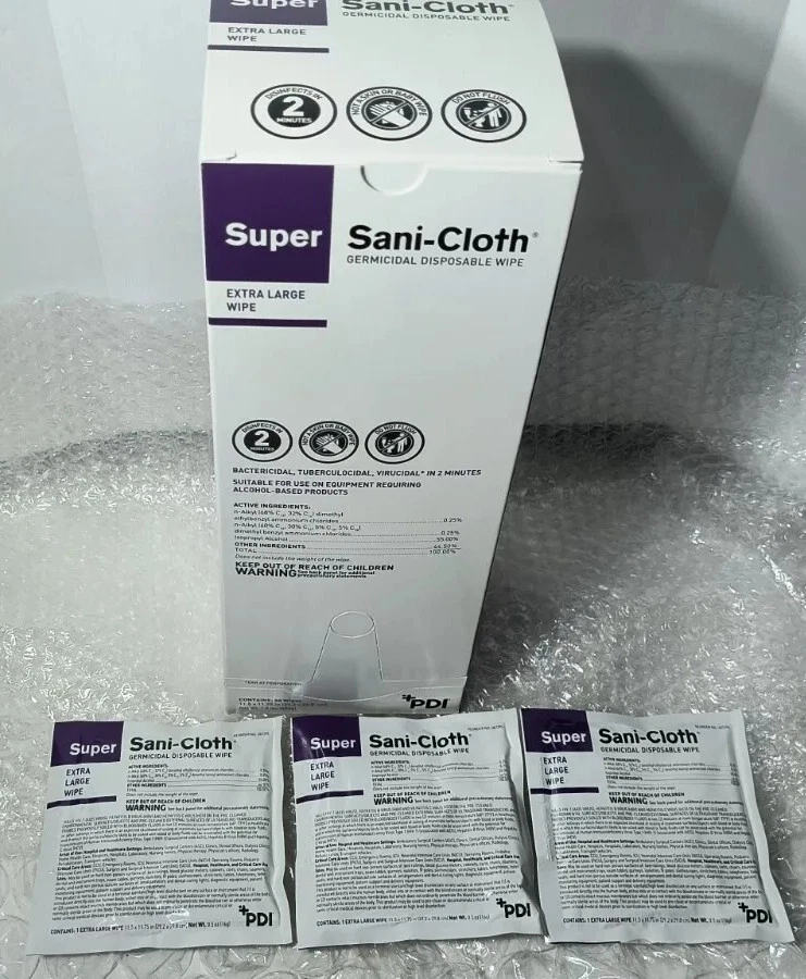 Case of 150 Individual Packs of Super Sani-Cloth Germicidal Wipes-Extra Large 11-1/2"x 11-3/4" Each box contains 50 wipes. 3 boxes in a case for a total of 150 Individually Packaged Germicidal Wipes Exp 09/22 FAST FREE SHIPPING Disclaimer. The photos and descriptions represent Seller's best efforts to reflect the condition and opinions about the products shown. The items in the listing are being sold without guarantees or warranties of any kind about the item's functionality beyond what is in the description and are being sold regardless of condition, wear, or damage, and with all faults and defects. Seller does not represent the manufacture of the product. SELLER EXPRESSLY DISCLAIMS ANY AND ALL WARRANTIES OR MERCHANTABILITY AND FITNESS FOR A PARTICULAR PURPOSE.The purchaser agrees that Seller is not liable for any injuries or damages of any sort associated in any way with this equipment. Purchaser agrees to indemnify and hold harmless Seller and Seller's officers, directors, employees, agents, and shareholders against any and all claims, liabilities, obligations, demands, cost and expenses of every kind and nature, including but not limited to attorney's fees and litigation expenses, from or related to the equipment and any use thereof. The sale of this item may be subject to regulation by the U.S. Food and Drug Administration and state and local regulatory agencies. If so, do not bid on this item unless you are an authorized purchaser