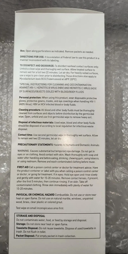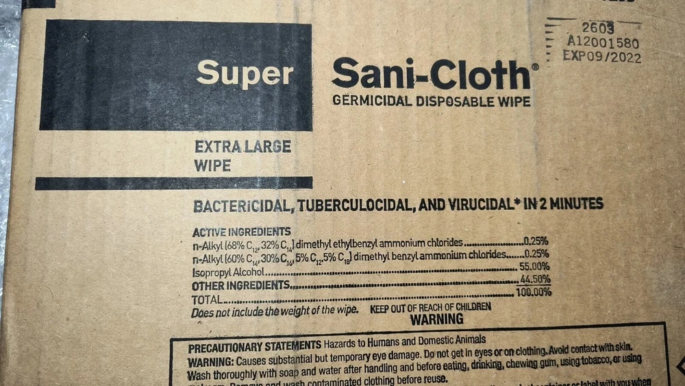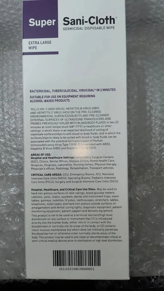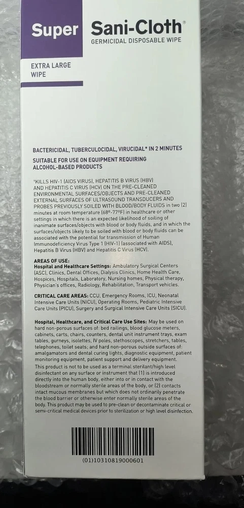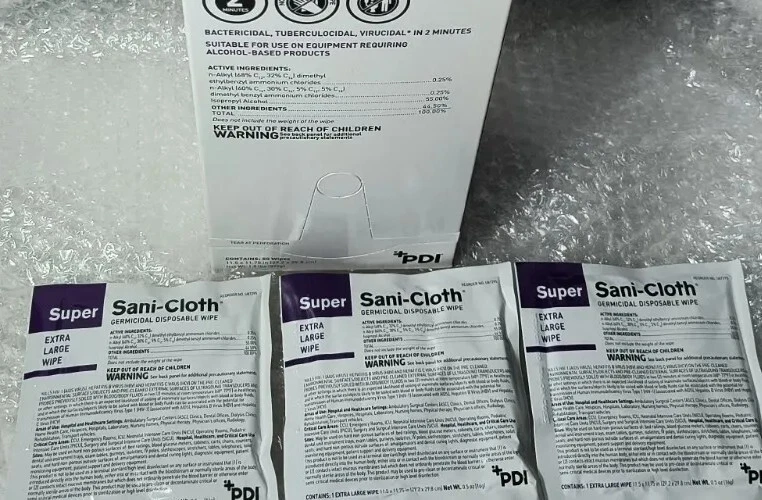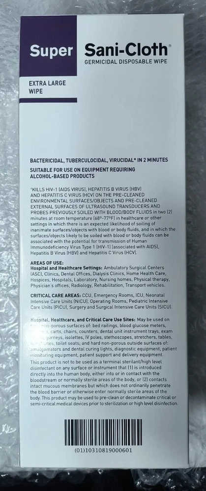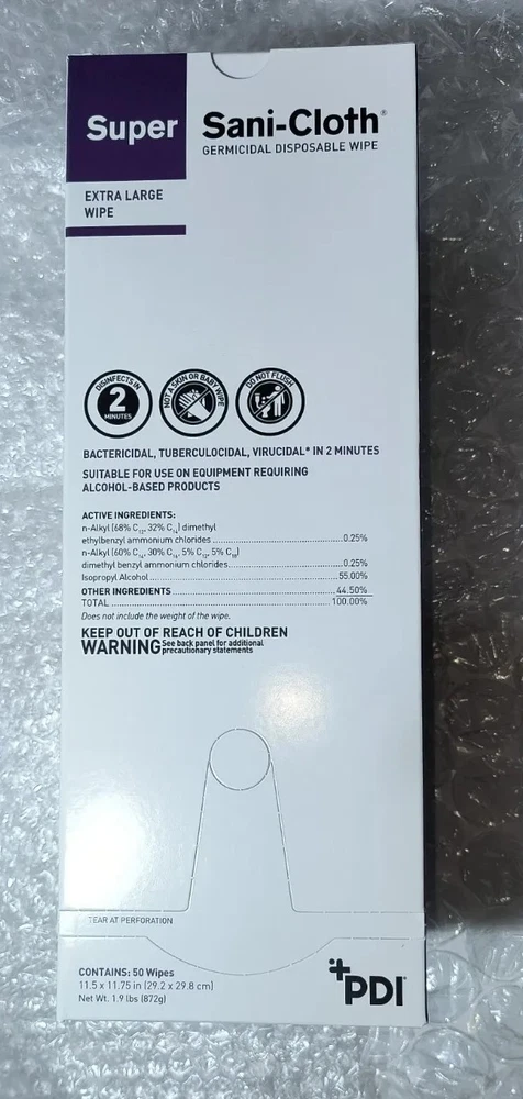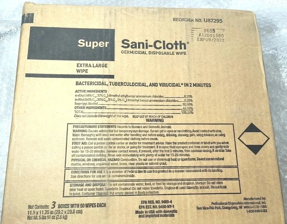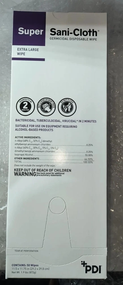 Case of 150 Individual Packs of Super Sani-Cloth Germicidal Wipes-Extra Large 11-1/2"x 11-3/4" Each box contains 50 wipes. 3 boxes in a case for a total of 150 Individually Packaged Germicidal Wipes Exp 09/22 FAST FREE SHIPPING Disclaimer. The photos and descriptions represent Seller's best efforts to reflect the condition and opinions about the products shown. The items in the listing are being sold without guarantees or warranties of any kind about the item's functionality beyond what is in the description and are being sold regardless of condition, wear, or damage, and with all faults and defects. Seller does not represent the manufacture of the product. SELLER EXPRESSLY DISCLAIMS ANY AND ALL WARRANTIES OR MERCHANTABILITY AND FITNESS FOR A PARTICULAR PURPOSE.The purchaser agrees that Seller is not liable for any injuries or damages of any sort associated in any way with this equipment. Purchaser agrees to indemnify and hold harmless Seller and Seller's officers, directors, employees, agents, and shareholders against any and all claims, liabilities, obligations, demands, cost and expenses of every kind and nature, including but not limited to attorney's fees and litigation expenses, from or related to the equipment and any use thereof. The sale of this item may be subject to regulation by the U.S. Food and Drug Administration and state and local regulatory agencies. If so, do not bid on this item unless you are an authorized purchaser