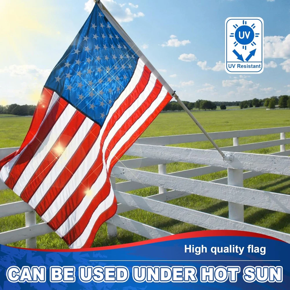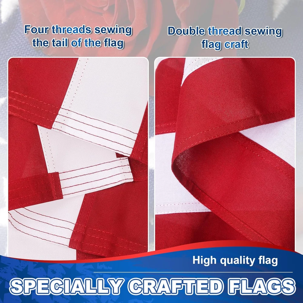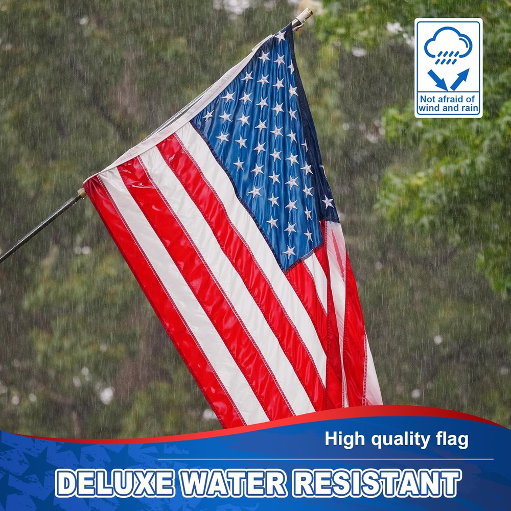 Heavy Duty American Flag Longest Lasting Material:We have deep-processed the American flag fabric, which has tenacious windproof and waterproof performance. It will make the flag show bright colors in different seasons, eye-catching, which will make you have an unspeakable sense of pride. Choose our 5x8 ft american flag, provide the best american flag best in usa, surprising quality, Let our patriotism be displayed Deluxe Embroidered American Flag:5x8 ft American Flag outdoor heavy duty consists of 50 densely embroidered stars and 13 thickened double-stitched stripes. All the edges of the USA flag are double-sewn, and the placket hem has 4 rows of reinforcement and is well made to prevent rapid tearing and wear and fraying, increasing the longevity of the American flag Heavy Duty American Flag For High Winds:USA flags 5x8 outdoor, you can use it on any occasion, you can tie it to the car when you travel, and take it everywhere as a souvenir. At the same time, it can be used as a flag for outdoor farms, a commemorative event for family and friends, and a flag gift on the wall of the room. The decorative American flags, and you can hang the flags on the outside windows, corridors and flagpoles in front of the door. They are all very good flags displays American Flag Strongest Uv Protected Durable:The 5 x 8 outdoor American flag is specially treated with a waterproof coating and UV resistant coating that allows the American flag to dry quickly, and even after prolonged exposure to the hot sun, USA flag has a vibrant color that keeps the US flag in good condition in any weather and free to fly outdoors all year round American Flag:Our American flag is a wonderful gift for veterans and patriotic families. At the same time, we are committed to bring the best shopping experience for customers and provide the best quality products at the best price. If you have any question about our American flags, you can feel free to contact us and we will give you a satisfactory answer within 24 hours Product Description