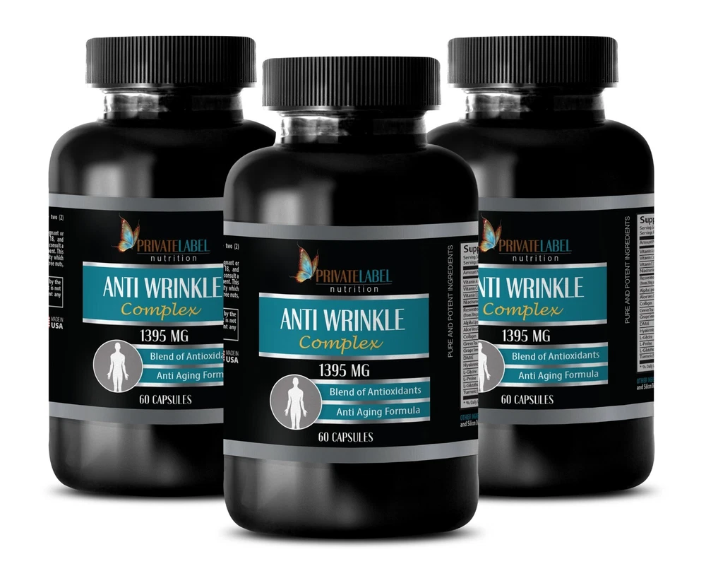 Supreme Beauty Essence: ANTI-WRINKLE COMPLEX - 3B - 180 Caps Anti-Wrinkle Complex Protects Against Ageing Collagen Boosting Ingredients Natural Formula Made in USA 3 Bottle 180 Capsules Introducing our Anti-Wrinkle Complex – a meticulously curated skincare solution designed to breathe new life into your skin. Enriched with a synergistic blend of premium ingredients, this complex tackles a spectrum of skincare concerns, leaving you with a complexion that exudes youthfulness and radiance. Key Ingredients: Vitamin A: Celebrated for promoting cellular turnover, Vitamin A works to diminish the appearance of fine lines and wrinkles, contributing to a smoother skin texture. Vitamin E: Providing nourishment and hydration, Vitamin E supports skin health by moisturizing and shielding against free radicals, thwarting premature aging. Vitamin C: A formidable antioxidant, Vitamin C illuminates the skin, defends against environmental damage, and stimulates collagen production for enhanced elasticity. Niacin: Also known as Vitamin B3, Niacin refines skin texture, reduces redness, and fortifies the skin's barrier function. Resveratrol: Derived from red grapes, Resveratrol possesses antioxidant prowess, calming the skin and combatting signs of aging. Alpha Lipoic Acid: A potent antioxidant, Alpha Lipoic Acid minimizes fine lines, wrinkles, and enlarged pores, promoting a refined skin texture. Aloe Vera: Revered for its soothing properties, Aloe Vera calms and hydrates the skin, fostering a healthy and radiant complexion. Collagen: Essential for skin elasticity, Collagen fosters firmness and diminishes the appearance of sagging skin. Green Tea Leaf: Abundant in antioxidants, Green Tea Leaf extract shields the skin from free radical damage, supporting a luminous and even skin tone. Grape Seed: Packed with polyphenols, Grape Seed extract fortifies the skin against environmental stressors, reducing signs of aging. Green Coffee Bean: Containing chlorogenic acid, Green Coffee Bean is celebrated for maintaining skin elasticity and firmness.= Hyaluronic Acid: A hydration marvel, Hyaluronic Acid locks in moisture, plumping the skin and reducing the appearance of fine lines. Glycine: An amino acid supporting collagen production, Glycine contributes to skin firmness and elasticity. Lycopene: Found in tomatoes, Lycopene safeguards the skin from UV damage, supporting a youthful appearance. L-Glutathione: A powerful antioxidant, L-Glutathione brightens the skin and shields against oxidative damage. Turmeric: Recognized for its skin-soothing properties, Turmeric helps reduce redness, promoting a more even complexion. Benefits of Our Anti-Wrinkle Complex: Reduction of fine lines and wrinkles Enhanced collagen production for increased elasticity Defense against environmental damage Deep nourishment and hydration Promotion of a radiant and even skin tone Embark on a transformative skincare journey with our Anti-Wrinkle Complex, bid farewell to signs of aging, and reveal a more youthful, radiant version of yourself. Ingredients: Serving Size: 2 capsules Servings per container: 30 Vitamin A (beta-carotene) - 2,500 IU Vitamin C (ascorbic acid) – 120 mg Vitamin E (d-Alpha tocopheryl) – 30IU Niacinamide – 40mg Resveratrol (from 20mg of polygonum cuspidatum 50% extract) – 10mg Alpha Lipoic Acid – 300mg Aloe Vera Gel (200:1) – 200mg Collagen – 150 mg Green Tea (50% extract) – 100mg Grape Seed (95% extract) – 100mg DMAE – 100mg Hyaluronic Acid – 5mg L-Glycine – 100mg L-Proline – 100mg L-Glutathione Reduced – 20mg Turmeric (95% curcuminoids) – 50mg Other Ingredients: Gelatin, Magnesium Stearate, and Silicon Dioxide. Directions: Take one veggie capsule twice daily 30 minutes before meals with an 8oz glass of water. ZERO fillers, ZERO binders, ZERO artificial ingredients