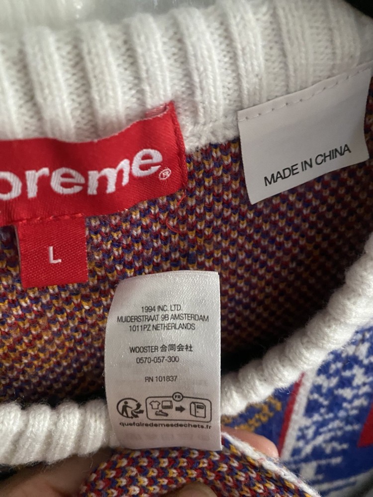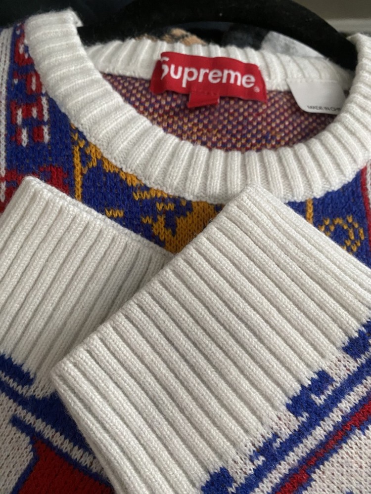 An intarsia-knitted cotton sweater (not a sweatshirt) featuring the word "SUPREME" in massive, oversized block letters that wrap around the chest, sleeves, and back. Condition 9/10 gently worn. Relaxed/Athletic "University" fit. The internal wash tag will list the Japanese support number 0570-057-300 . This is a hallmark of authentic Supreme items sourced from the Japanese market, where many of these sweaters are currently being sold by high-end vintage boutiques. Relaxed/Athletic "University" fit. Measurements for Large Size Chest Width (Pit-to-Pit ) 26" Body Length (Back Neck to Hem) 28" Sleeve Length (Center Back to Cuff) 35"