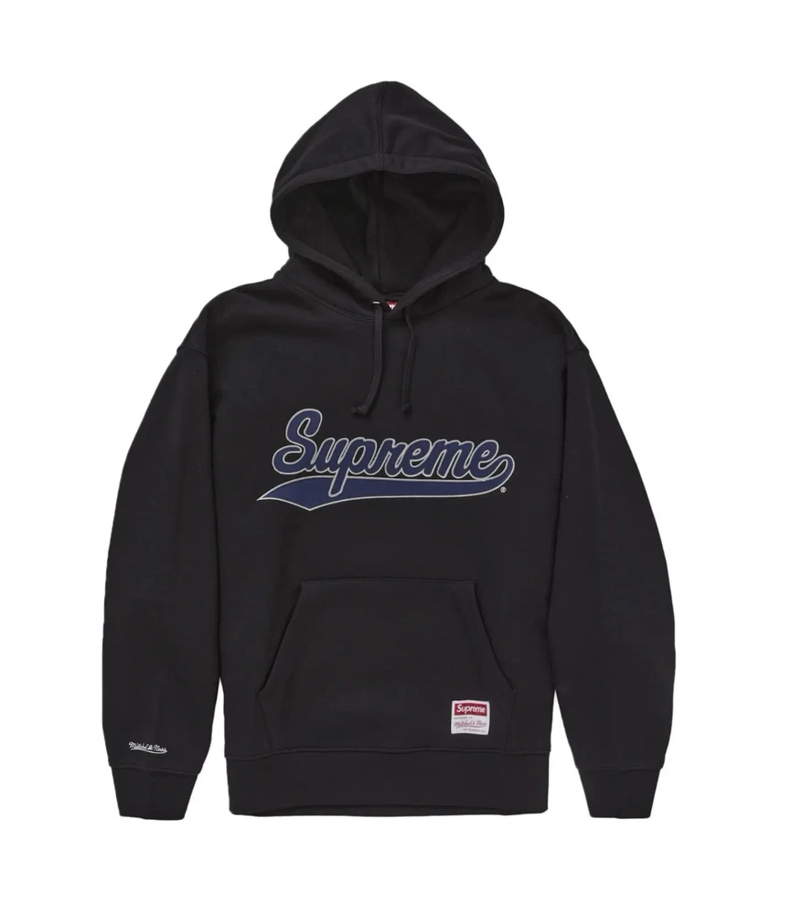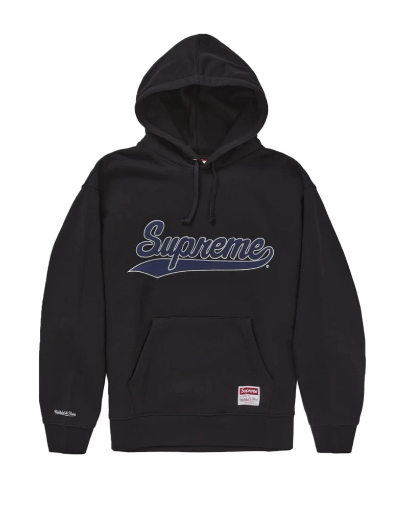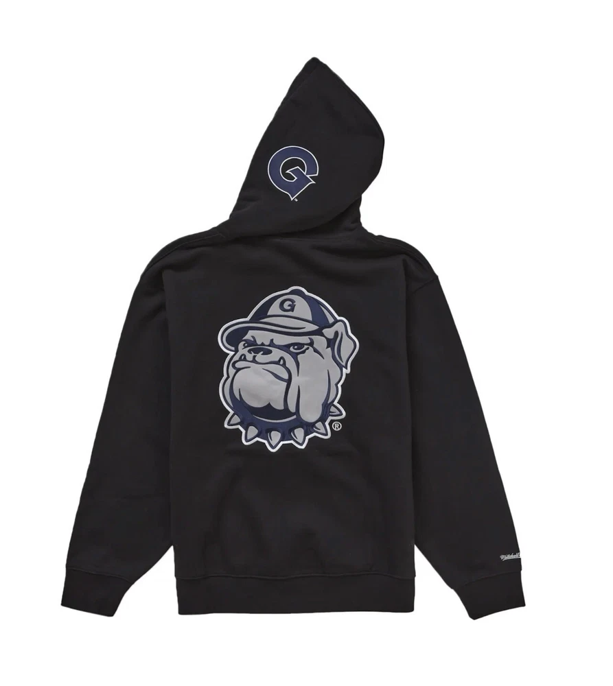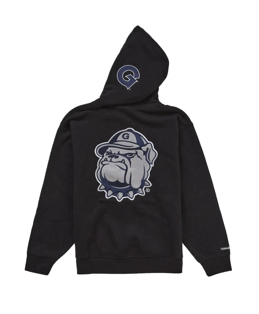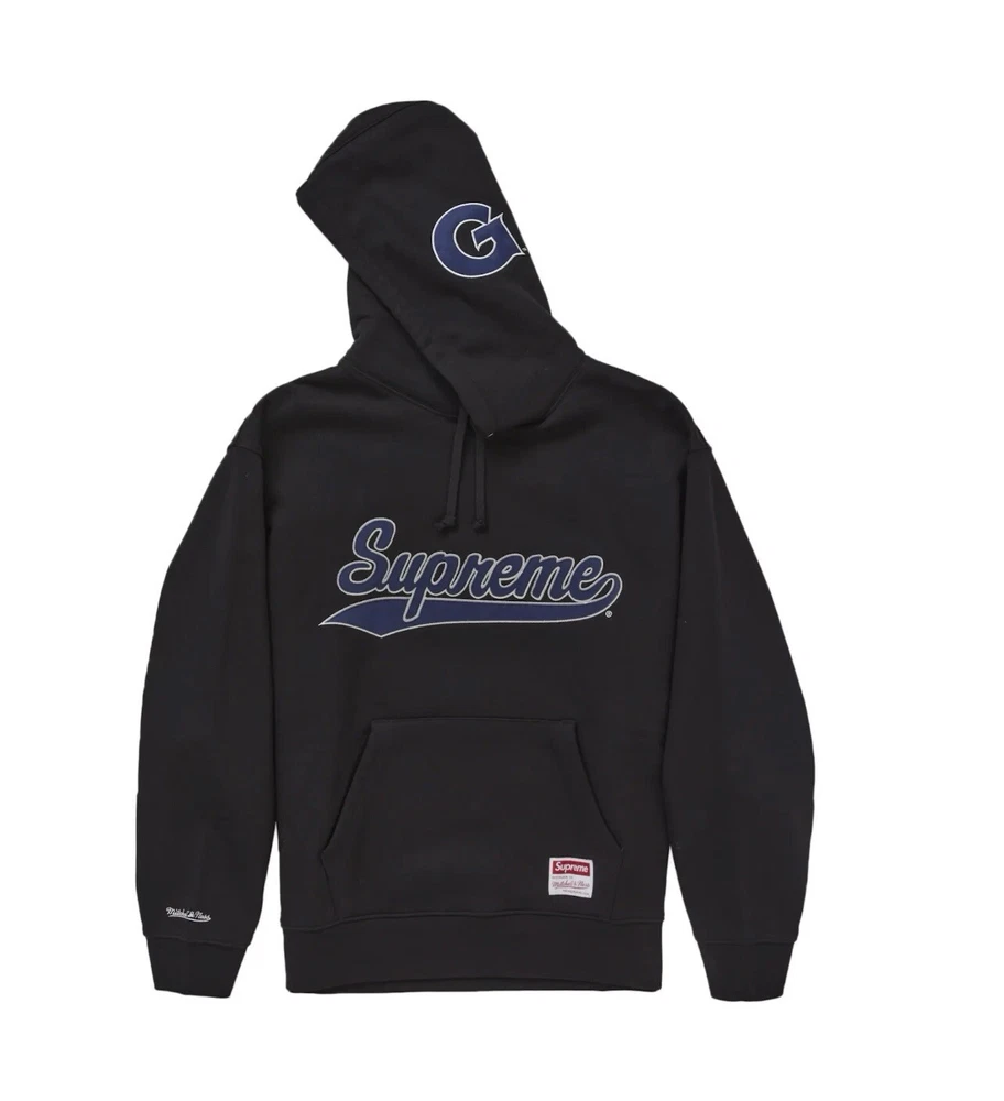 Show off your team spirit with this Supreme Mitchell & Ness NCAA Hooded Sweatshirt in black, featuring the iconic Georgetown Bulldogs logo. Made with high-quality materials, this pullover sweatshirt is perfect for any fan of the team. The hooded sweatshirt comes in a size L, making it a great fit for most men. The sweatshirt is designed with the brand's signature style, making it a stylish addition to any wardrobe. It's perfect for game day or just lounging around the house. The sweatshirt is made with a hood to keep you warm and comfortable. Get your hands on this Georgetown Bulldogs hooded sweatshirt today!