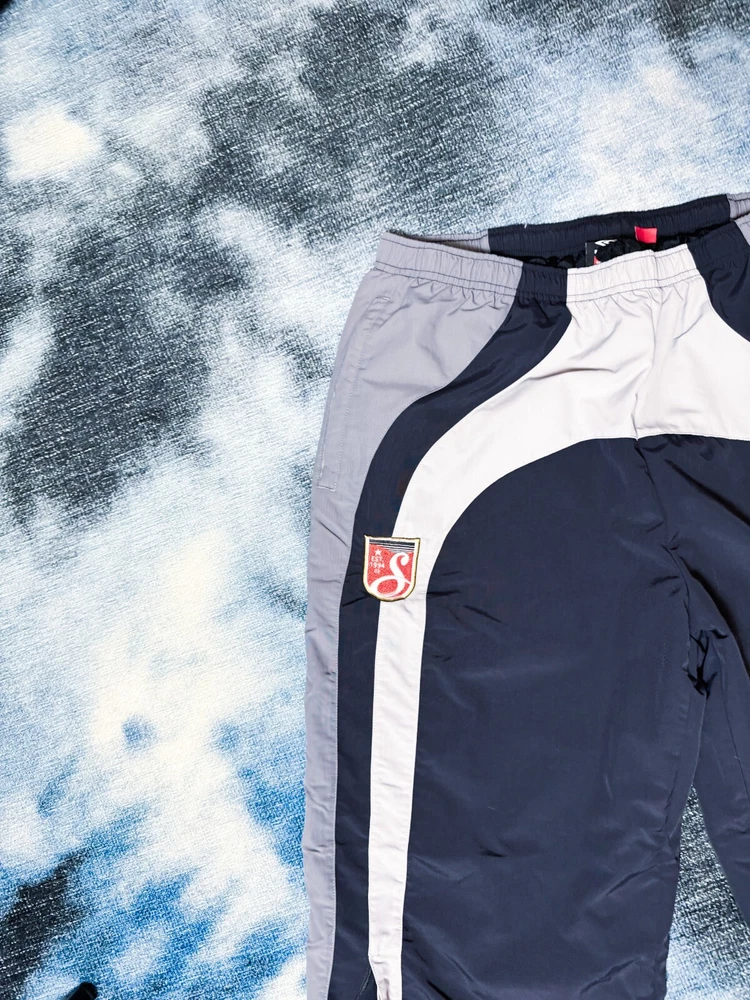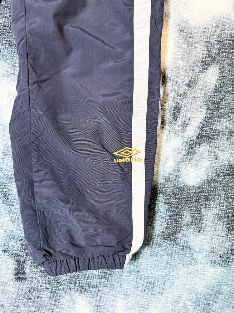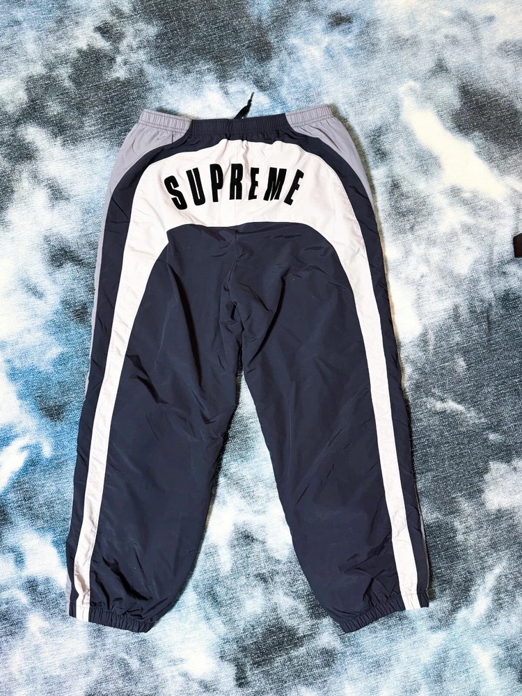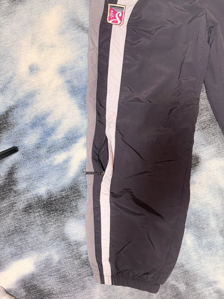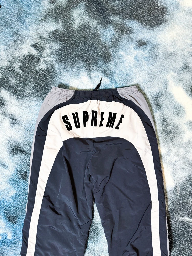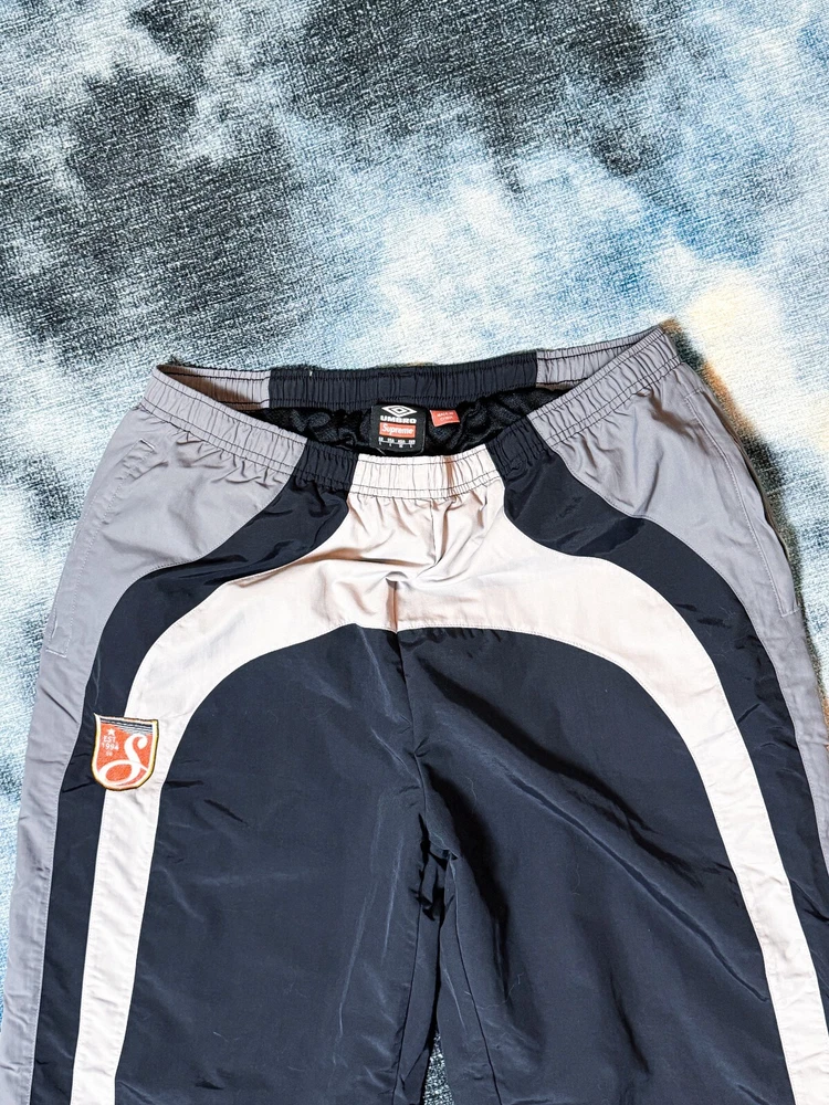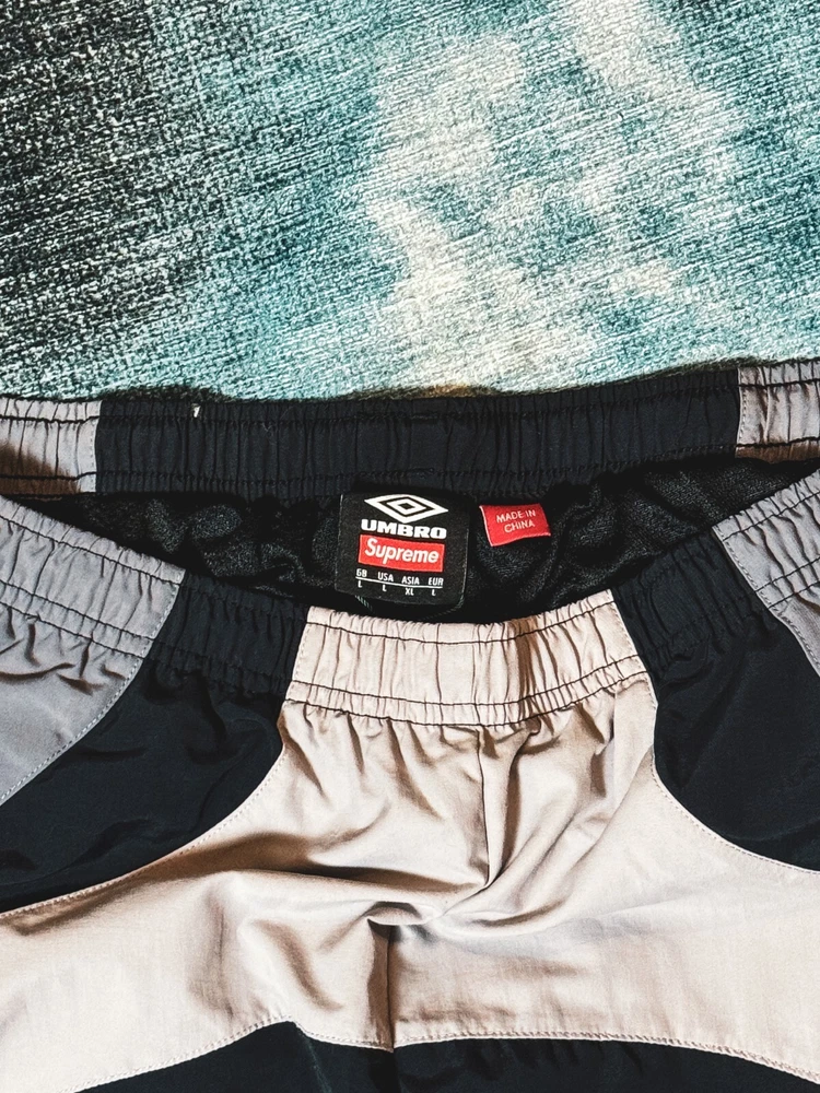 Elevate your activewear game with these stylish Supreme Umbro Track Pants in black, grey, and white. Designed for men in size XL, these track pants are perfect for any occasion, from hitting the gym to running errands. The Supreme brand guarantees quality and style, and these pants do not disappoint. Featuring a comfortable regular fit and a flattering blue color, these track pants are a must-have for any wardrobe. The model is named after the renowned Umbro brand, and the attention to detail is evident in the style. These pants are perfect for any man looking for comfortable and stylish activewear. Love the zipper stash pocket on these located on the right pant lag about middle calf height. Picture provided.