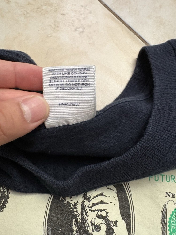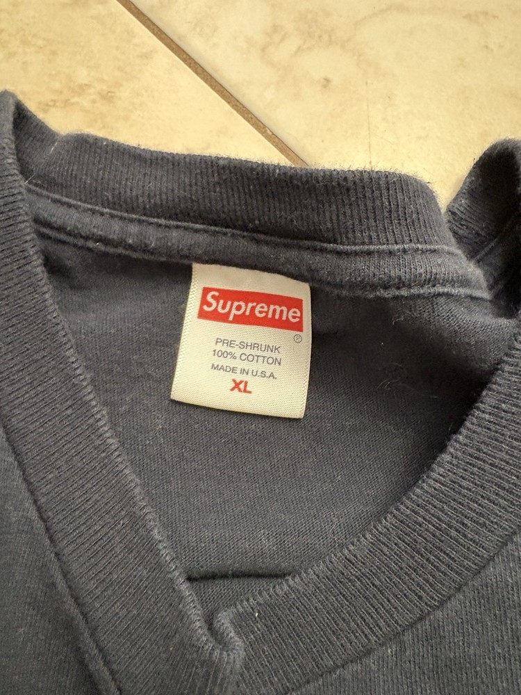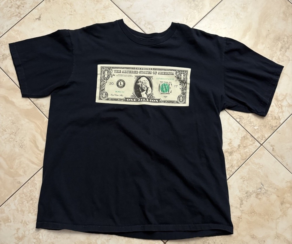 The Supreme Zillion Dollar Bill Tee in Black XL is a stylish and versatile men's t-shirt perfect for the summer season. Made of comfortable cotton material, this short sleeve tee features a crew neck design and regular fit, making it a classic choice for everyday wear. The unique bill character adds a touch of personality to the garment, while the Supreme brand ensures quality and style. Easy to care for with machine washable instructions, this t-shirt is a must-have addition to any wardrobe for those looking for a fashionable and trendy piece.