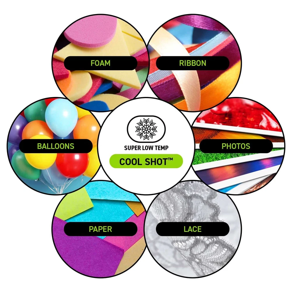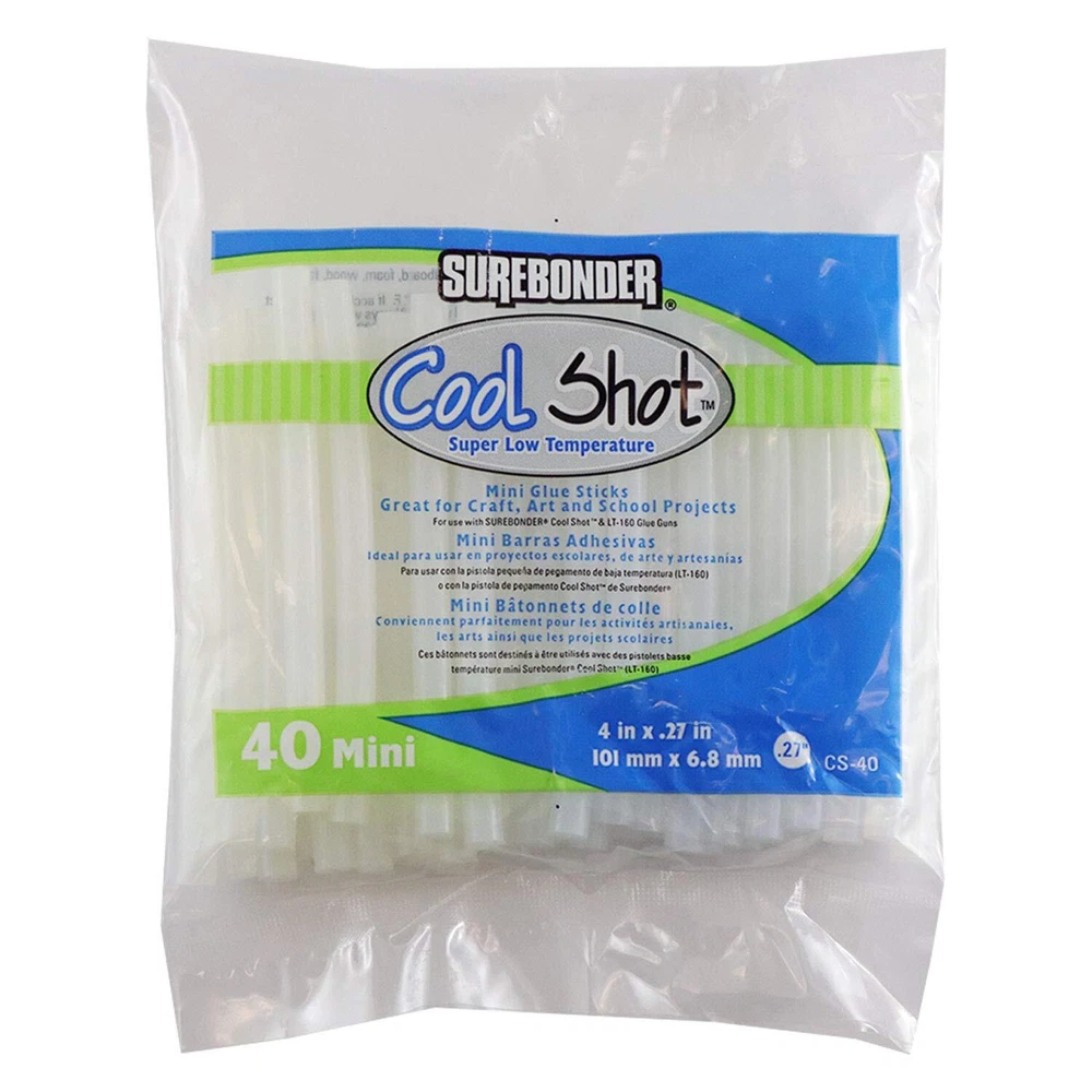 Surbeonder's Cool Shot value pack is perfect for the avid, delicate crafter. These safer-to-use adhesives are perfect for securing delicate materials that bond best with lower-temperature glue. Easy to install into gun, handle and clean up after use. Not every project calls or allows for sizzling hot glue and our Cool Shot formula solves this problem without sacrificing performance. Our specially designed formula melts at a lower temperature than traditional hot glue but flows and adheres just as well. Dried color ranges from clear to milky white. 40 glue sticks per pack. Contains 40 mini glue sticks specifically made for bonding delicate materials such as balloons, ribbon, lace or children's crafts Four-inch length with 5/16-inch diameter works best in low-temperature mini glue guns such as the Cool Shot Glue Gun (Surebonder KD-160F) Provides excellent glue flow with long-lasting adhesion Unique formula melts and flows at a lower temperature without losing its strong, adhesive properties Made in the USA and dries clear to cloudy white