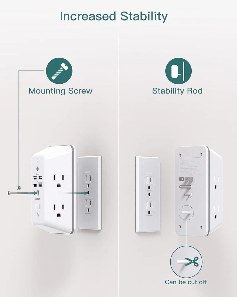 Surge Protector, Outlet Extender with Night Light, Addtam 5-Outlet Splitter and 4 USB Ports(1 USB C), Multi Plug Wall Outlet for Home Office Dorm Room Essentials Item Description 【9 IN 1 USB Wall Outlet】You get 4 USB charging ports (1 USB C) and 5 wide-spaced outlets; 3 side design plug extender provides large space; LED night light around the edge of the outlet extender makes life more convenient; removable screw and the plastic prong make it firmly attached to the outlets 【Smart & Soft Night Light】Dusk-To-Dawn sensor, automatically turns on only when ambient lighting becomes insufficient. The night light is soft, warm and comfortable, great for bedroom, bathroom, nursery, hallway, kitchen and more (PS: If it doesn't auto turn on when the light is dim or you don't need the night light, you can touch the Sensor Switch to turn the light ON or OFF) 【Double Stability & Wide Space】The screw included can be used to secure it on duplex outlet. The plastic prong at the back is for stable purposes also. For USB receptacle and GFCI outlet, the plastic prong needs to be cut off before use. 3-sided design and 1.7 inches large space between 5 sockets make it easier to use for all kinds of equipment 【1 USB- C & 3 USB-A】USB C charging port features 3A Max, USB A charging port features 2.4A Max, compatible with almost all usb devices(the actual current is decided by the demand for the devices) 【Super Safety】3 complementary surge protection circuits(TVS MOV GDT) with the minimum energy-absorbing capacity of 1050 Joules. This surge protector wall mount also has overload protection, short-circuit protection, over current protection, over-voltage protection and overheating protection Auto turn on ONLY at night or when ambient light is dim If you don't need night light, press touch sensor switch to turn off, remember to press touch sensor switch again if you need it later Payment Shipping . Return