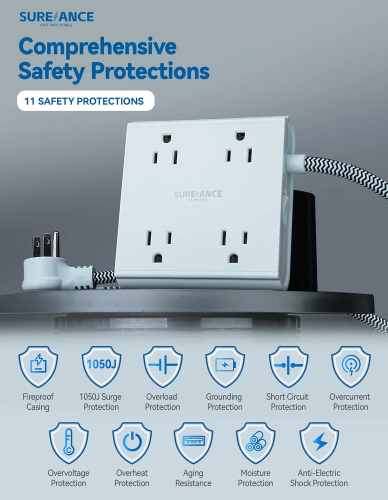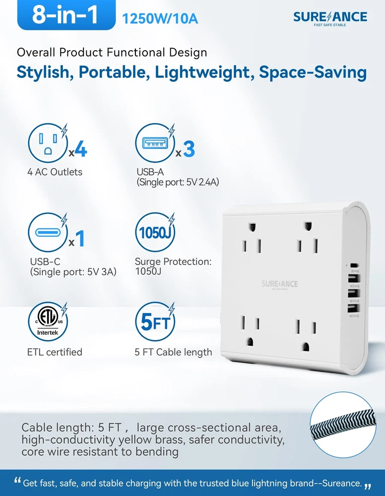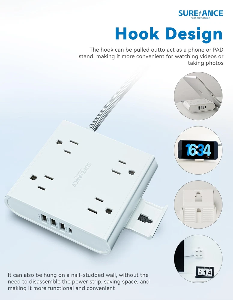 【10-in-1 Versatile Power Strip】Offering a total of 8 sockets, including 4 AC outlets, 3 USB-A ports (5V 2.4A), and 1 USB-C port with 15W fast charging capabilities. With a maximum power capacity of 1250W/10A and surge protection of 1050J, this power strip ensures safe and stable charging for multiple devices. The 5FT extension cord with high-conductivity yellow brass construction provides reliable power transmission and resistance to bending. ETL certified. 【Multi-Functional Small Hook】The sleek power strip is equipped with a small hook on the side, which can be pulled out when needed and retracted according to your own wishes. The hook can be pulled out to act as a phone or PAD stand, making it more convenient for watching videos or taking photos. It can also be hung on a nail-free wall, saving space and adding functionality and convenience. Suitable for various scenarios: home Equipment, office Accessories, workshop essentials, gaming room. 【11 Safety Protections】The power strip surge protector offers comprehensive safety protection with 11 safety protections. These include a fireproof casing, 1050J surge protection, overload protection, grounding protection, short circuit protection, overcurrent protection, overvoltage protection, overheat protection, high-frequency anti-interference protection, aging resistance and moisture protection, as well as anti-electric shock protection. This ensures that your devices are safeguarded against various potential risks, providing peace of mind during charging and usage. 【Comprehensive & Spaced Outlets】A switch on the side that automatically shuts off the circuit board in case of circuitissues, ensuring circuit safety (10A overload protection button). The wider spacing between the outlets accommodates plugs of different shapes and sizes. 3USB−A&1USB−C charger with a 5Vdc 3.4Amax output, ideal for travel as it can charge three iPhones simultaneously within two hours, and is compatible with various devices like phones, headphones, Pads, small fans, and toothbrushes. It measures L3.9” x W4.13” x H1.16”. 【Mountable and Flat Plug】The electric plug multiplier, designed with one holes on the back for easy installation. Featuring a flat plug with a slim profile, this power strip is perfect for tight spaces. The plug is also inclined at a 45-degree angle for convenient access and ease of use. The back features anti-slip pads for effective skid resistance. Excellent craftsmanship, durable with over 5000 plug and unplug cycles. UL94 V-0 flame-retardant material, electrical resistance withstands up to 1382 degrees Fahrenheit.