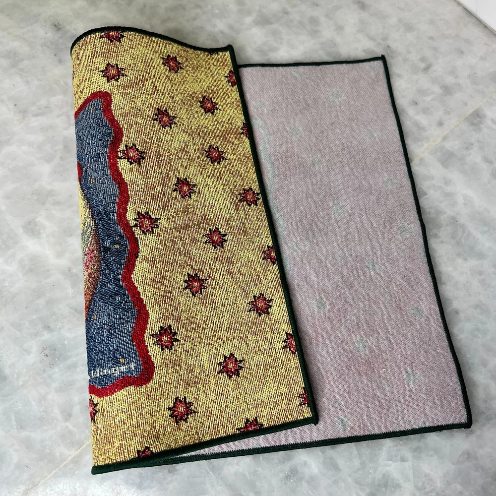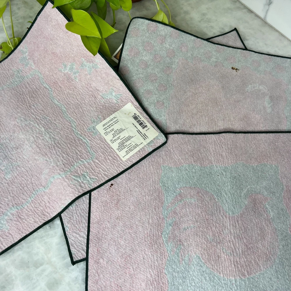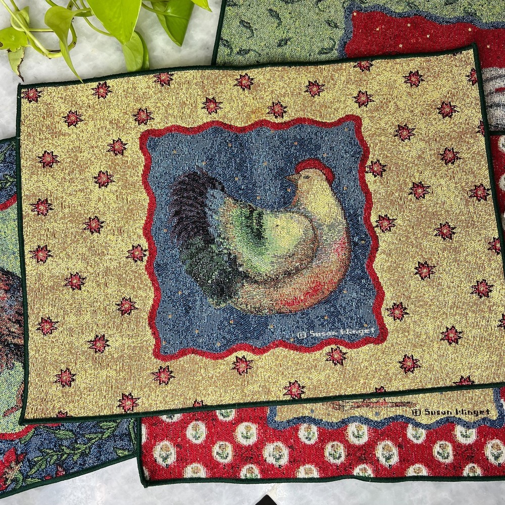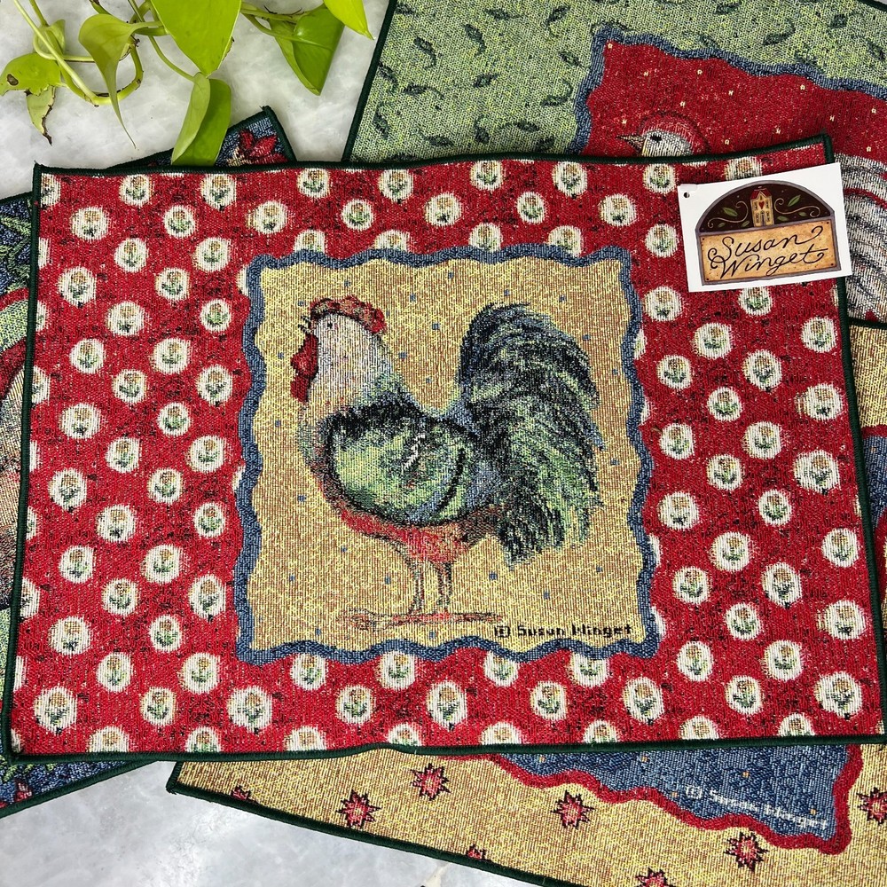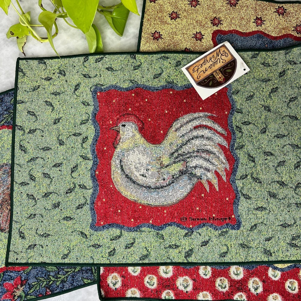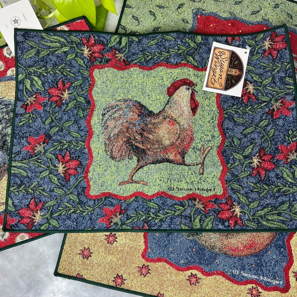 Set of four Susan Winget tapestry placemats from the “Something to Crow About” series featuring colorful rooster artwork and classic farmhouse styling. These woven placemats add warmth and charm to a country kitchen, breakfast table, or seasonal display. Three of the four placemats still have their original Susan Winget tags attached. Measures 18.5" x 13" Placemats are in good condition overall. There are a few small stains visible on the back side only, which do not affect display or use. A great addition to rooster decor collections, farmhouse kitchens, or Susan Winget textile pieces.
