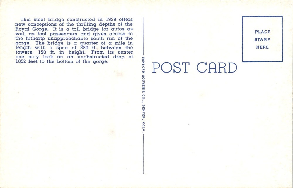 MAKE AN OFFER. THE MORE YOU BUY THE BETTER DEAL I WILL ACCEPT The postcard features the Suspension Bridge over the Royal Gorge in Canon City, Colorado. This bridge, constructed in 1929, is known as the world's highest bridge over one of the world's most stupendous chasms.