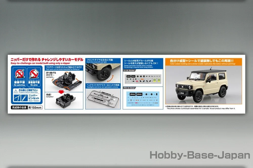 AOSHIMA SNAP CAR No.3-CI JB64 Jimny 2018 Chiffon Ivory Metallic - Japanese Plastic Model Kit - Description ■Product Features ・This is a Plastic Model Kit that can easily make the very popular "Jimny" light off-road 4WD. ・The first sale limited paper craft display stand is included. 【No painting required】This kit does not require painting by reproducing the body color with the coloring of plastic material. 【No Glue】This kit uses an inset type so no glue is required. ■Product status:Brand New ■Product content (1)Original Package(Japanese) (2)Manual(Japanese) (3)Plastic Model Kit (4)Marking Sticker (5)Paper Craft display stand Payment Buyers accept a variety of payment methods including credit and debit cards, Apple Pay, Google Pay and PayPal. Shipping Shipping is Economy and Expedited and Standard. ■Economy Shipping:Free Shipping ■Expedited and Standard Shipping:FedEx or EMS and Yamato Japan(There is an extra charge.) ※Depending on the shipping area, only Economy Shipping is available. International Buyers - Please Note: Import duties, taxes, and charges are not included in the item price or shipping cost. These charges are the buyer's responsibility. Please check with your country's customs office to determine what these additional costs will be prior to bidding or buying. If the cancellation is due to the buyer,we will charge a PayPal fee. If there is a remote charge for your address,we will charge you for additional shipping. Thank you for your understanding.