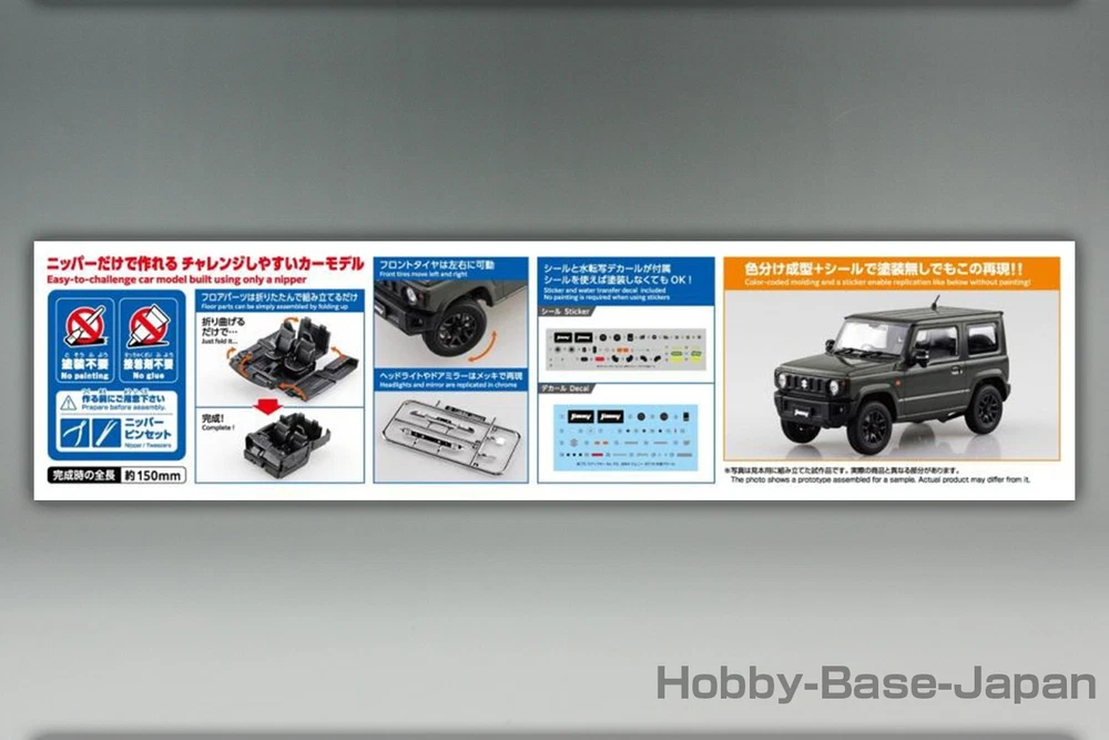 AOSHIMA SNAP CAR No.3-JG JB64 Jimny 2018 Jungle Green - Japanese Plastic Model Kit - Description ■Product Features ・This is a Plastic Model Kit that can easily make the very popular "Jimny" light off-road 4WD. ・The first sale limited paper craft display stand is included. 【No painting required】This kit does not require painting by reproducing the body color with the coloring of plastic material. 【No Glue】This kit uses an inset type so no glue is required. ■Product status:Brand New ■Product content (1)Original Package(Japanese) (2)Manual(Japanese) (3)Plastic Model Kit (4)Marking Sticker (5)Paper Craft display stand Payment Buyers accept a variety of payment methods including credit and debit cards, Apple Pay, Google Pay and PayPal. Shipping Shipping is Economy and Expedited and Standard. ■Economy Shipping:Free Shipping ■Expedited and Standard Shipping:FedEx or EMS and Yamato Japan(There is an extra charge.) ※Depending on the shipping area, only Economy Shipping is available. International Buyers - Please Note: Import duties, taxes, and charges are not included in the item price or shipping cost. These charges are the buyer's responsibility. Please check with your country's customs office to determine what these additional costs will be prior to bidding or buying. If the cancellation is due to the buyer,we will charge a PayPal fee. If there is a remote charge for your address,we will charge you for additional shipping. Thank you for your understanding.