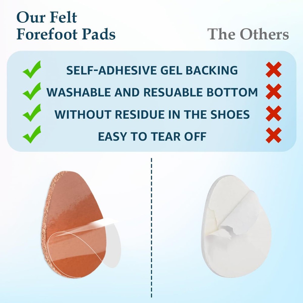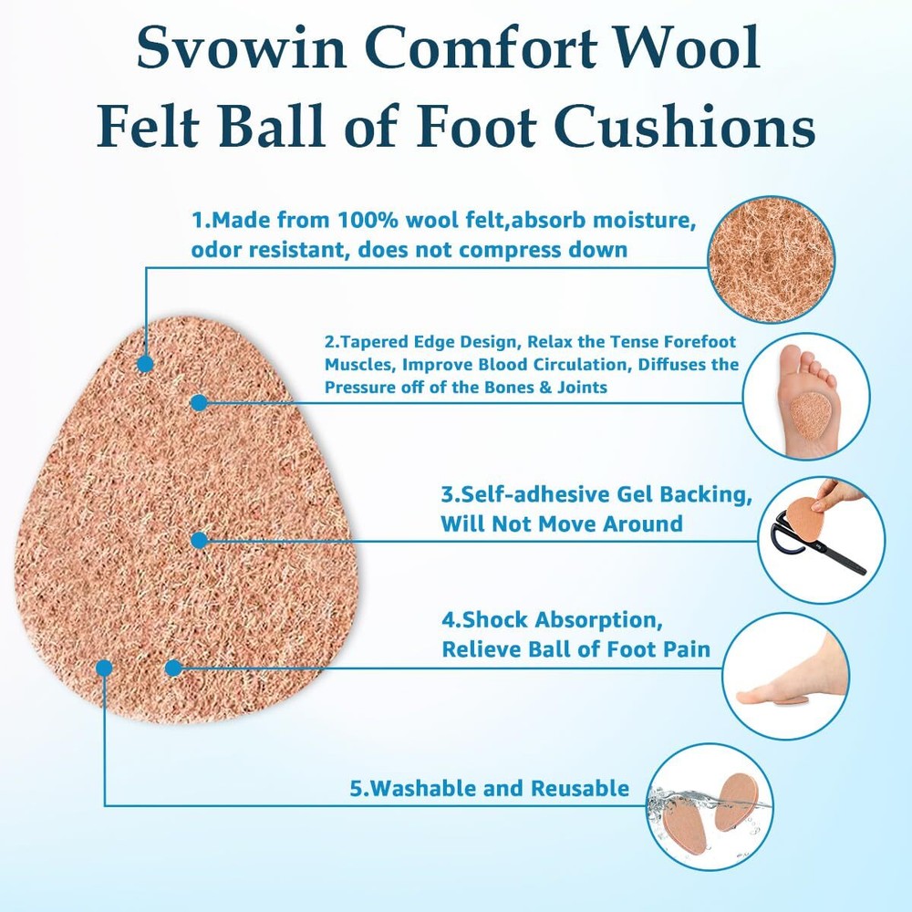 Svowin 8-Pack Wool Felt Metatarsal Foot Pads Shoe Insoles for Morton's Neuroma, Self-Adhesive Gel Ball of Foot Cushions Inserts for High Heels, 0.2'' Thick Non-Slip Forefoot Support (Black+Beige) Svowin 8-Pack Wool Felt Metatarsal Foot Pads Shoe Insoles for Morton's Neuroma, Self-adhesive Gel (Bottom) Ball of Foot Cushions Inserts for High Heels, 0.2'' Thick Non-slip Forefoot Support for Women Men Tapered edge design fits perfectly in the ball of your foot, relax the tense forefoot muscles, improves blood circulation. Perhaps you may feel uncomfortable or even painful when you first use our pads, so continue to use it. After a period of use, provide some extra padding that helps to relieve the metatarsal pain and allow it to heal, realign the bones into a correct position. BALL OF FOOT CUSHIONFOR For MORTON'S NEUROMA: 0.2 inch thick, will not compress down, they do not add height to insoles, comfortable and put just the right amount of lift to reduce pressure on the ball.The felt pads that is so comfortable and easy on the feet, nearly undetectable when standing, walking,hiking, add to the comfort, the edge shape cushions and diffuses the pressure off of the bones & joints. REDUCE METATARSAL FOOT PAIN:Our forefoot shoe inserts can provide all day cushioning and absorbs shock, keep your feet from slipping forward downward, and add nice padding in the shoe, help the ball of your feet to prevent rub and blister, forefoot pads for calluses, bunions, corns, morton neuromas. The anti-slip metatarsal pads block the body's gravity and forefoot pressure well and fits the foot shape. Self-adhesive Wool Felt( Reusable and Washable):Made of wool felt, not absorb moisture, is deodorization.The bottom is self-adhesive gel, not glue, will stay in your shoes firmly,there is no residue on the bottom of your foot when removing the pad.If it loses stickiness, please clean it with water to maintain stickiness. FIT MOST SHOES: Designed to wear with shoes, socks or barefoot. They fit perfectly on any high heels, open toe shoes, flat sandals, running shoes, dress shoes, boots, sports shoes, work shoes, leather shoes, etc. Not for tight shoes. TRUSTED QUALITY ASSURANCE - If you are not satisfied with this purchase, please feel free to contact us with your order ID and tell us how would you like us to help, we will try our best to offer the most responsible solution. Moreover, We do not suggest customer return opened products to Amazon warehouse in case used products being resold to other customers. Shipping from the USA All of our products are shipped from the USA, ensuring quick delivery to your destination. Payment We offer the following payment methods: PayPal, credit card, bank transfer, and eBay's secure payment system. Free Shipping & Free Returns Shipping within the USA is FREE. Additionally, any return is absolutely free for you. Risk-Free Purchase You have the option to return an item within 30 days without any justification. We cover the return shipping costs! Fast Shipping We ship immediately upon receipt of payment. Generally, the package is delivered within 2-3 days in the USA. If it takes longer, we will contact you. Quality and Costs Made in Europe, USA, China No customs fees or additional charges Total satisfaction guarantee Invoice with declared VAT available upon request in .pdf format Feedback Your feedback is very important to us. After you pay for your purchase, you will automatically receive positive feedback from us.