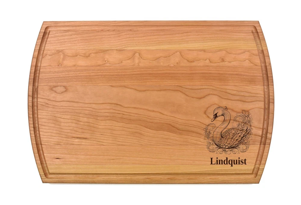 Design: Personalized Swan Cutting Board or Charcuterie Serving Tray All items ship via USPS - please make sure your address is correct :-) Whether used as a charcuterie serving tray for snacks or cutting board, our bamboo, walnut and cherry custom boards are the perfect addition for the home and make the perfect gift for your loved one celebrating a birthday, anniversary, new home, wedding, etc! *** FEATURES *** • SIZES: We have multiple styles and sizes available. To see our current sizes available, click the drop-down menu. The photo slide contains a photo showing each side by side. Please note, the board with the juice groove only has the groove on the front side of the board. • THICKNESS: Bamboo Boards - Approximately 1/2" Thick; Walnut & Cherry Boards - Approximately 3/4” Thick • UNIQUE: Every board is unique with the grain and coloring varying throughout - no board is the same! • CARE INSTRUCTIONS: Hand wash only with warm water. Do not soak. Please apply mineral oil throughout the board’s life. • PERSONALIZATION/CUSTIMIZATION: Do you want the text placed differently on the board? Please don’t hesitate to contact us. All personalization notes can be entered in the personalization box when checking out. • SHIPPING: All cutting boards ship within 2 to 5 business days. • WHOLESALE ORDERS: Please don’t hesitate to contact us for information about wholesale orders. Processing times for larger orders may change. • NOTE: Colors can vary a bit on different monitors and screens. Any props included in photos are not included. Please be sure to double-check your address to make sure it is accurate for USPS delivery. If a package is returned to us due to an invalid address, the buyer is responsible for all additional shipping charges. We appreciate you supporting small business – best wishes! For items ordered with simple edits, we do not send proofs since the layout doesn't change from the example(s). However, in the event there are requests that change the layout from the example(s), we do send proofs for approval before making the product. If you'd like a proof before we make the product, please note so in the personalization box.