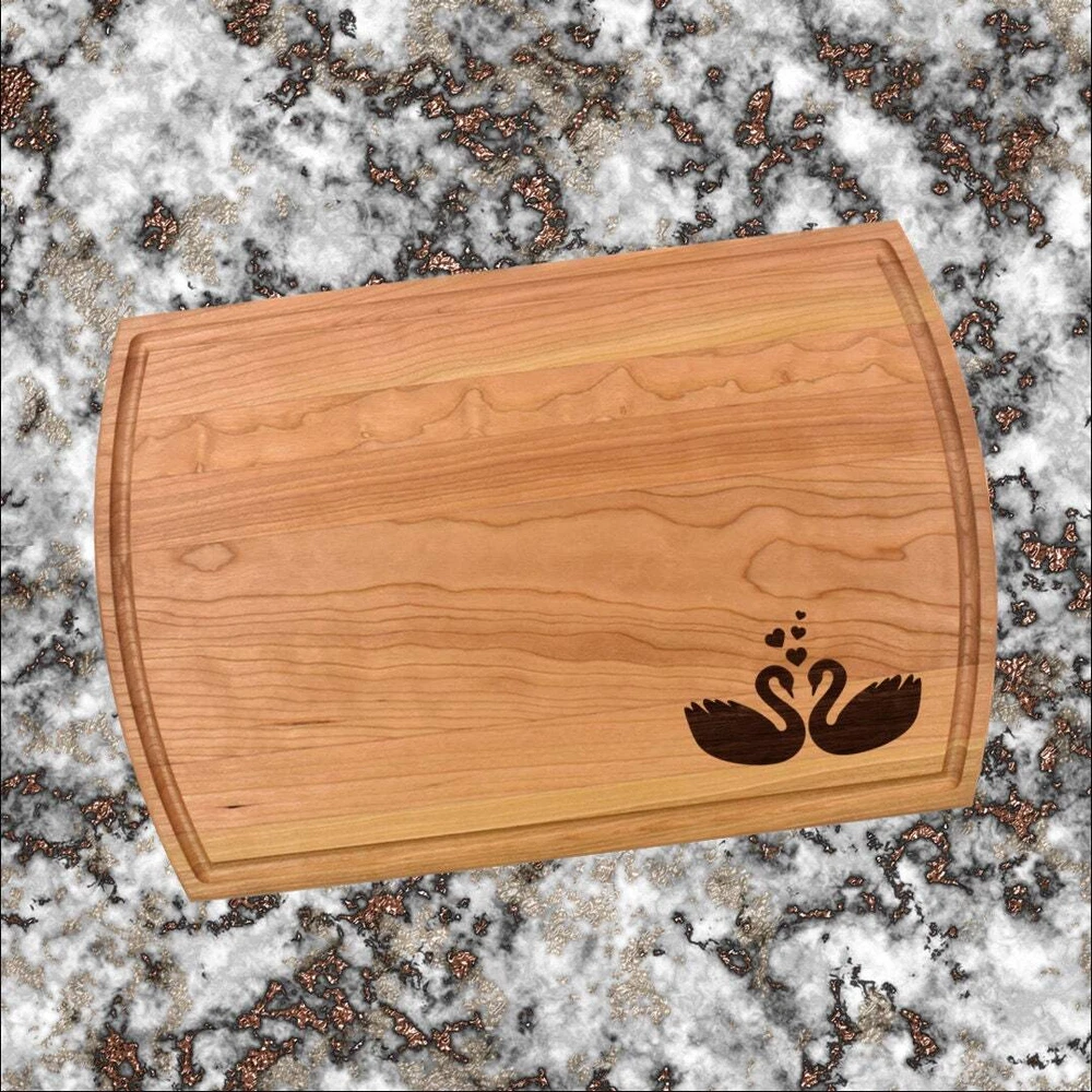 Design: Personalized Swan Cutting Board or Charcuterie Serving Tray All items ship via USPS - please make sure your address is correct :-) Whether used as a charcuterie serving tray for snacks or cutting board, our bamboo, walnut and cherry custom boards are the perfect addition for the home and make the perfect gift for your loved one celebrating a birthday, anniversary, new home, wedding, etc! *** FEATURES *** • SIZES: We have multiple styles and sizes available. To see our current sizes available, click the drop-down menu. The photo slide contains a photo showing each side by side. Please note, the board with the juice groove only has the groove on the front side of the board. • THICKNESS: Bamboo Boards - Approximately 1/2" Thick; Walnut & Cherry Boards - Approximately 3/4” Thick • UNIQUE: Every board is unique with the grain and coloring varying throughout - no board is the same! • CARE INSTRUCTIONS: Hand wash only with warm water. Do not soak. Please apply mineral oil throughout the board’s life. • PERSONALIZATION/CUSTIMIZATION: Do you want the text placed differently on the board? Please don’t hesitate to contact us. All personalization notes can be entered in the personalization box when checking out. • SHIPPING: All cutting boards ship within 2 to 5 business days. • WHOLESALE ORDERS: Please don’t hesitate to contact us for information about wholesale orders. Processing times for larger orders may change. • NOTE: Colors can vary a bit on different monitors and screens. Any props included in photos are not included. Please be sure to double-check your address to make sure it is accurate for USPS delivery. If a package is returned to us due to an invalid address, the buyer is responsible for all additional shipping charges. We appreciate you supporting small business – best wishes! For items ordered with simple edits, we do not send proofs since the layout doesn't change from the example(s). However, in the event there are requests that change the layout from the example(s), we do send proofs for approval before making the product. If you'd like a proof before we make the product, please note so in the personalization box.