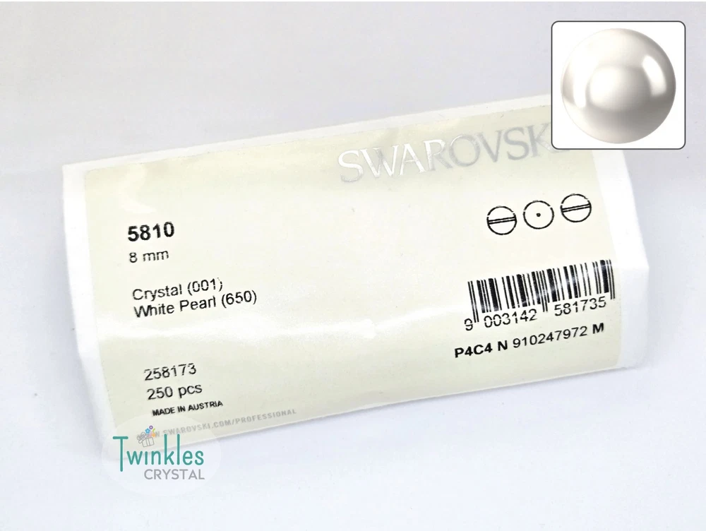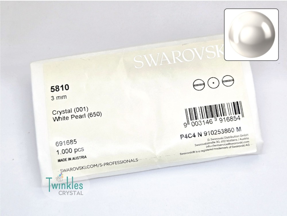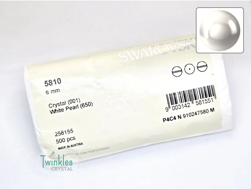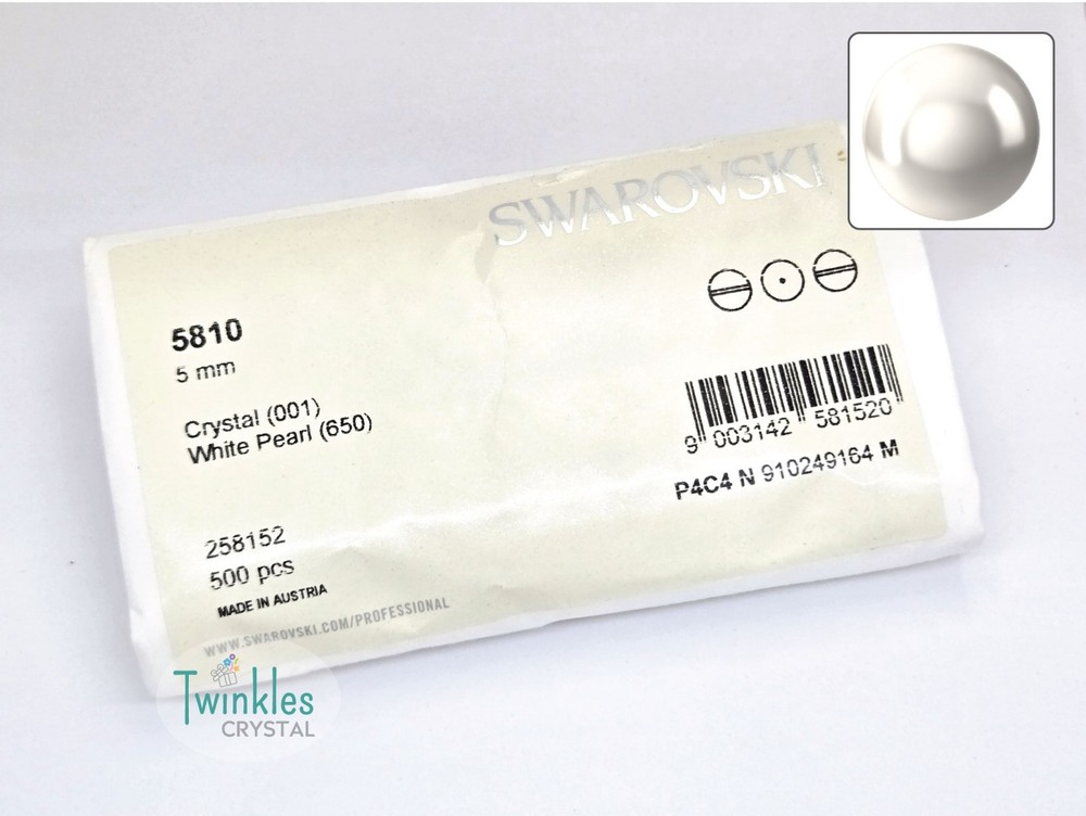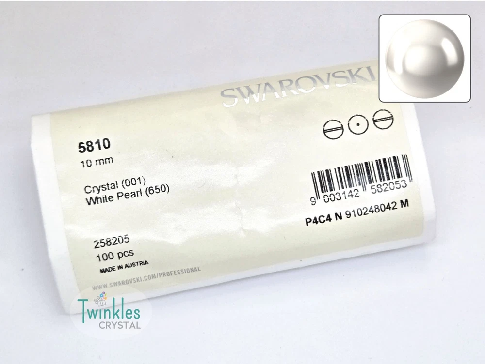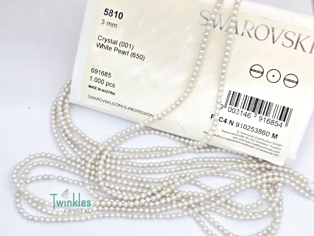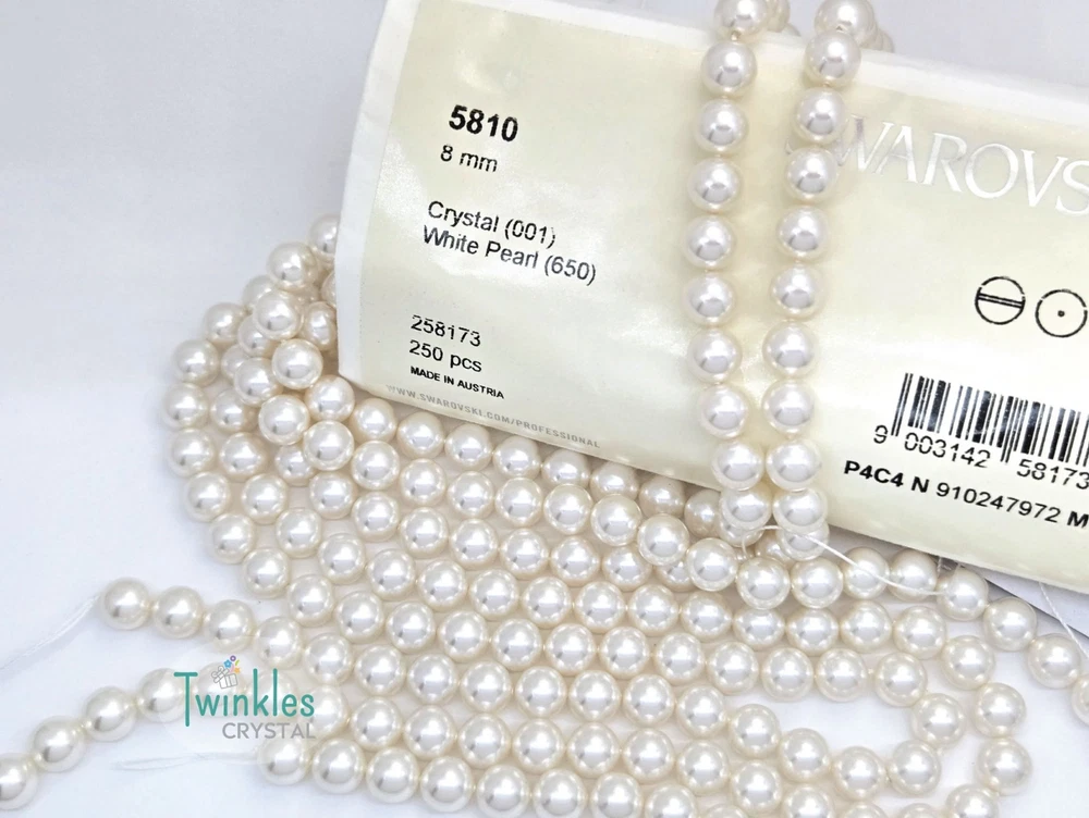 Swarovski Crystal Pearl Item No: 5810 Color: White Item Name: Swarovski Round Pearl Condition: Brand New Brand : Swarovski Shape : Round Made in Austria Weight: 10 - 220grams Factory Pack Q'ty Bead Hole ================================= 3mm 1000 pcs 0.6 mm 4mm 500 pcs 0.7 mm 5mm 500 pcs 0.7 mm 6mm 500 pcs 0.8 mm 8mm 250 pcs 0.9 mm 10mm 100 pcs 0.9 mm Free s tandard shipping on any $35 purchase ** We guarantee the style is the same as shown in the pictures ** We accept returns within 30 days in original condition