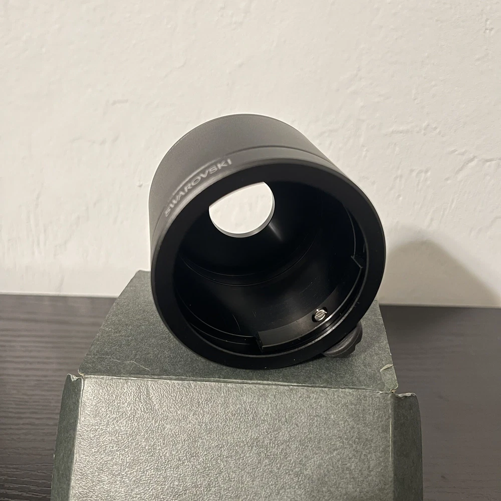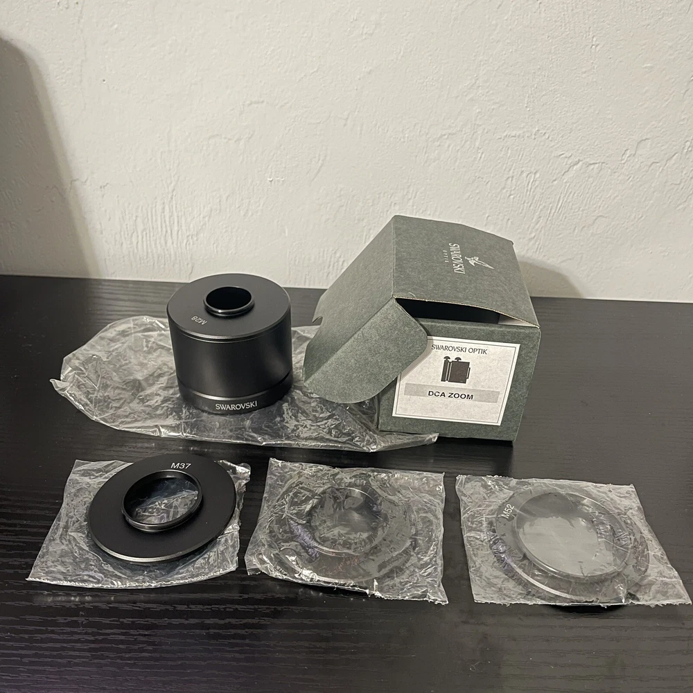 NEW open box // box of was opened but has original packaging & has never been used. NO MANUAL. - Fits Cameras with 28/37/43/52mm Filters - Useable with SLRs with 50mm Lenses The Swarovski DCA Digiscoping Adapter allows you to digiscope with your Swarovski spotting scope, using either a digital point and shoot camera with a 28mm, 37mm, 43mm or 52mm filter specification or an SLR camera and a 30-50mm lens with 52mm filters. In both cases, you capture images through the spotting scope's eyepiece. In addition to the specified filter sizes, you can also use step-up rings and even step-down rings to adapt your lens' filter size to 28/37/43/52mm.