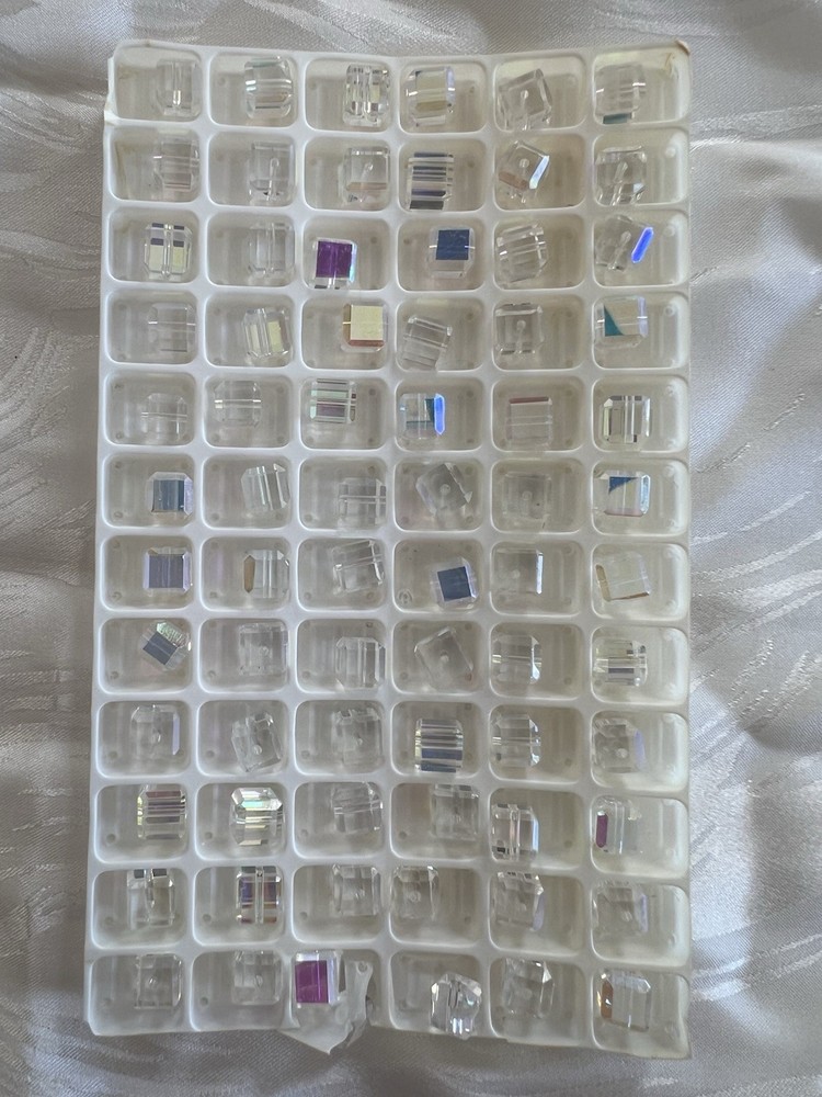 The product is a set of Swarovski faceted cube beads in a 6mm size, featuring a Crystal AB color. These beads are made of crystal and are not handmade. They are designed in a faceted style, adding a touch of sparkle and brilliance to any jewelry or craft project. The high-quality Swarovski brand ensures that these beads are not only stylish but also durable and long-lasting for a beautiful finish in various creative endeavors. 36 pcs. $30.00 Shipped loose in poly bag