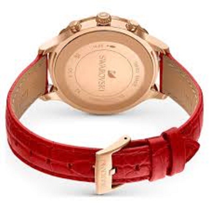 Swarovski Crystal Gifts ! Swarovski Octea Lux Chrono Rose Gold Quartz Red Watch with Leather Strap, Crystals, Swiss Made Octea Lux Crystal Watch Collection, Red Model # 5646975 Brand New in Swarovski Case Will come Gift Boxed Our bestselling Octea watch collection reaches new levels of precision and craftsmanship with this luxurious new chronograph watch Perfect for everyday wear, it features a stopwatch function with accumulated and interval timing The case is worked in rose gold-tone coated stainless steel, while the faceted crystal bezel exclusive to Swarovski watches, sunray dial, and crocodile-embossed genuine leather strap, all shine in emerald red tones. Case: 39 mm, water resistant to 50 m Our bestselling Octea watch collection reaches new levels of precision and craftsmanship with this luxurious new chronograph watch. Perfect for everyday wear, it features a stopwatch function with accumulated and interval timing. The case is worked in rose gold-tone coated stainless steel, while the faceted crystal bezel exclusive to Swarovski watches, sunray dial, and crocodile-embossed genuine leather strap all shine in emerald red tones Case size: 1 1/2 inches; Watch strap length: 7 1/2 inches; Swiss Made
