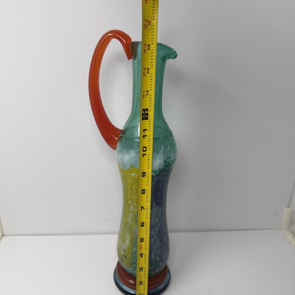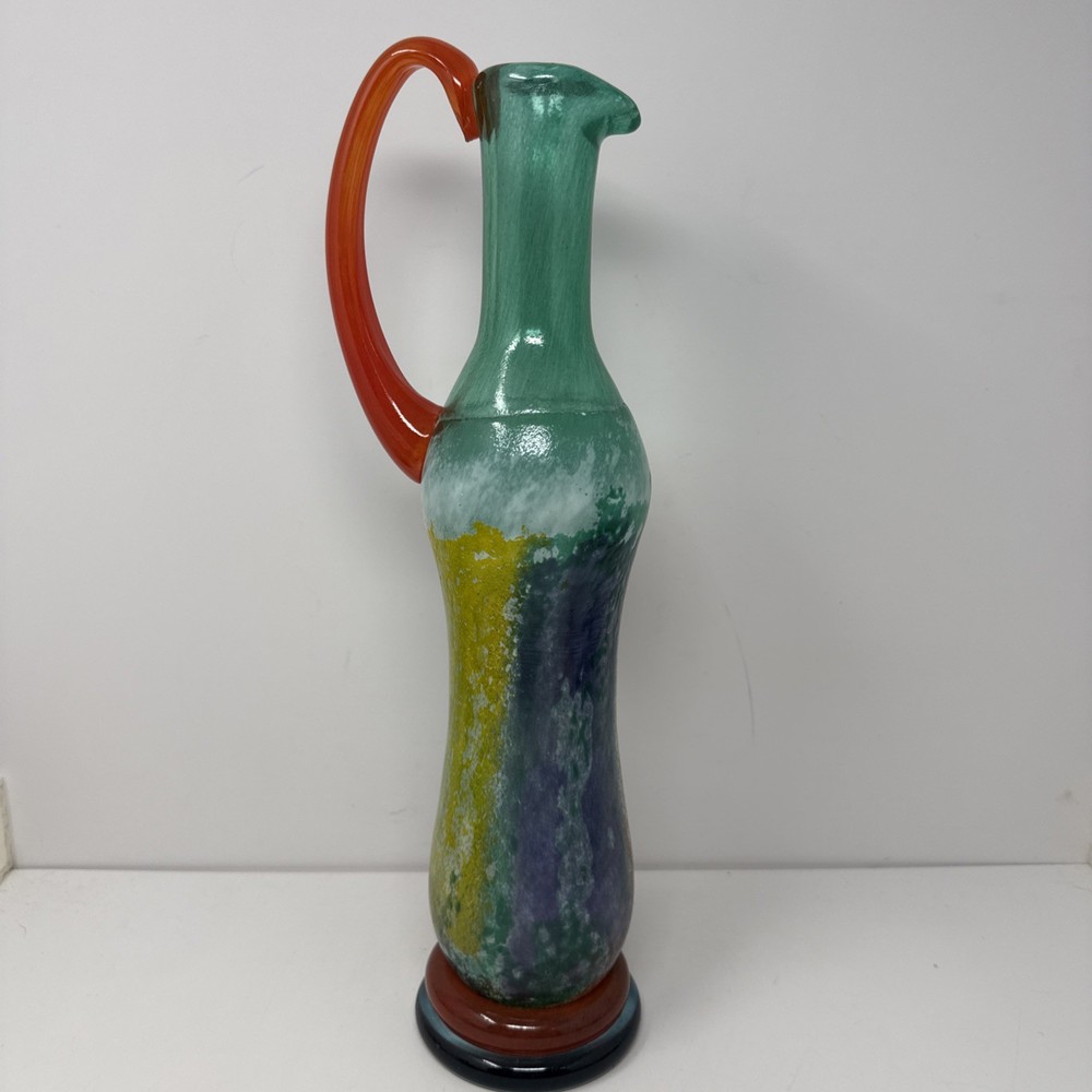 The Sweden Kosta Boda art glass Kjell Engman Wedding CanCan Wedding Jug is a stunning 16-inch pitcher that showcases the contemporary style and art glass production techniques of Swedish craftsmanship. Hand-blown from glossy multicolor glass, this original vintage piece from the 1980s exudes a festive and elegant charm perfect for any wedding or special occasion. With its unique design and high-quality material, this pitcher adds a touch of sophistication and creativity to any collection or table setting. Beautiful piece and very well made. Weighs almost 5 pounds. Please refer to photos for best idea of style and condition!