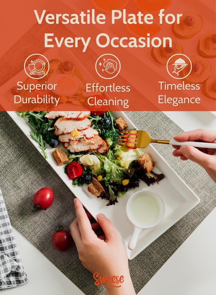 Attractive Design 1. Rectangular tray design makes it stable and outstanding from others. 2. The plates have a lip all around the edge to prevent food runaway. 3. White color - White color can go with any decoration, very elegant. Idea for tea party or daily use. Practical Serving Trays Great for holidays, entertaining, birthday party, tea party or everyday use. It is a practical cupcake stand to hold small desserts such as sliced cake, cookies and fruits. You could have it on your breakfast table and put all kinds of fruits so that kids can just grab them and eat them instead of opting for junk food. Dimensions Diameter of Platter: bottom tier - 12.9 inch, top tier - 13.8 inch. Will hold 12-14 cupcakes or lots of finger foods. Best Gift Option It is packaged well in a gift box, a great gift for Christmas, Birthday, Wedding Party, or just without any special reason. Why PORCELAIN? Porcelain is made from kaolin clay. It is fired at temperatures in excess of 1,300 degrees Celsius and is fully vitrified, which makes it much sturdy than stoneware. Porcelain is generally white, gray or cream colored. It is smooth with a more delicate appearance. Porcelain ware is resistant to chip and get stain, dishwasher and oven safe. Without containing any chemical, they are non-toxic, healthier than other materials. PRO-GRADE PORCELAIN & SAFE FOR DISHWASHER, MICROWAVE AND FREEZER - The Rectangular tray is made of durable porcelain, a type of premium LEAD-FREE ceramic, chip-resistant and more sturdy than stoneware. FUNCTIONAL & STYLISH DESIGN - Rectangular tray design makes it stable and outstanding from others. The plates have a lip all around the edge to prevent food runaway. The white color fits all decorations and is a timeless classic. LARGE FOR VARIOUS FOOD -The plate is large for displaying a lot of desserts such as cupcakes, cake, cookies, fruit, vegetables and other pastries. Ideal for party, gathering or daily use. WIDE APPLICATION - Perfect tableware for party like birthday party, baby shower, Christmas, tea party, celebration or any other activities decoration. And also great for catering, outdoor picnic, BBQ and simply just eating at home. DIAMETER OF PLATTER - The size is 13.8 x 5.7 x 0.8 inches. Will hold 12-14 cupcakes or lots of finger foods.