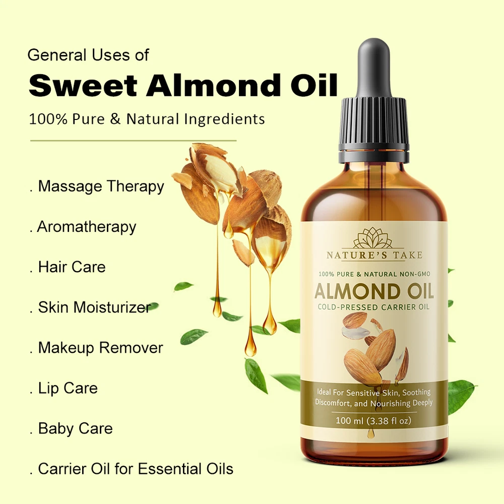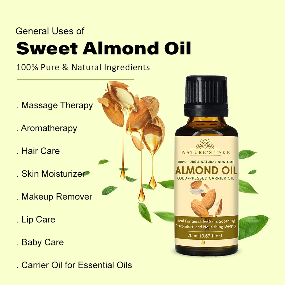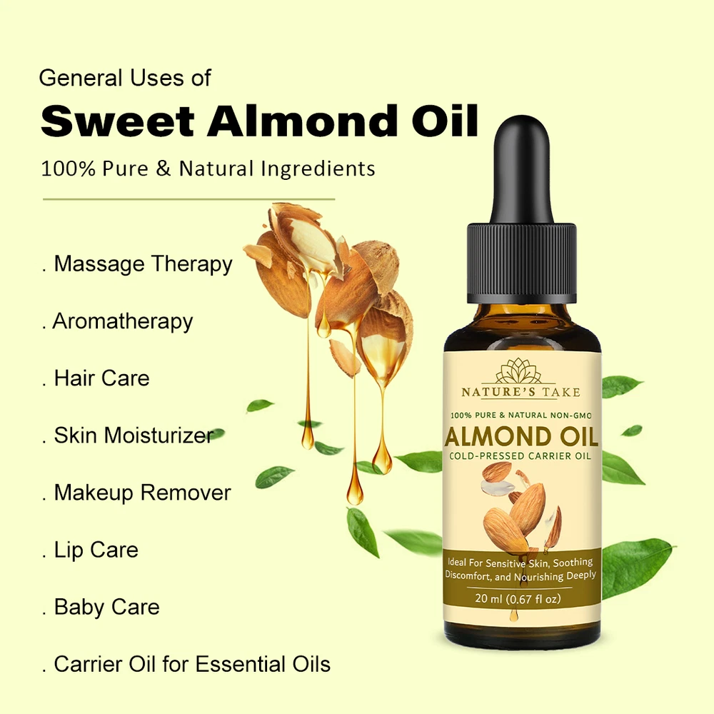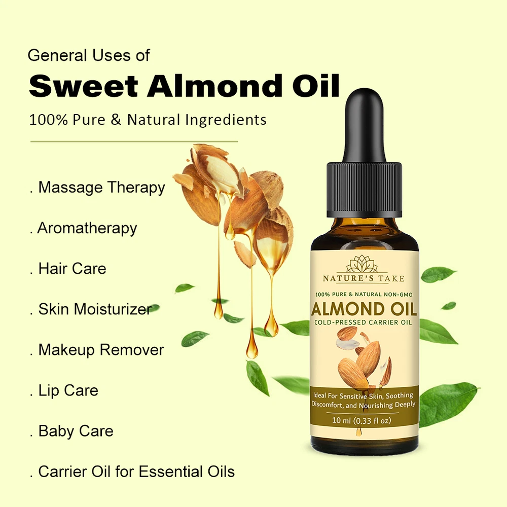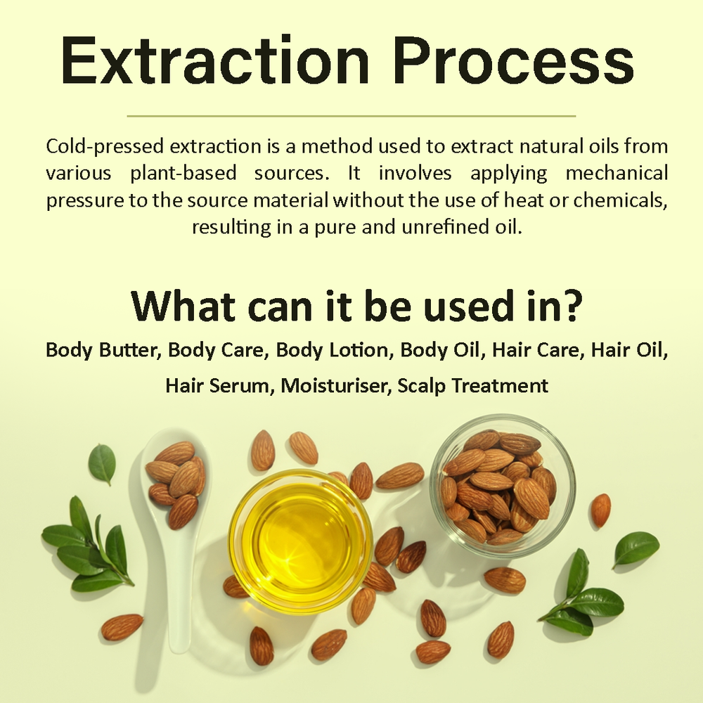 Natural Almond Carrier Oil | Cold-Pressed | Organic | eBay UK Organic Almond Carrier Oil Cold-pressed from premium almonds for natural general skincare and haircare applications. Organic Certified Vegan Friendly Chemical Free Cold Extracted Non-GMO Pure Plant-Based General Characteristics Careful Cold Processing The oil is extracted through a method that avoids high temperatures, which is important for preserving the inherent qualities and natural structure of the almond oil. This careful processing helps to retain the components that make it a sought-after carrier oil. Subtle and Light Feel Almond carrier oil is known for its delicate and non-overpowering texture. When applied to the skin, it tends to be absorbed relatively quickly without leaving a significant greasy or heavy sensation, making it a comfortable option for various uses. Naturally Occurring Components This oil naturally contains certain components, including a form of vitamin E and various fatty acids. These are inherent to the almond from which the oil is derived and contribute to the overall characteristics of the carrier oil. Production with Environmental Awareness The sourcing and production of this almond carrier oil are carried out with attention to ecological practices, aiming to minimize any adverse effects on the environment. This reflects a commitment to responsible and sustainable methods. General Benefits & Common Applications General Skin Conditioning Almond carrier oil is often used to help the skin feel softer and more supple with regular application. Its properties can contribute to the overall feel and appearance of the skin's surface. General Hair Nourishment When applied to hair, almond carrier oil can contribute to the general health and feel of the hair strands and the scalp. It is sometimes used as a component in hair care routines. Foundation for Aromatherapy As a carrier oil, almond oil serves as a suitable base for diluting essential oils, allowing for their safe application in aromatherapy practices. It helps to disperse the essential oils over a larger area. Common Massage Medium The texture of almond carrier oil makes it a common choice for massage, providing a smooth surface that allows for ease of movement and general skin conditioning during the massage process. Ingredient in DIY Preparations Almond carrier oil is frequently incorporated into homemade personal care recipes, such as lotions, balms, and other skin or hair-related preparations, due to its general compatibility with other ingredients. Maintained Freshness Over Time When stored under appropriate conditions, this almond carrier oil is expected to maintain its general quality for a considerable period, making it a practical choice for ongoing use. General Usage Suggestions For General Facial Care A small quantity can be gently applied to the face as part of a general skincare routine. For General Hair Care The oil can be applied to the hair and scalp as a conditioning step in a hair care regimen. For Diluting Aromatherapy Oils Almond oil can be used to dilute essential oils to the desired concentration for general aromatherapy use. General Safety Information For external use only. Keep away from children. Avoid direct contact with eyes. Discontinue use if any general skin response occurs. Store in a cool, dark place. General Skin Patch Advice: It is always a good practice to test on a small skin area first. General Inquiries Is this almond oil generally suitable for various skin types? Almond oil is often considered to be generally compatible with many skin types. Is delivery generally available across the UK? Yes, delivery services are typically available throughout the United Kingdom, including options for free shipping. What is the general policy on returns? Generally, unopened products can be considered for return within a specified period. What are the general storage recommendations for this oil? It is generally advised to store the oil in a cool environment, away from direct light sources. Explore Natural Applications Discover the general uses of our premium almond carrier oil with convenient UK delivery options. Explore Options
