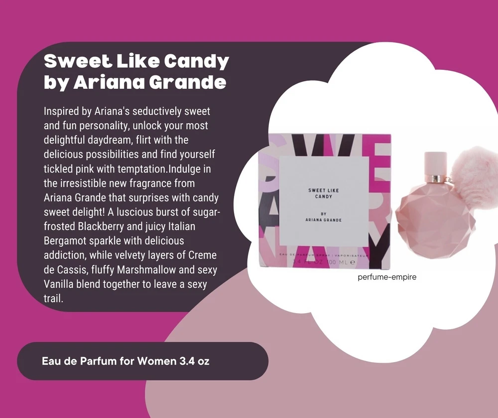 Home Perfume for Her Perfume for Him Unisex Testers for Her Testers for Him Kids MENU Store Pages Home View All Listings About Us Shipping Orders and Returns FAQ Contact Us Store Categories Perfume for Her Perfume for Him Unisex Testers for Her Testers for Him Kids Sweet Like Candy by Ariana Grande perfume 3.3 / 3.4 oz edp New in Box Inspired by Ariana's seductively sweet and fun personality, unlock your most delightful daydream, flirt with the delicious possibilities and find yourself tickled pink with temptation.Indulge in the irresistible new fragrance from Ariana Grande that surprises with candy sweet delight! A luscious burst of sugar-frosted Blackberry and juicy Italian Bergamot sparkle with delicious addiction, while velvety layers of Creme de Cassis, fluffy Marshmallow and sexy Vanilla blend together to leave a sexy trail. BRAND: Ariana Grande FRAGRANCE NAME: Sweet Like Candy by Ariana Grande perfume 3.3 / 3.4 oz edp New in Box SIZE: 3.4 fl oz CONCENTRATION: Eau de Perfume FORM: Spray CONDITION: New GENDER: Women PACKAGE TYPE: New Retail Box - Package Type - RETAIL BOX? This item comes in brand new manufacturer retail packaging, same as what is found in a retail store. unused, unopened, undamaged item. SHIPPING We ship all orders the same day or next business day. Once an order is shipped, we will email you a tracking number. We ship to all USA states including Puerto Rico, Hawaii, Alaska, APO/FPO/DPO and selected international destinations. (Please check shipping and handling tab for country specific details) Please make sure you enter the correct shipping address at the checkout. We will not make any changes to the shipping address once you place the order. If any shipment is returned due to an error in the shipping address provided to us or due to package not being claimed by the receiver, we will deduct $6.99 from the purchase price prior to issuing the refund. RETURNS We stand behind every product we sell. If you're not pleased with your purchase, we'll be happy to make an exchange or a refund of the product price less Shipping & handling within 30 days of receipt of your purchase. For any exchange or refund, we need the original receipt or a record of the purchase in our system, and the product must be in its original condition, including the box, UPC bar code, packaging, and all accessories. Please contact us before returning an item to get a RMA number. Any return without a RMA number will not be accepted or processed. All returns should be accompanied with a tracking or delivery confirmation number back to our warehouse. Shipping and handling charges are non refundable. A 20% restocking fee will be applied to all returns. Due to health precautions, we cannot accept returns on Skincare and Hair care products. Please allow up to 10 business days for returns to be processed.