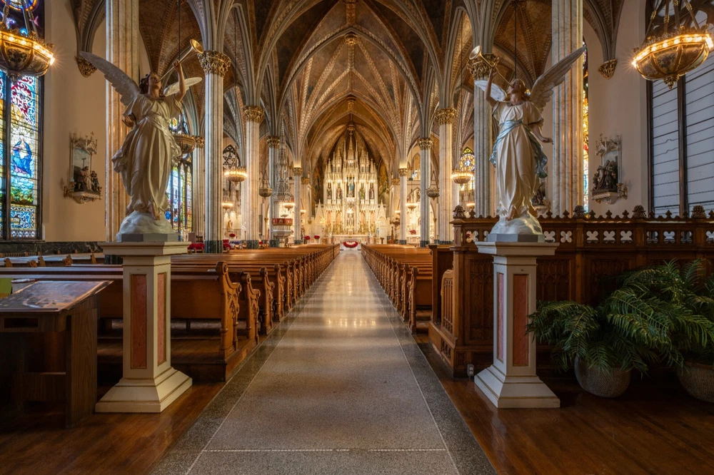 Interior Photograph of the "Sweetest Heart of Mary Roman Catholic Church" located in Detroit, Michigan by J.A. Dunbar Photographed and signed by global photographer J.A. Dunbar. 11 × 17, printed on 100lb photographic fine art paper. (landscape print) Shipped Flat
