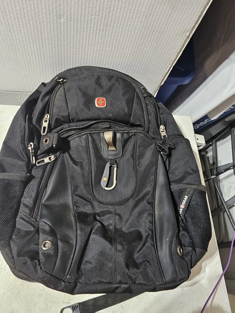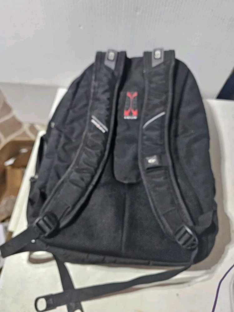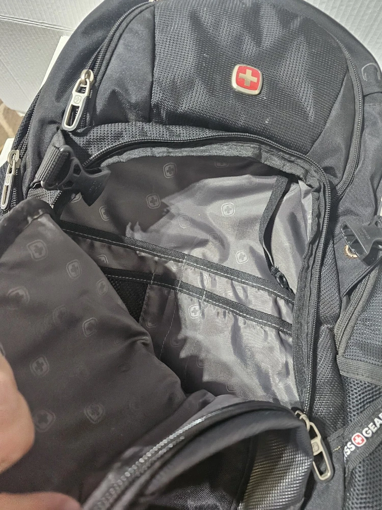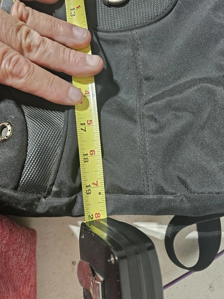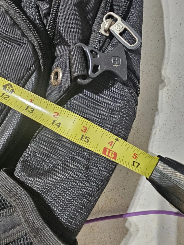 20 inches by 16 inches wide In very good condition. Slight wear under shoulder strap. See pictures please. Has a lot of pockets and a laptop section. All zippers work great. Very nice feeling backpack. Has a pocket for headphones and a space for sunglasses