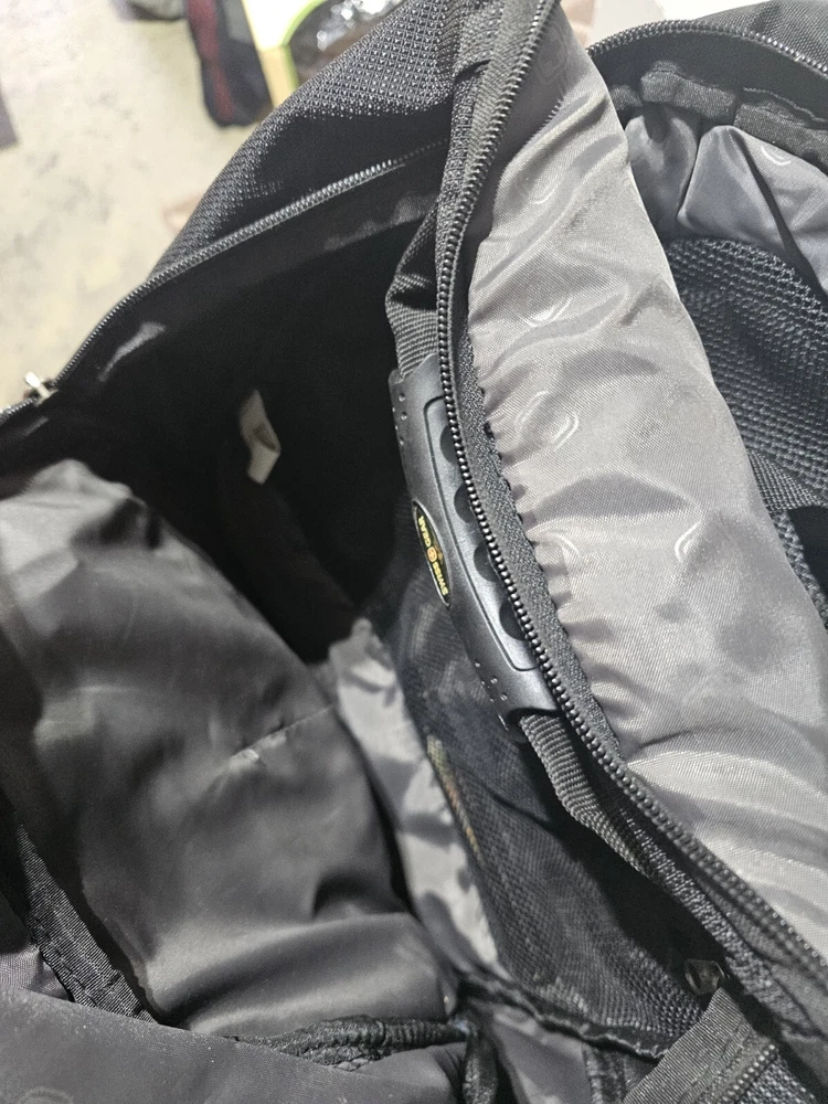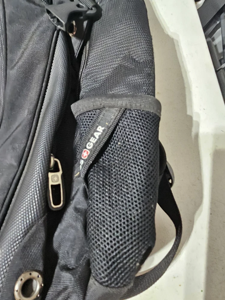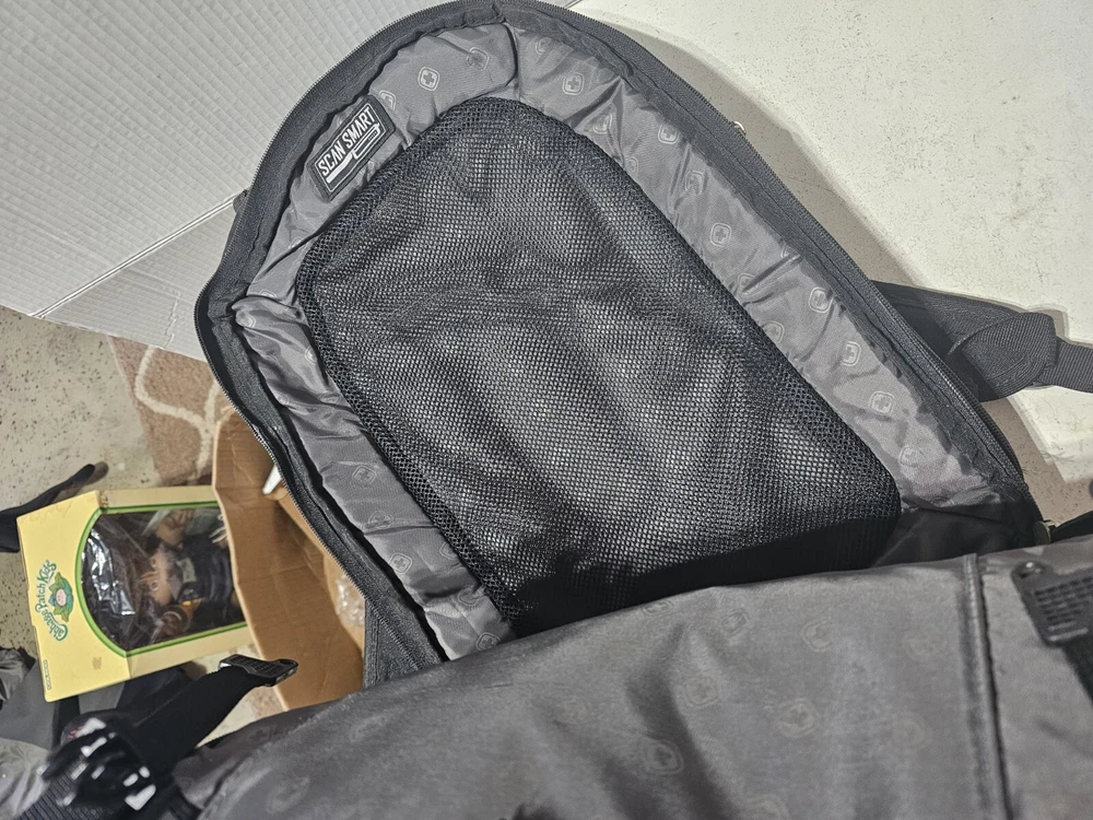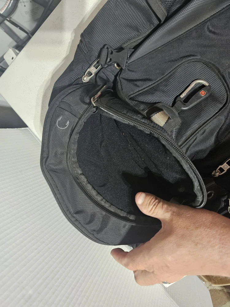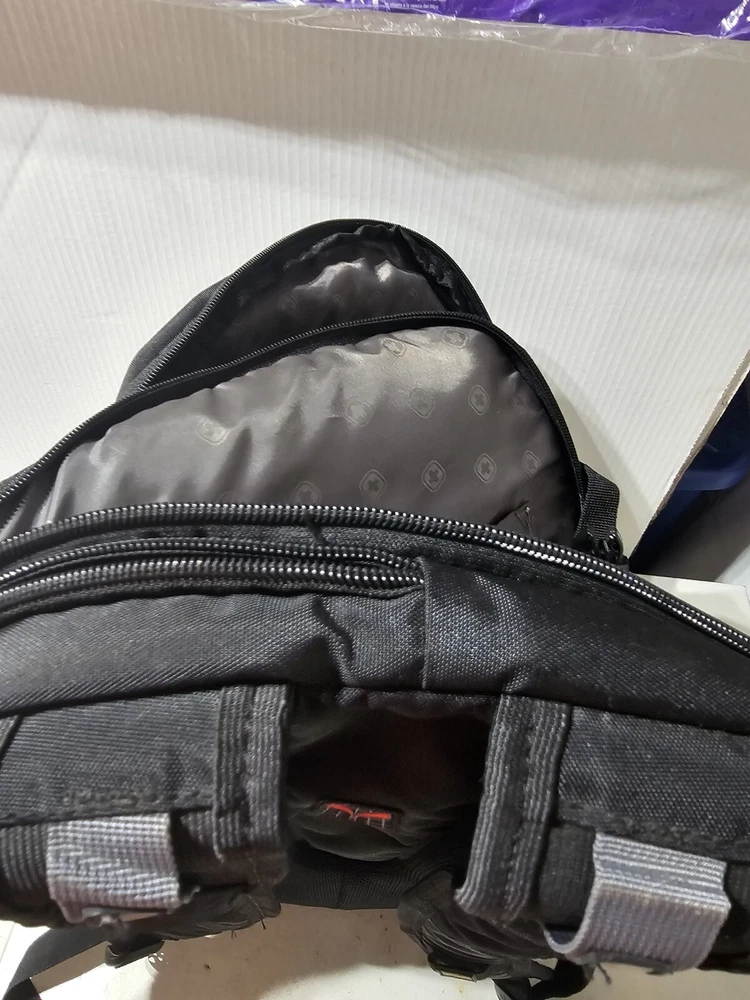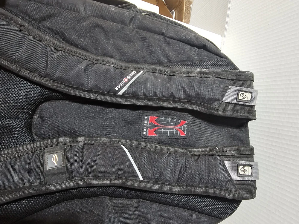 20 inches by 16 inches wide In very good condition. Slight wear under shoulder strap. See pictures please. Has a lot of pockets and a laptop section. All zippers work great. Very nice feeling backpack. Has a pocket for headphones and a space for sunglasses