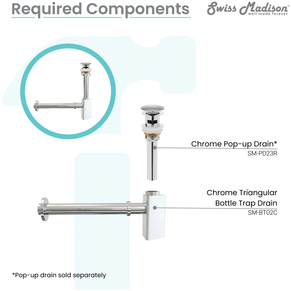 Powered by Frooition All Categories Swiss Madison SM-BT02 1-1/4" Triangular Drain Assemblies - Less Overflow Overview Item Description The Swiss Madison Bottle Trap Drain provides an alternative to the traditional P-trap option, providing a more decorative solution to any bathroom with exposed plumbing. The smooth interior ensures there won’t be any unwanted odors or build-up. The bottle trap drain provides adaptability for any size needed. Swiss Madison SM-BT02 Features: Covered under Swiss Madison's 1 year limited warranty Constructed of brass For use in overflow applications Fits 1-1/4" drainconnections Swiss Madison SM-BT02 Specifications: Height: 5" (top to bottom) Width: 2-3/16" (left to right) Why Choose BuildInc? OUR PROMISE TO YOU About Us At Build, we promise to provide the best selection we can, most competitive pricing, and unmatched customer service. Our store has quality home improvement products from trusted manufacturers like Moen, American Standard, Delta, Kraus, Kichler, Progress Lighting, Schlage, Kwikset, Baldwin, Broan, NuTone, Air King, and Rev-A-Shelf. With over 200,000 home improvement products for you to choose from, we have just what you need to get your project done. Fast & Free Shipping We promise to make it our priority to get you your items as fast as we can. We ship from 440 warehouses around the country, ensuring that your product will get to you as soon as possible. We know you're eager to get your hands on your new purchase, we would be too. As a bonus, most items ship for free. Returns We are happy to accept returns of unused or defective items for a refund within 30 days from the date of delivery. For returns outside 30 days, please contact our Customer Service team to go over our options. For full details, please view the Shipping and Payments tab above. To initiate a return simply go to the eBay Returns Portal and submit a return request. We ask that all items be returned with all original components via a traceable method. Once your return is received and processed, we will quickly get your refund or replacement issued. If for any reason you are unsatisfied with your purchase or for product or warranty questions, please contact Customer Service team for assistance. More Items! View more great items! About Us | Shipping | Returns | Contact Us | FAQ | Collections | Special Offers! Powered by Frooition Frooition Frooition | No-js Template | eBay design, eBay store design, eBay shop design, eBay template design, eBay listing design (ver:froo_no_js) This listing is currently undergoing maintenance, we apologize for any inconvenience caused.
