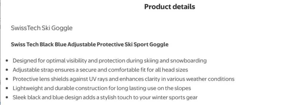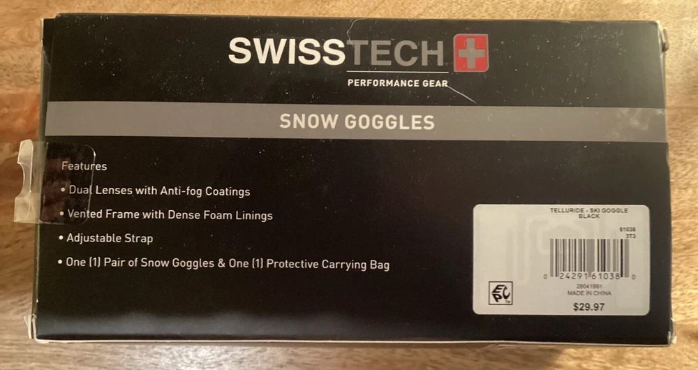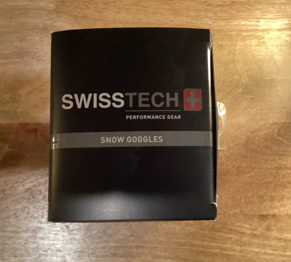 Swiss Tech Performance Gear adult snow goggles. Black telluride ski goggles with dual anti-fog coated lenses and vented frame with dense foam linings. One size with easily adjustable strap. Includes protective carrying bag. Excellent quality. NEW in Box. Removed from box for photos only.